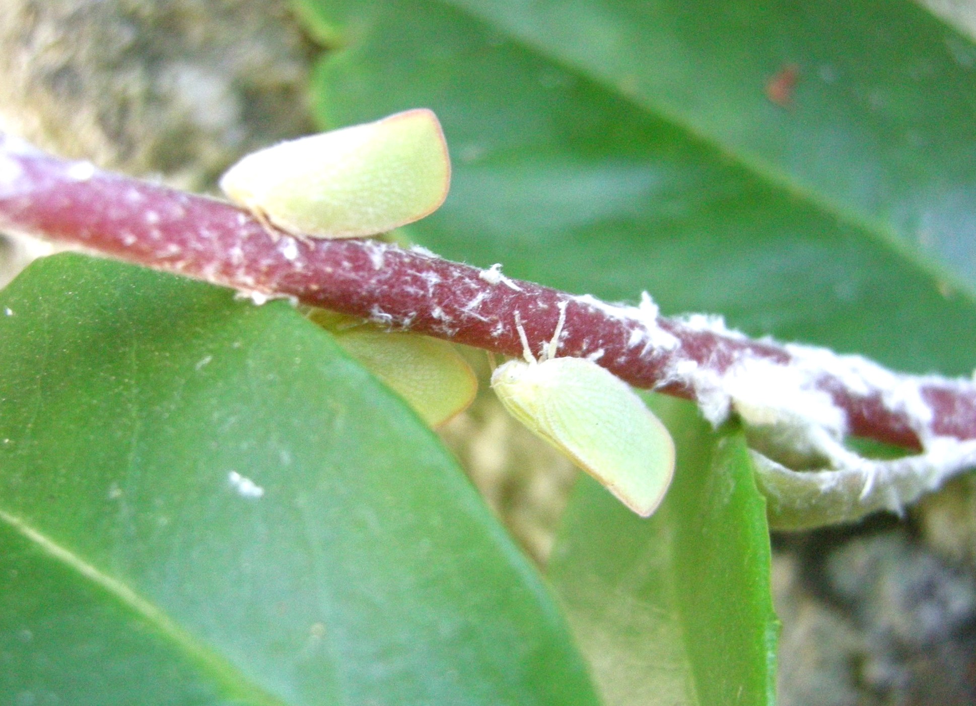 光沢のある常緑の葉はきれいなのですが、サンゴジュハムシという小さな甲虫による食害が目立ちます。また、白い粉のように見えるのはアオバハゴロモという昆虫の幼虫です。
