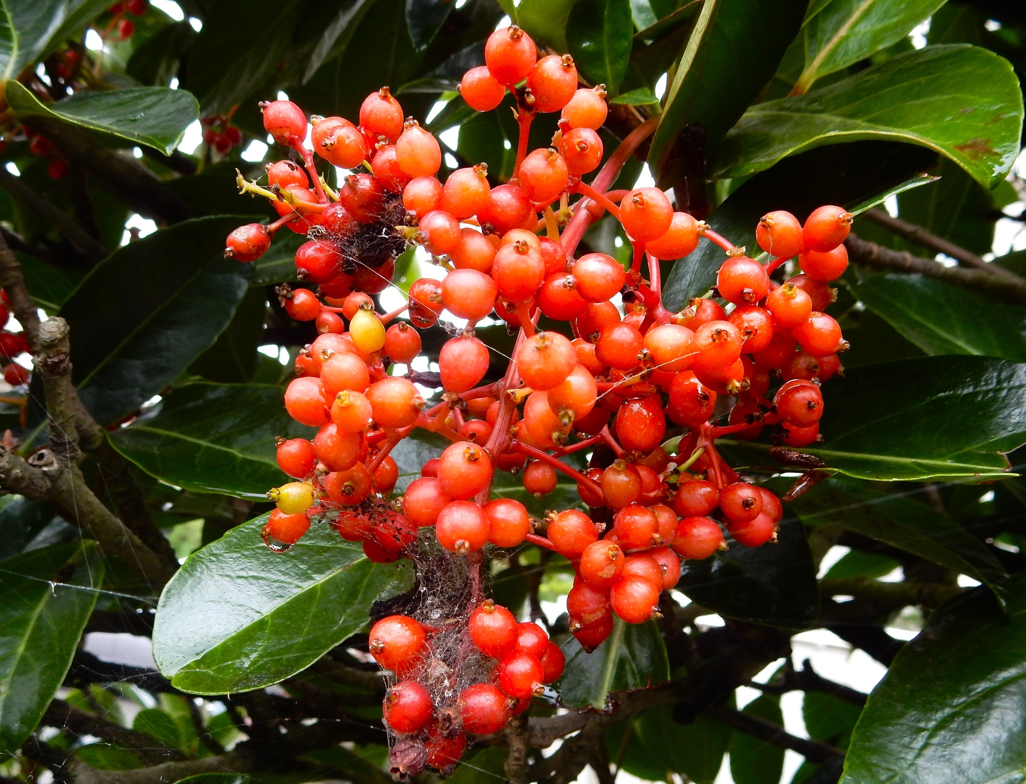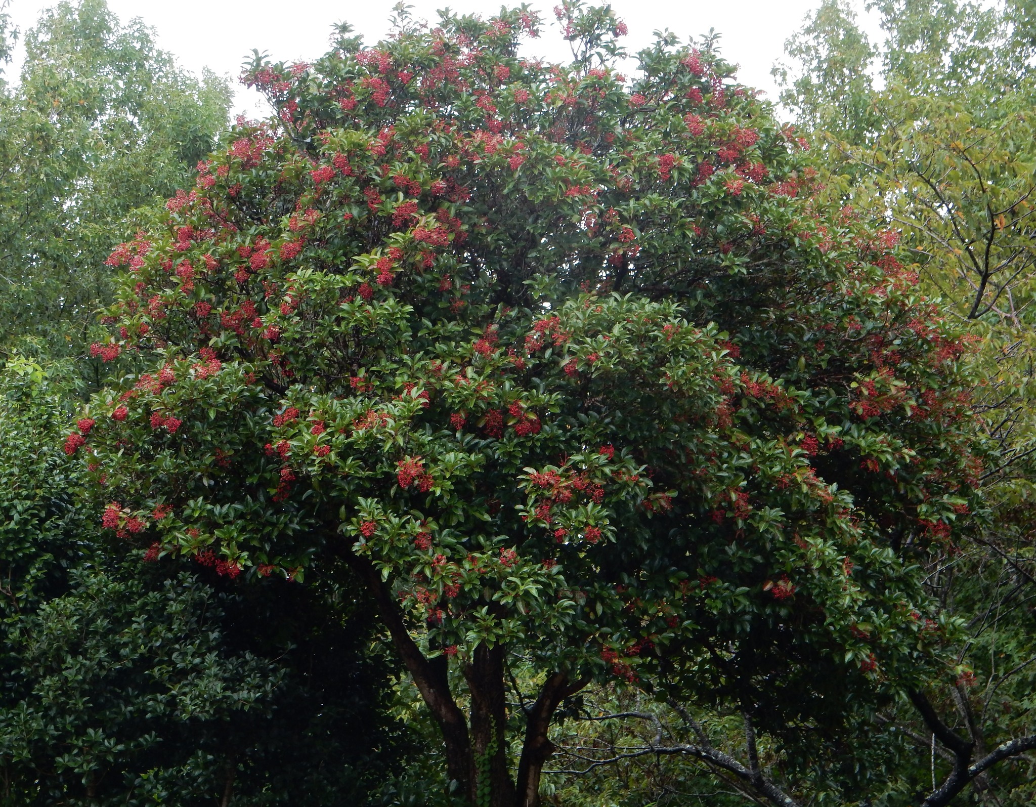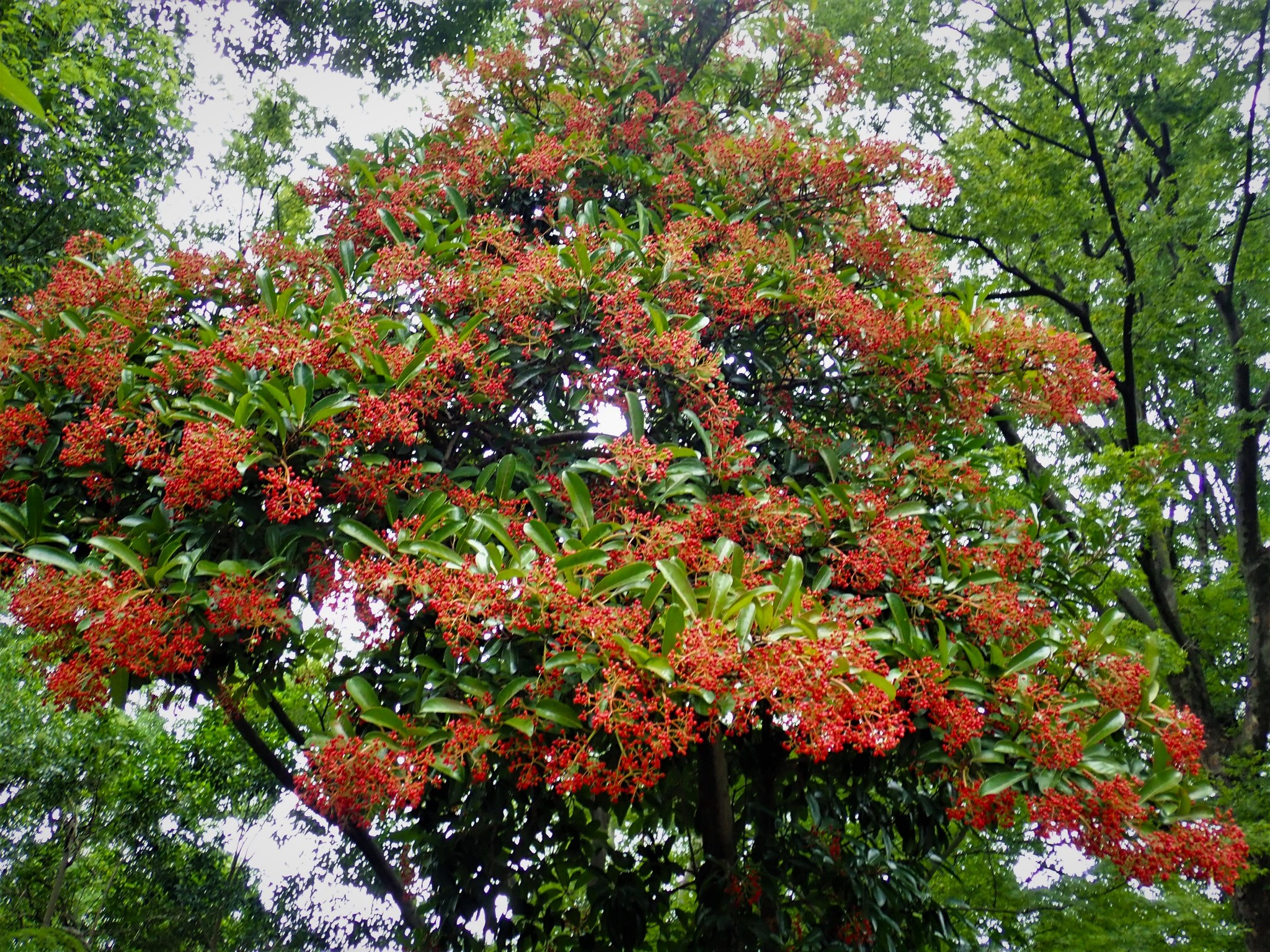 6月頃に咲く白い花はあまり注目されないので、話題になることは少ないのですが、赤く色づく果実は存在感があって、注目されます。