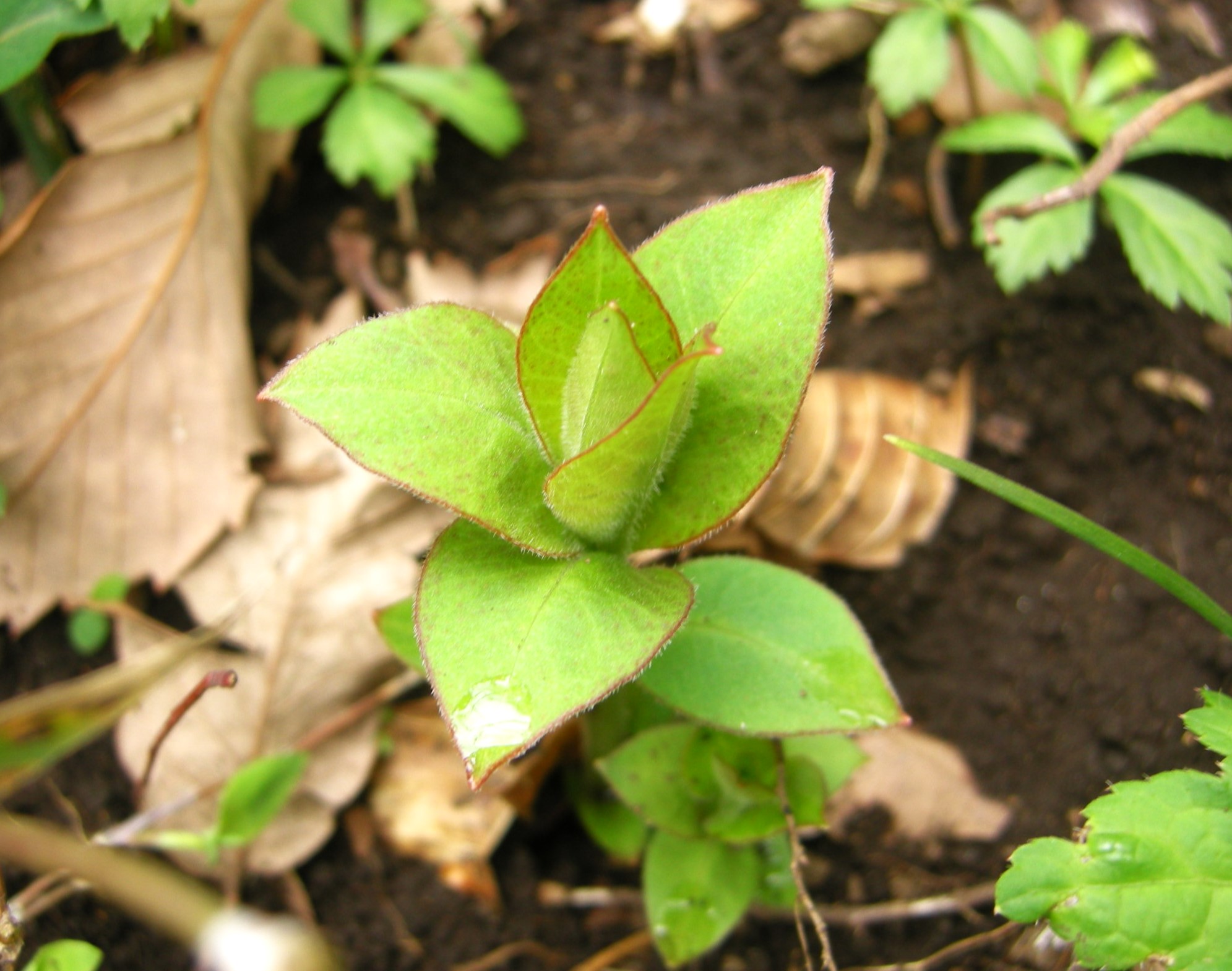 春に発芽したころの葉は葉縁が赤味を帯びていて、全草に生える毛が目立ちます。