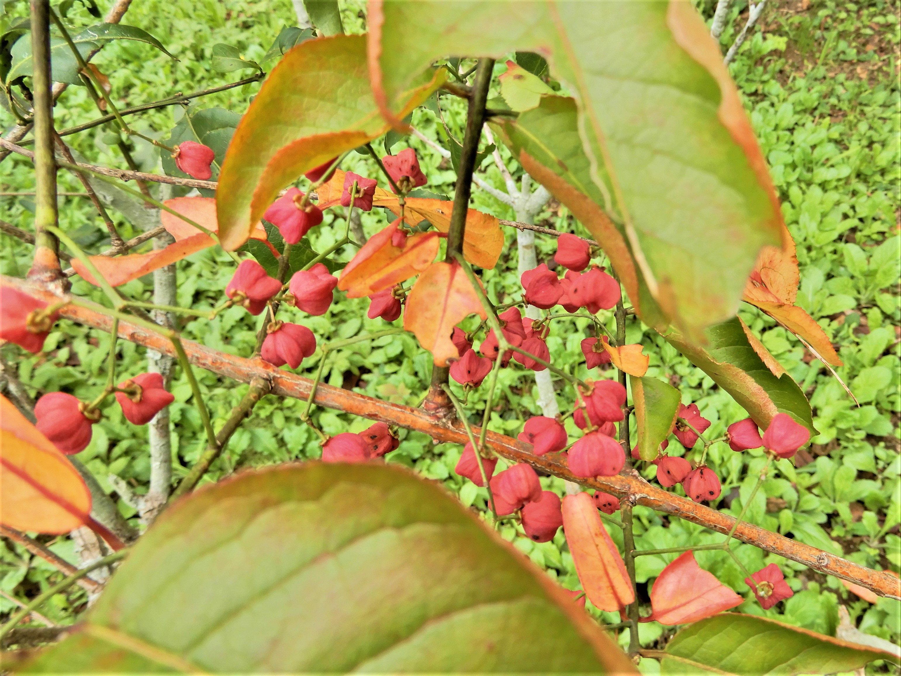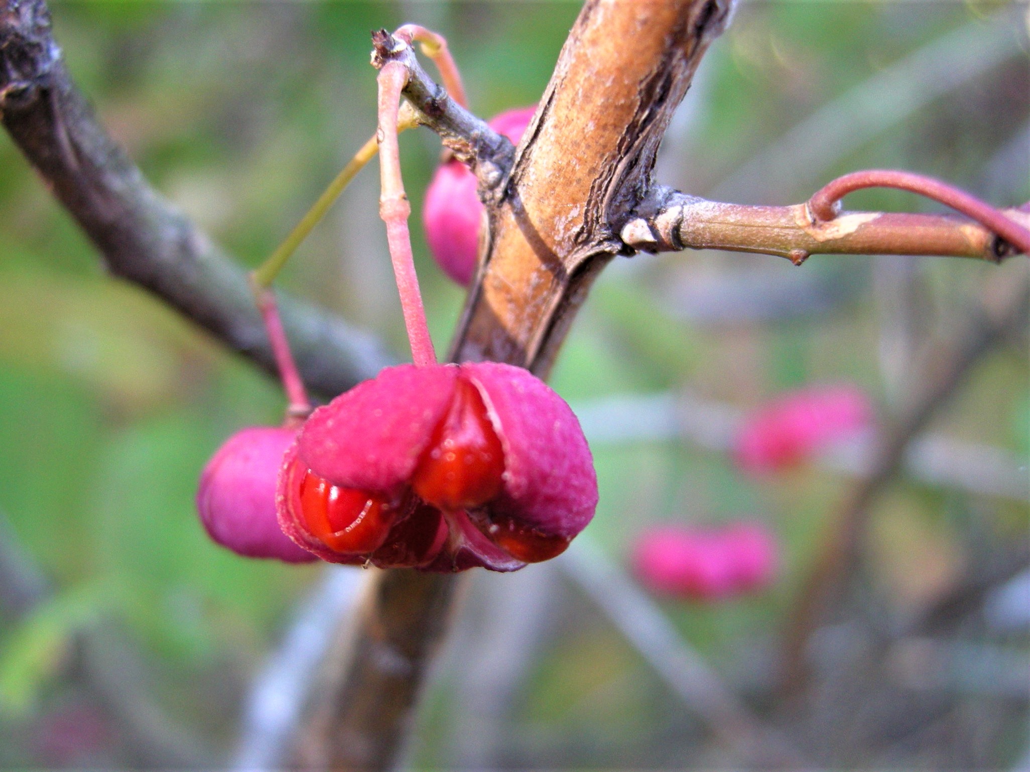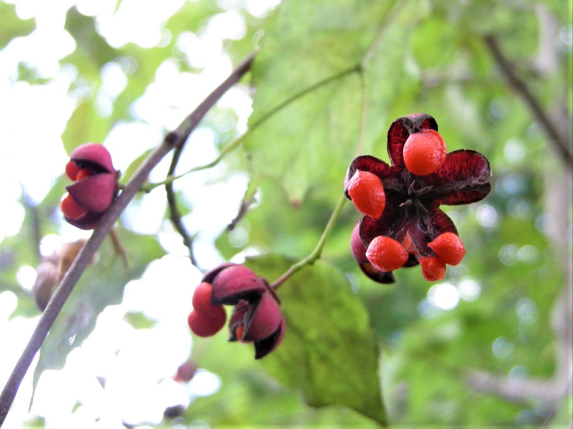 雌雄異株です。春に咲いた雌花は夏に角張った実をつけます。緑色から秋にピンク色になり、四裂して赤い種子が飛び出します。種子は少量でも吐き気や下痢を起こしますので、くれぐれも口に入れないように、注意が必要です。