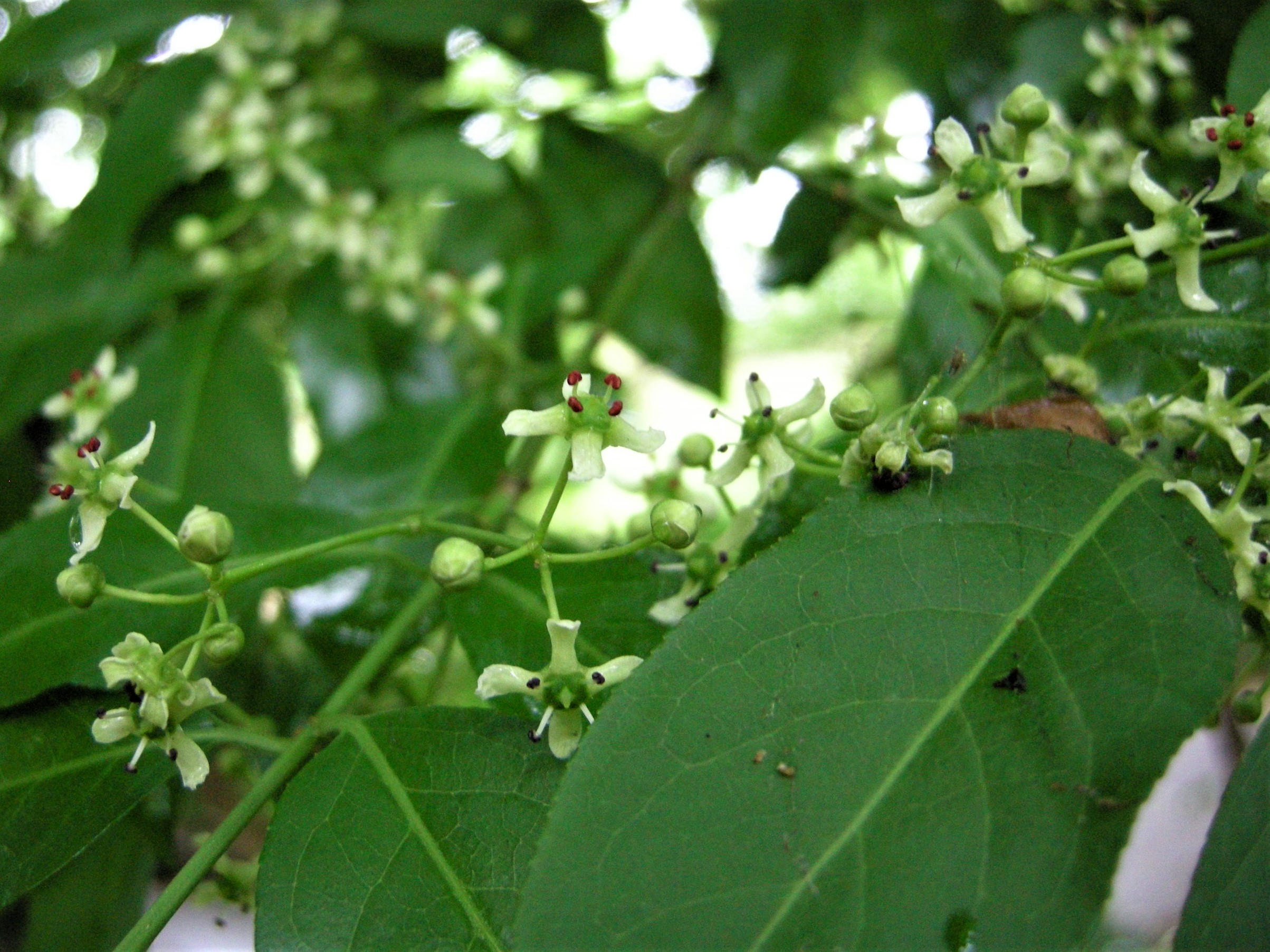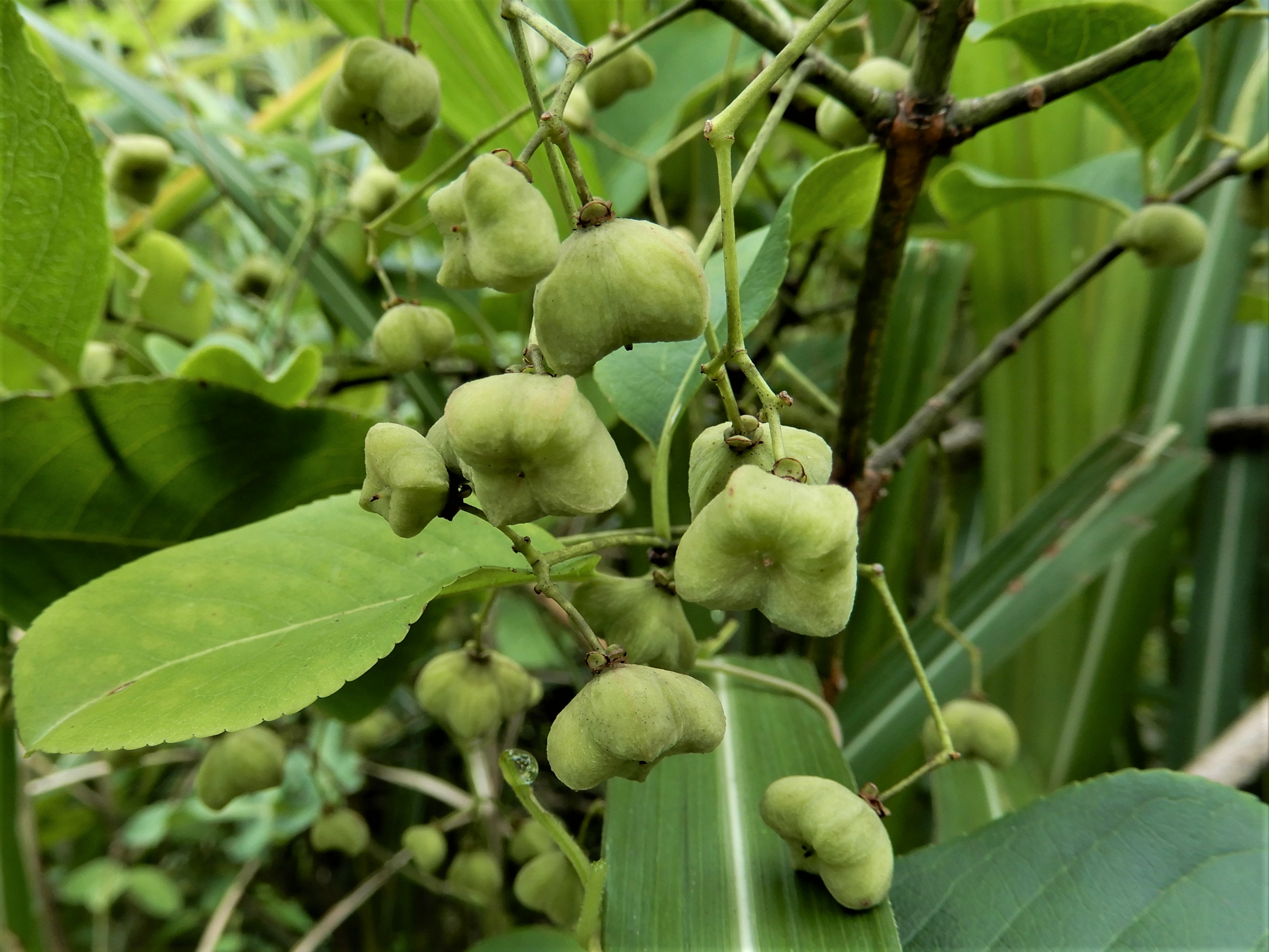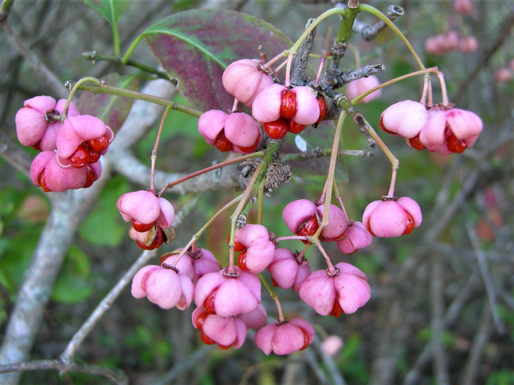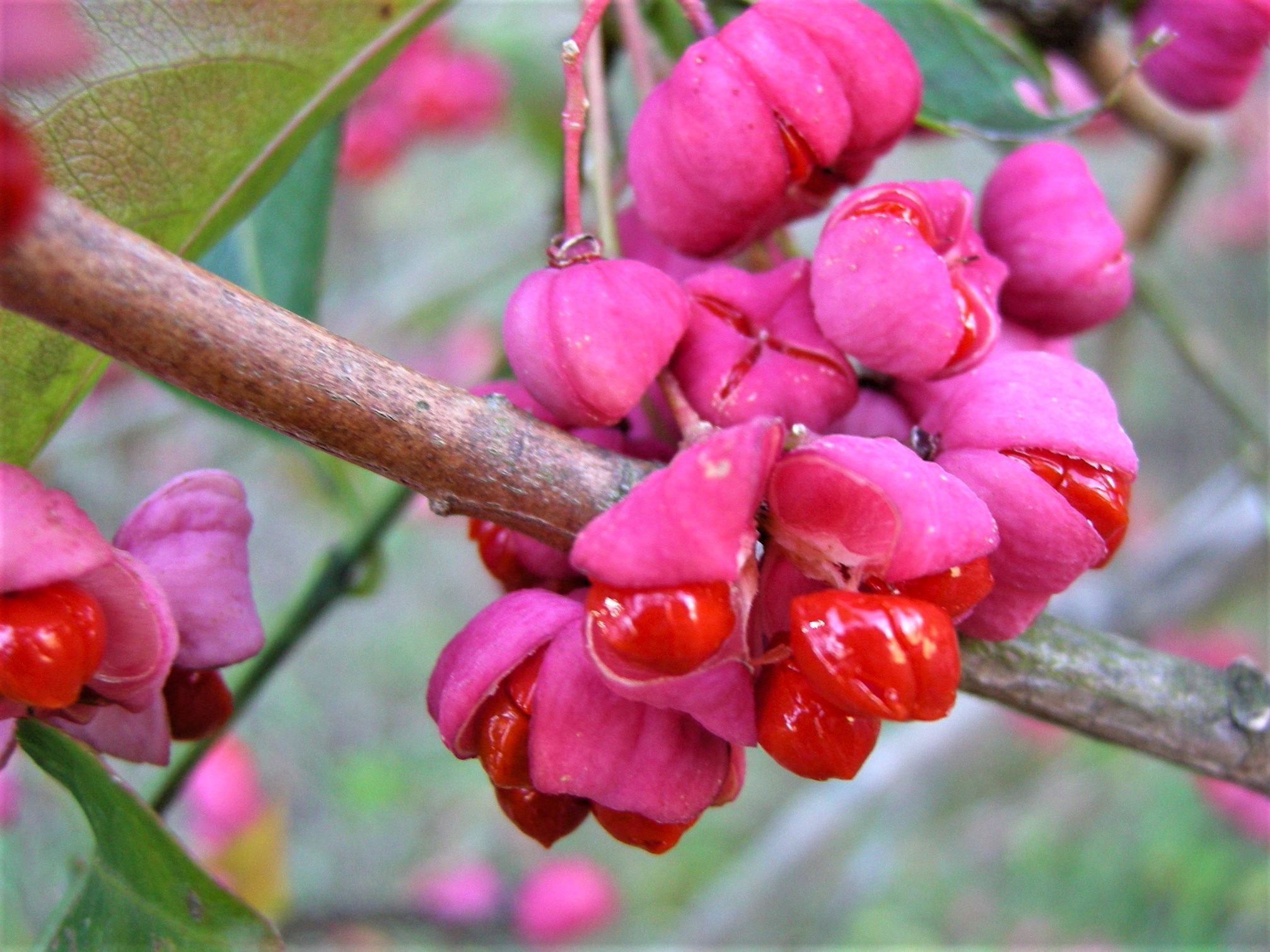 雌雄異株です。春に咲いた雌花は夏に角張った実をつけます。緑色から秋にピンク色になり、四裂して赤い種子が飛び出します。種子は少量でも吐き気や下痢を起こしますので、くれぐれも口に入れないように、注意が必要です。