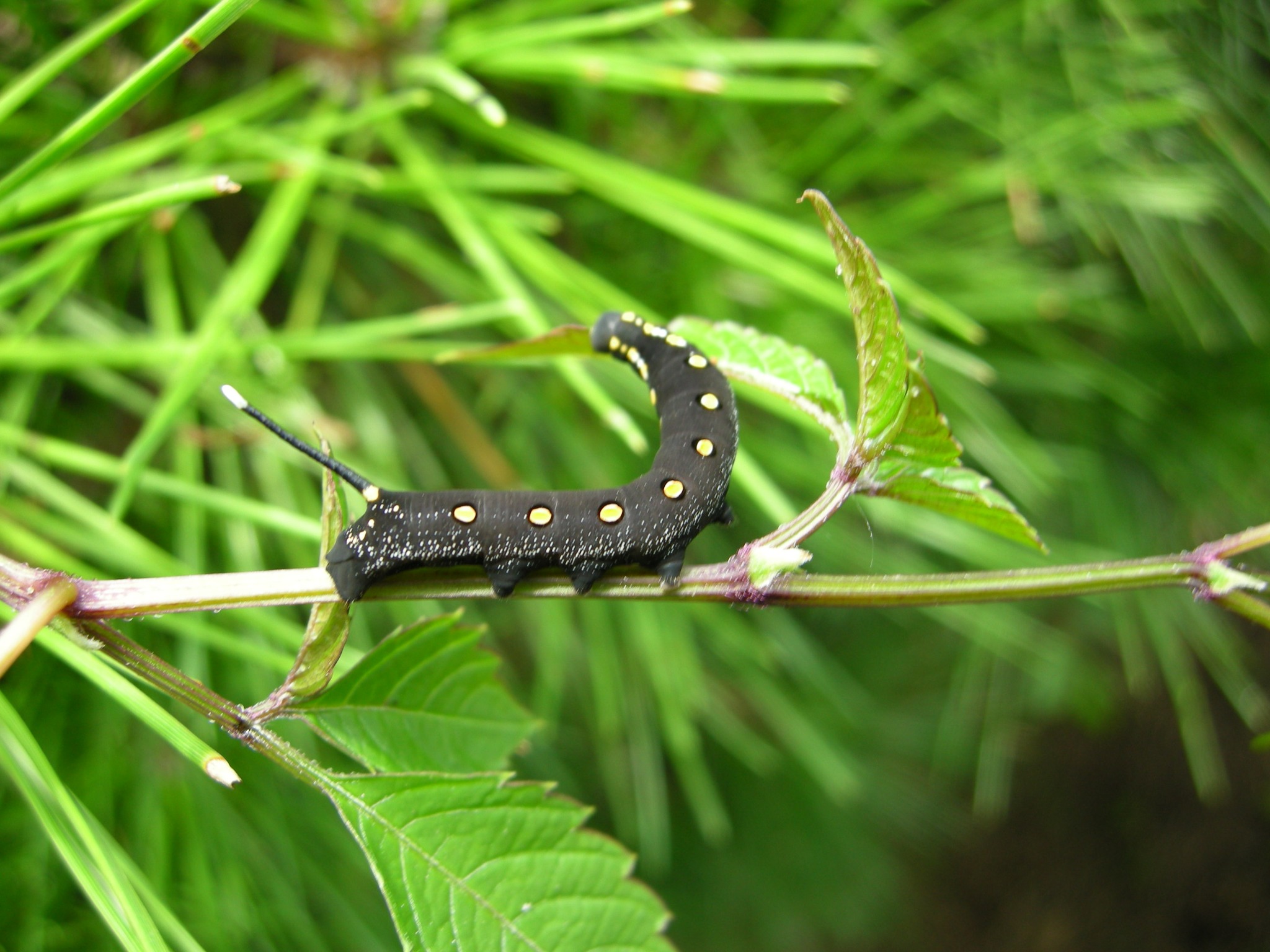 葉を食い尽くすイモムシはセスジスズメというガ(蛾)の幼虫です。
