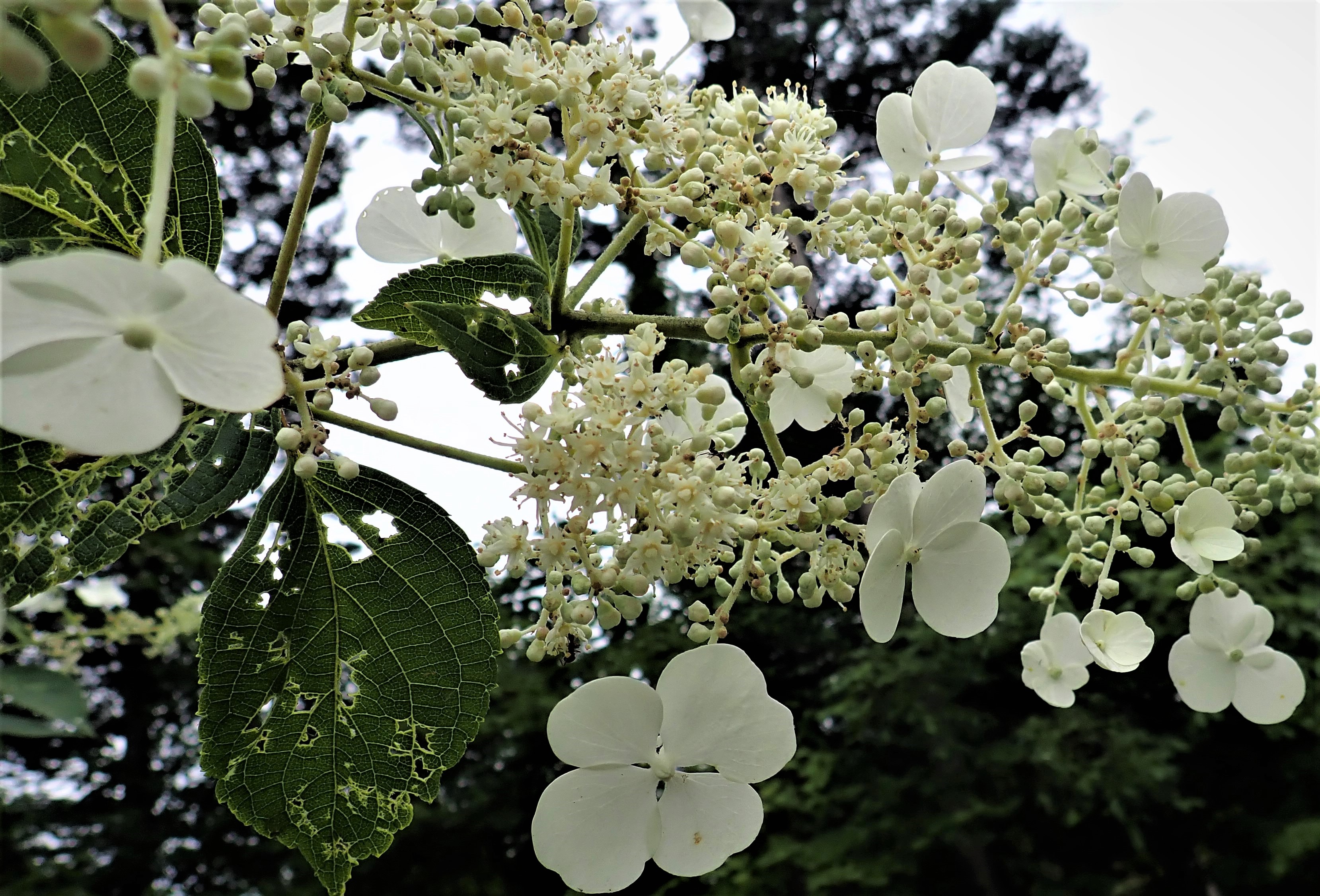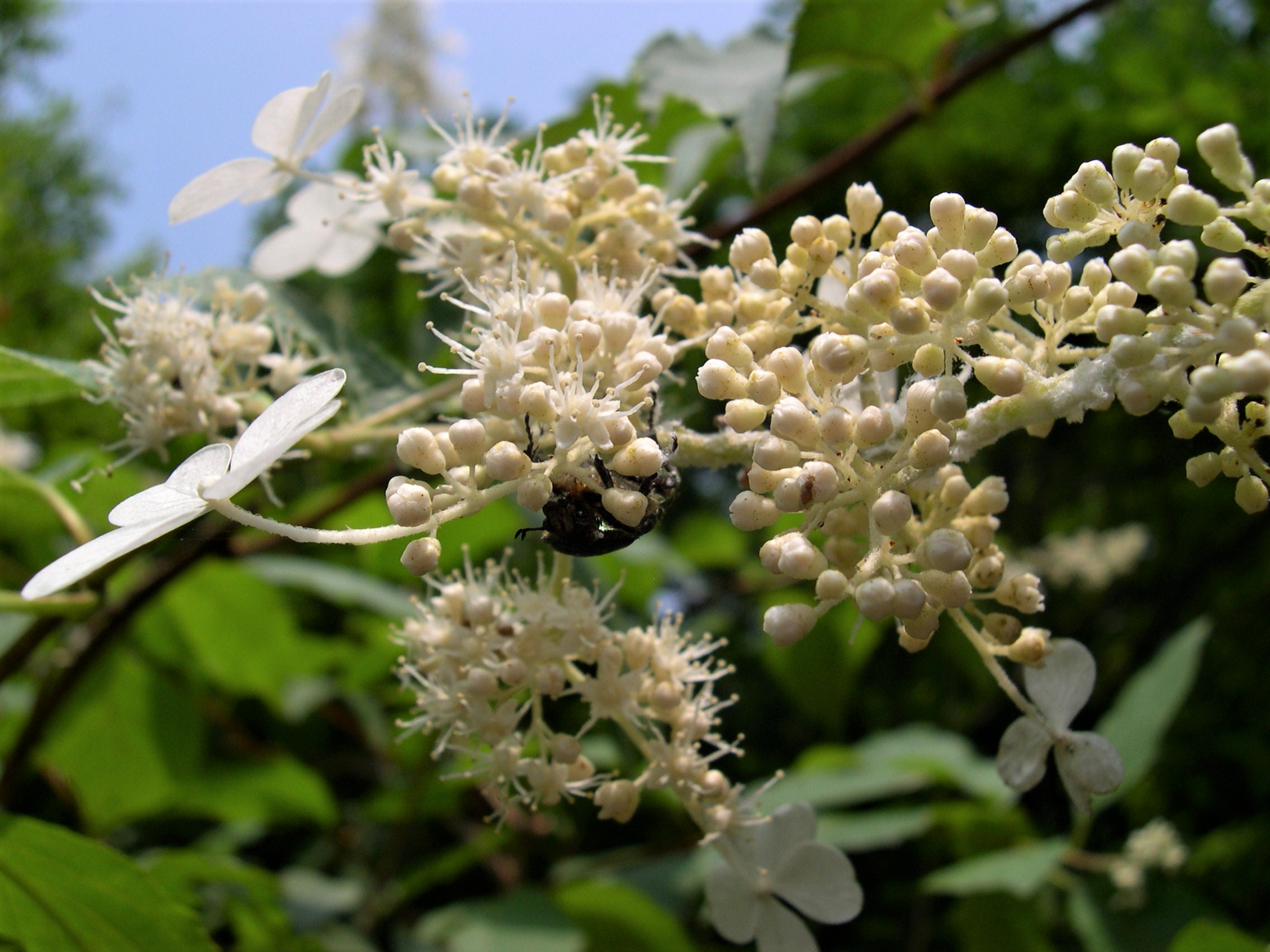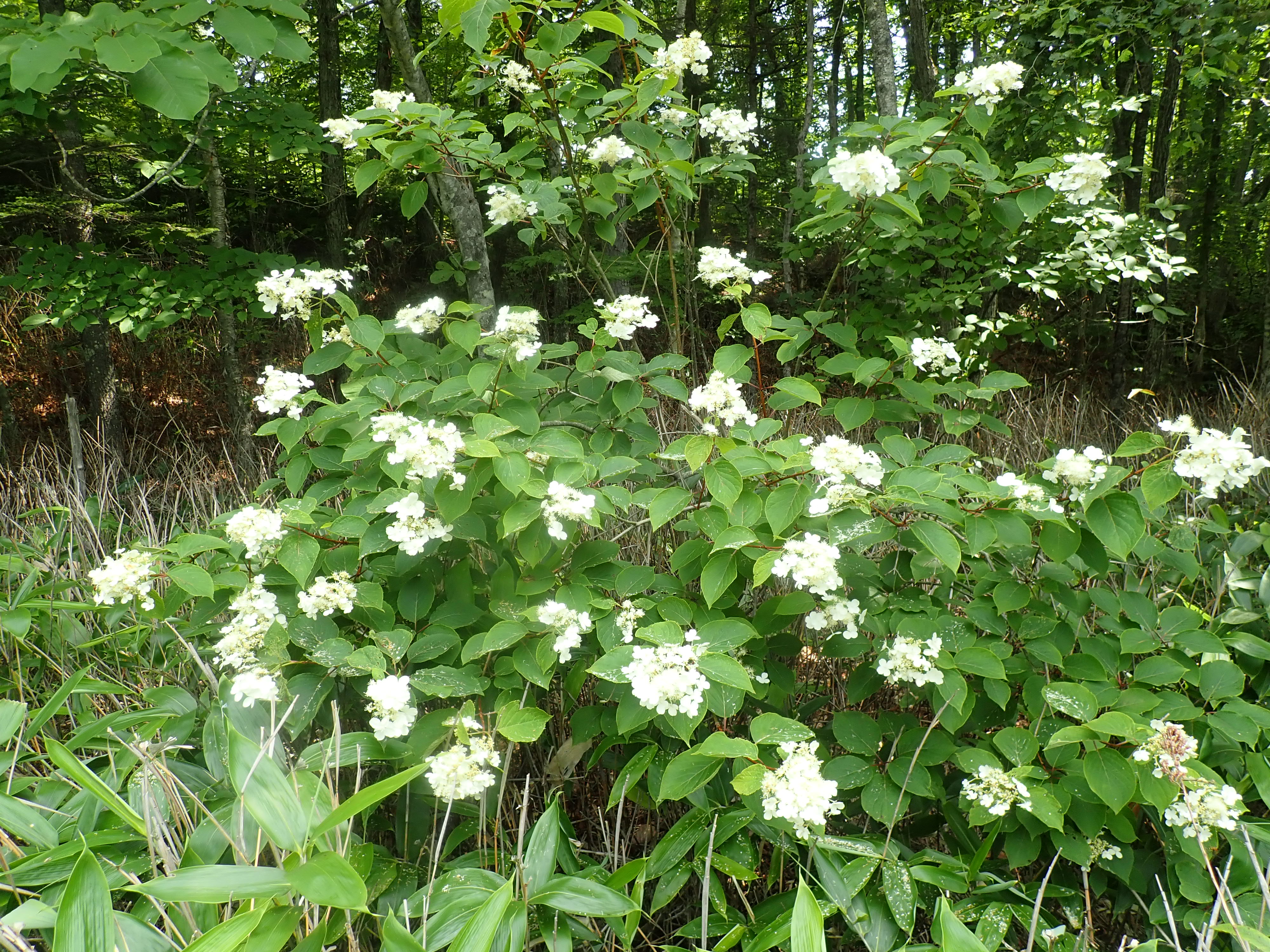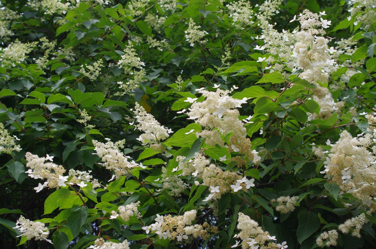 樹皮を水に浸して得られる粘液が紙漉きの際の糊料として使われることと、茎が中空であることから、糊空木です。白い装飾花と両性花が円錐形に咲きます。花が咲き始めると、大小の甲虫類が群がります。