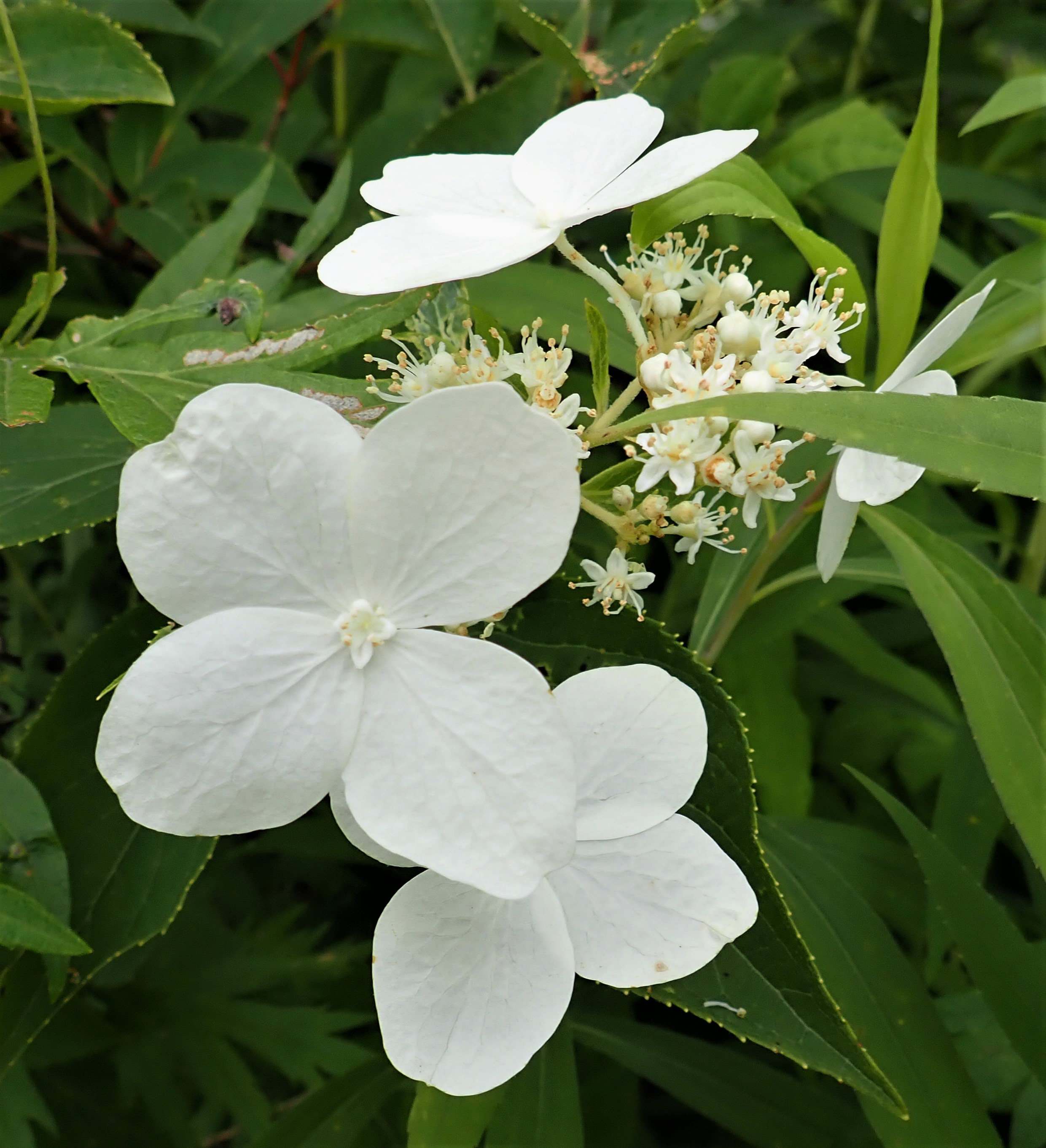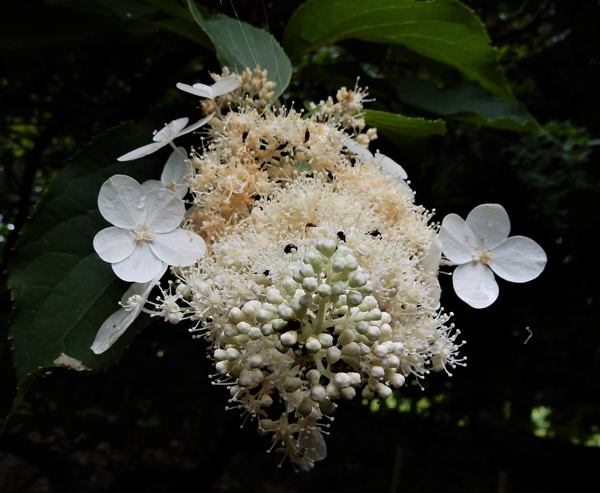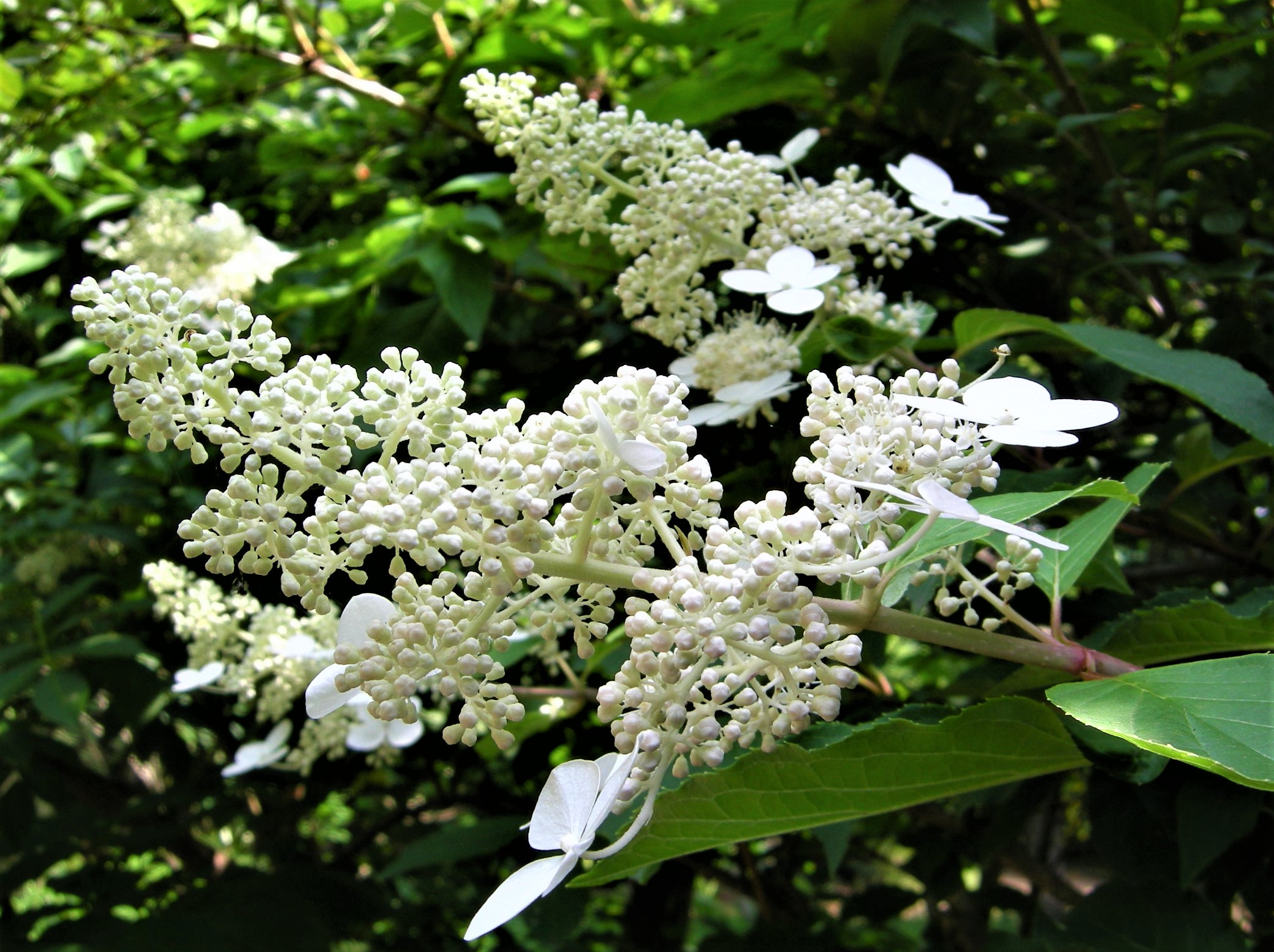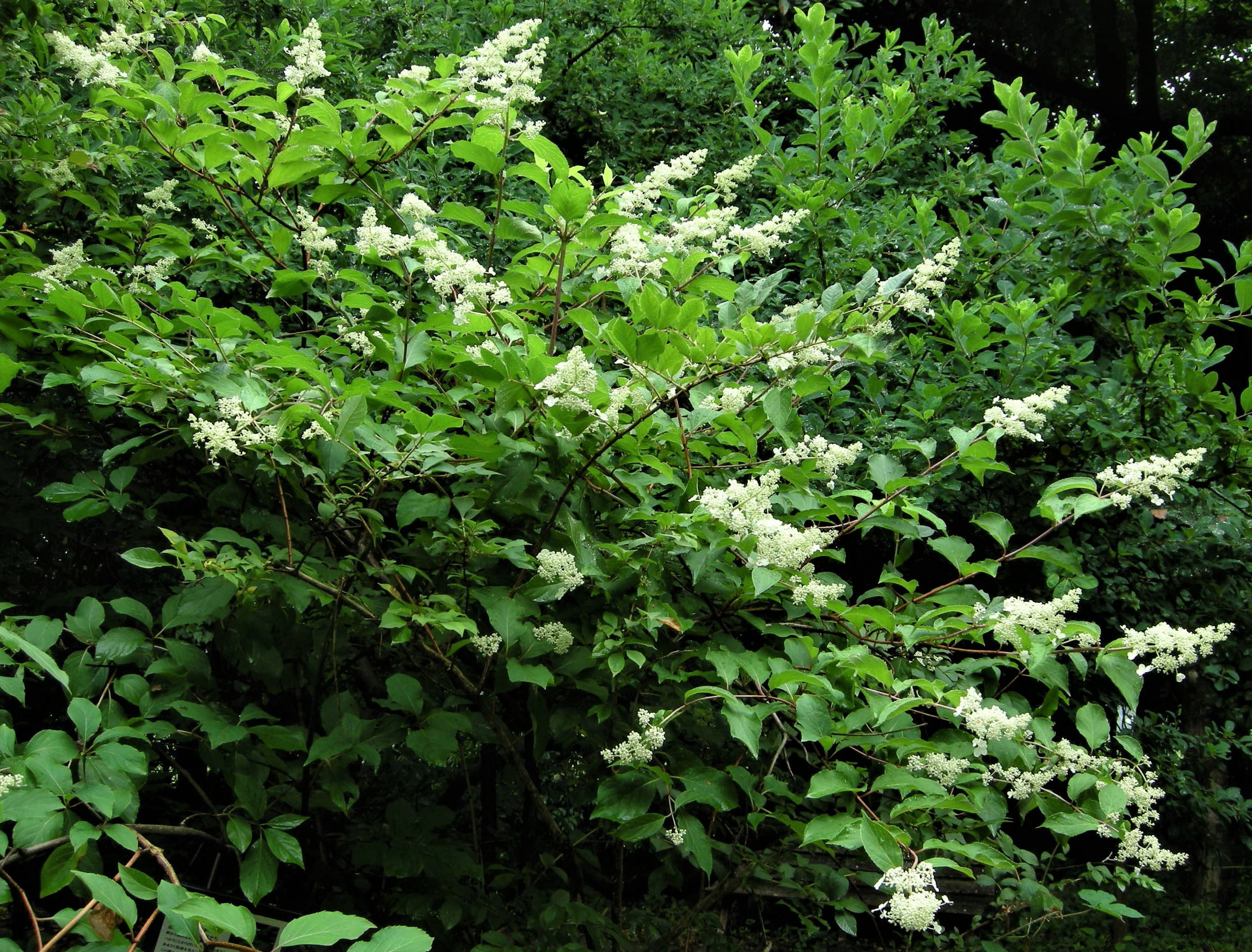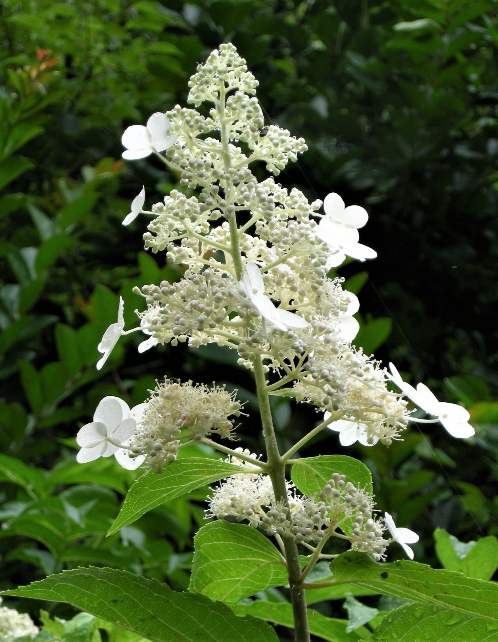 樹皮を水に浸して得られる粘液が紙漉きの際の糊料として使われることと、茎が中空であることから、糊空木です。白い装飾花と両性花が円錐形に咲きます。花が咲き始めると、大小の甲虫類が群がります。