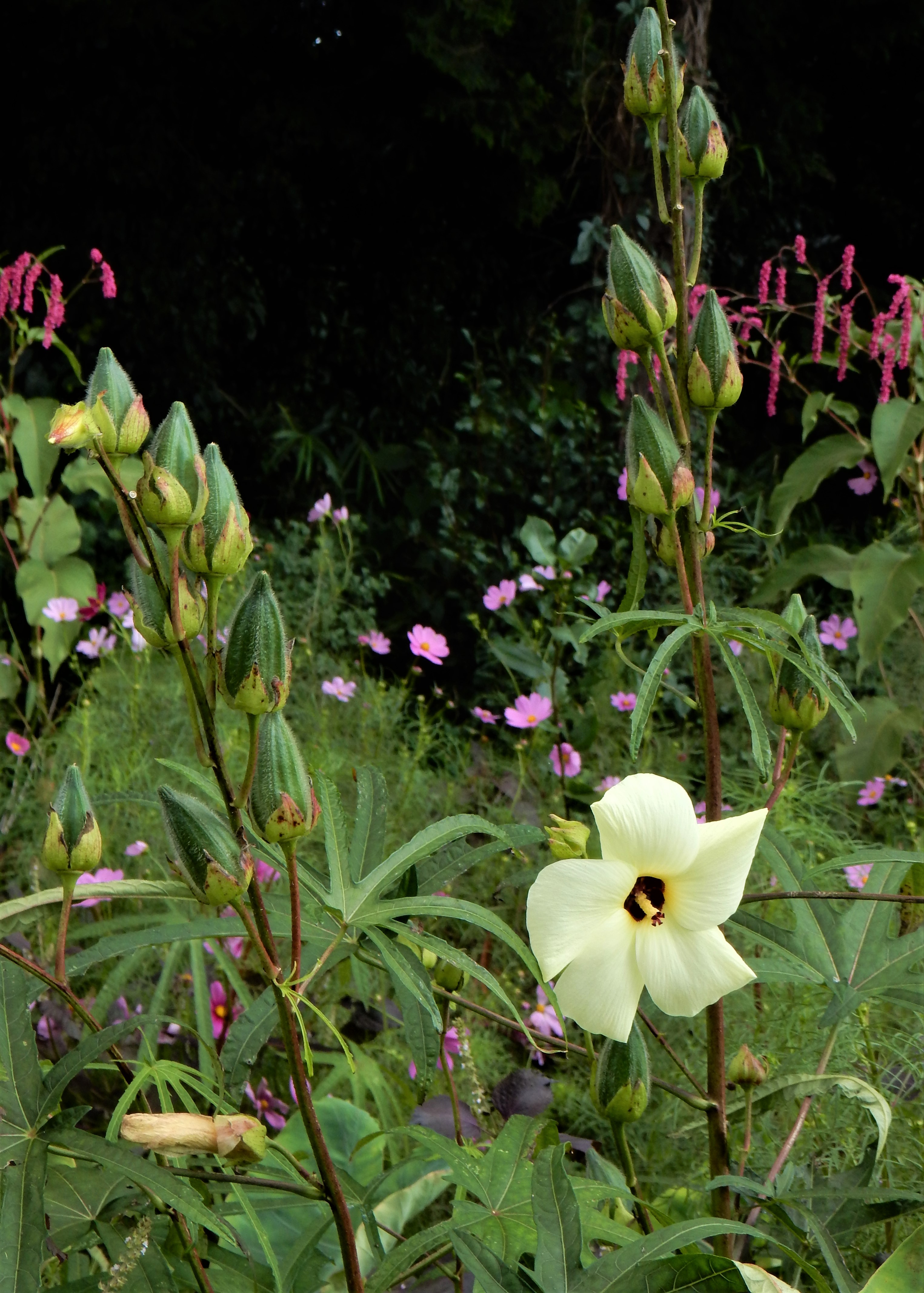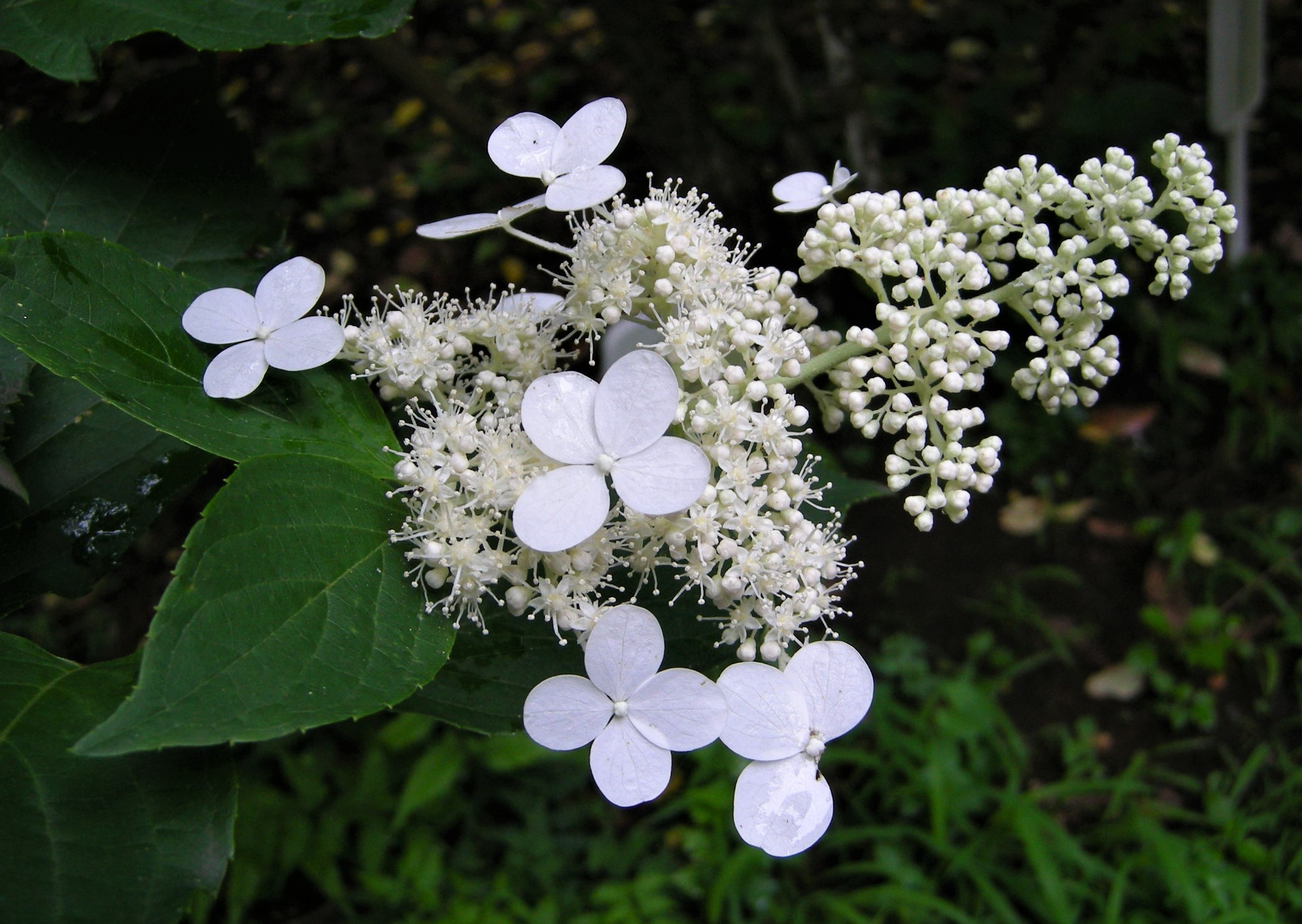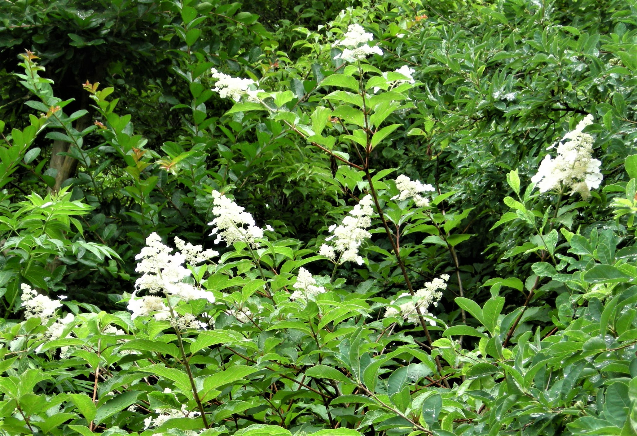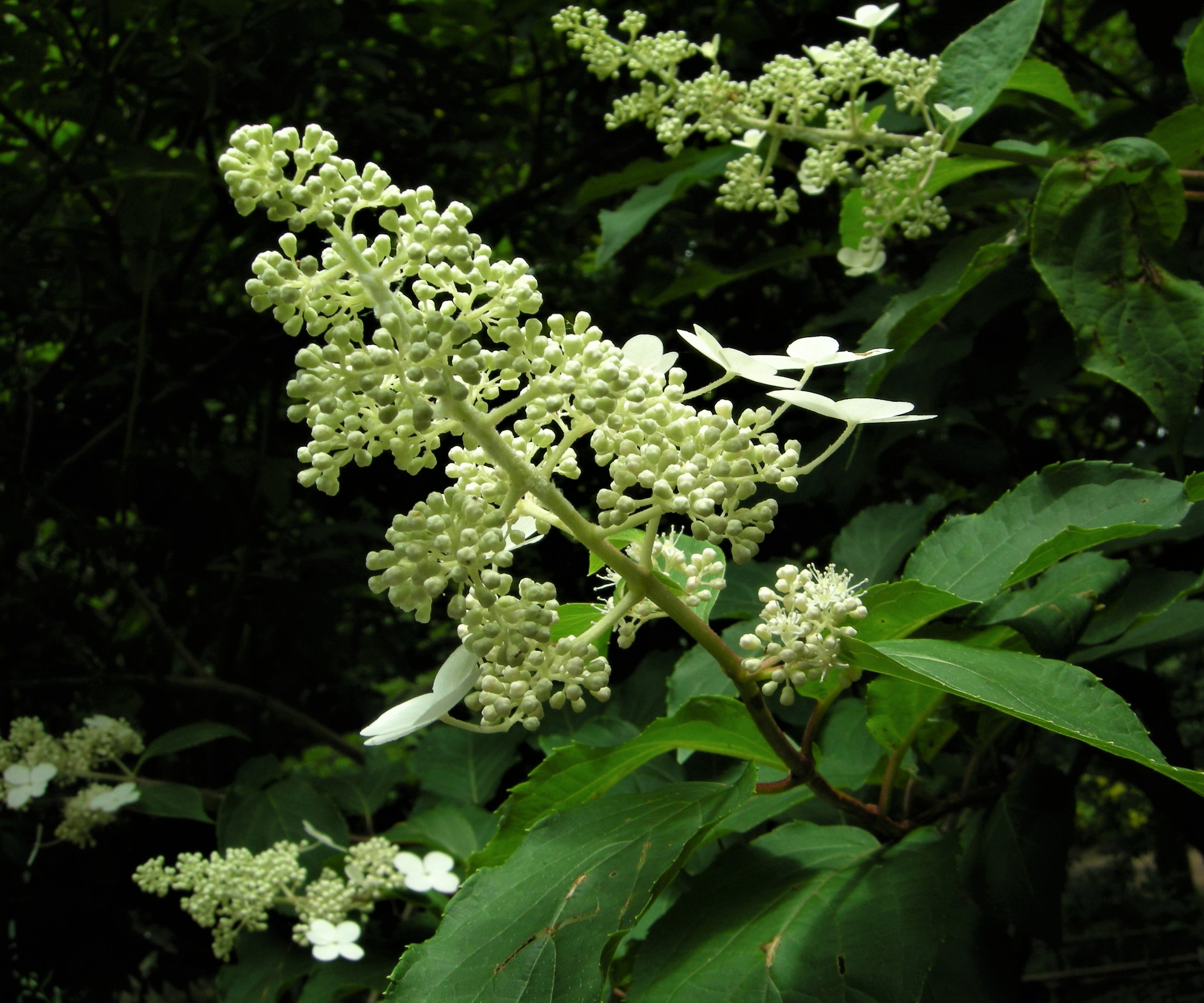 樹皮を水に浸して得られる粘液が紙漉きの際の糊料として使われることと、茎が中空であることから、糊空木です。白い装飾花と両性花が円錐形に咲きます。花が咲き始めると、大小の甲虫類が群がります。