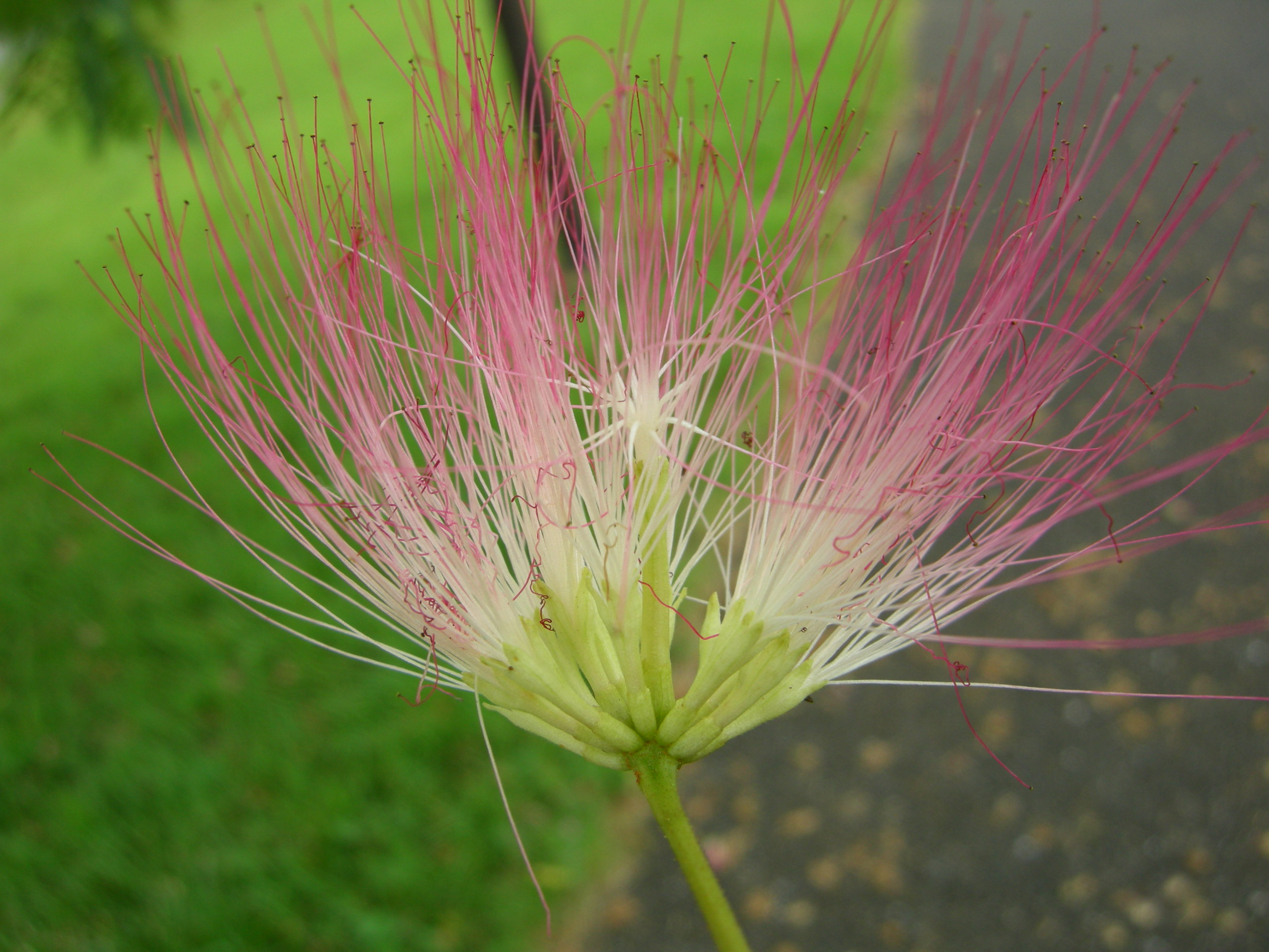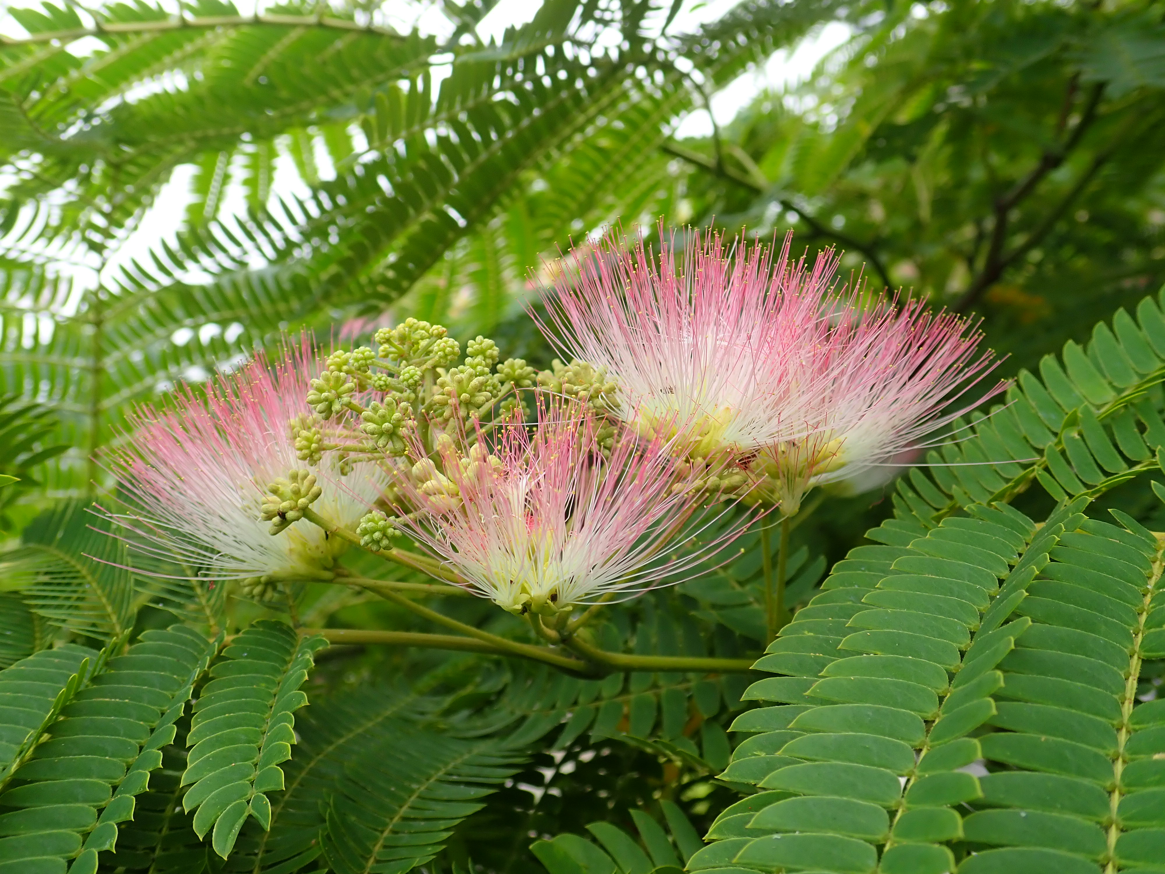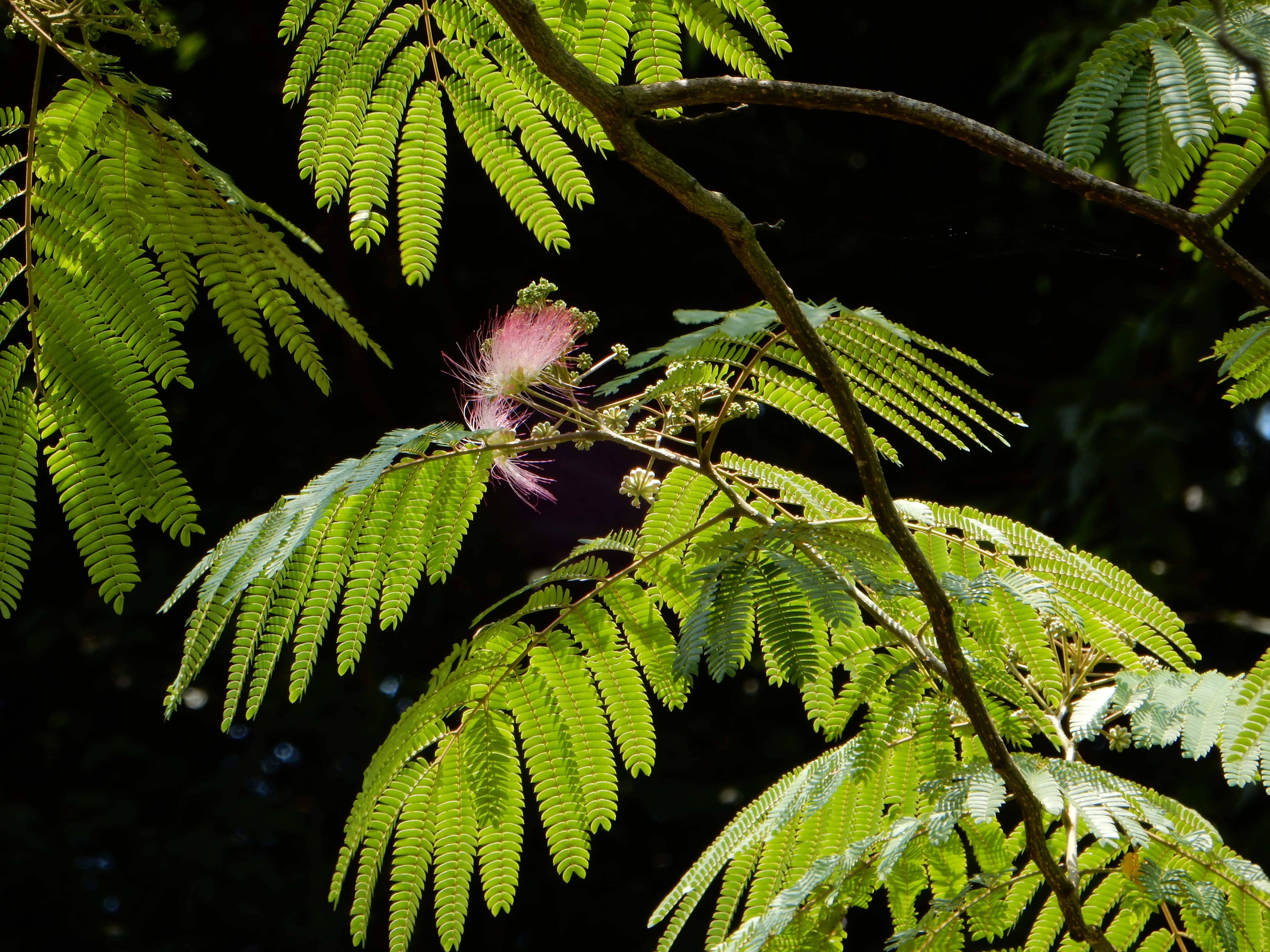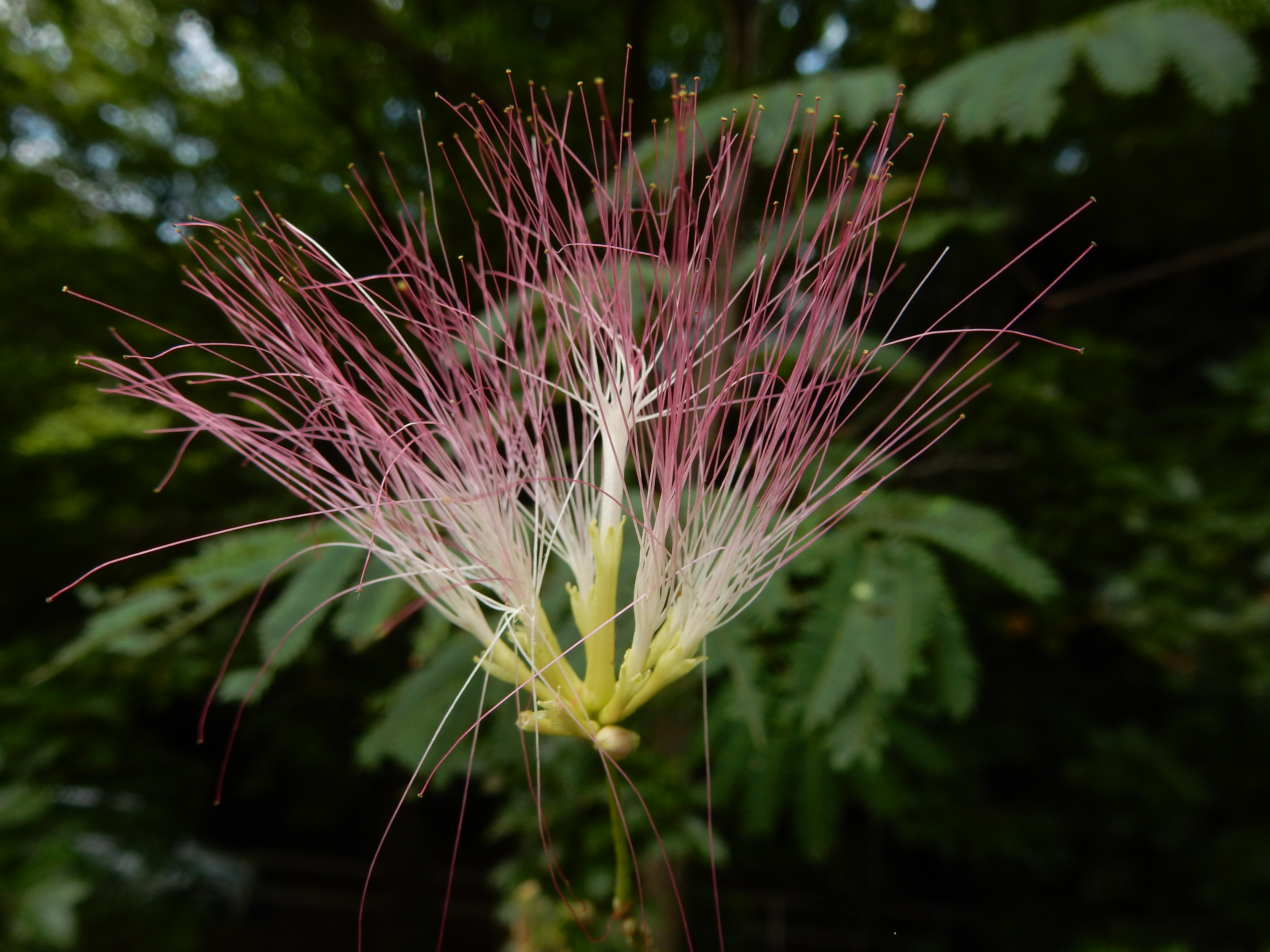 花は小さな花の集合で、葉が閉じ始める夕方から咲き始めます。葉が閉じることで花が目立ち、夕方から活動して花粉を媒介してくれるスズメガの仲間を誘います。