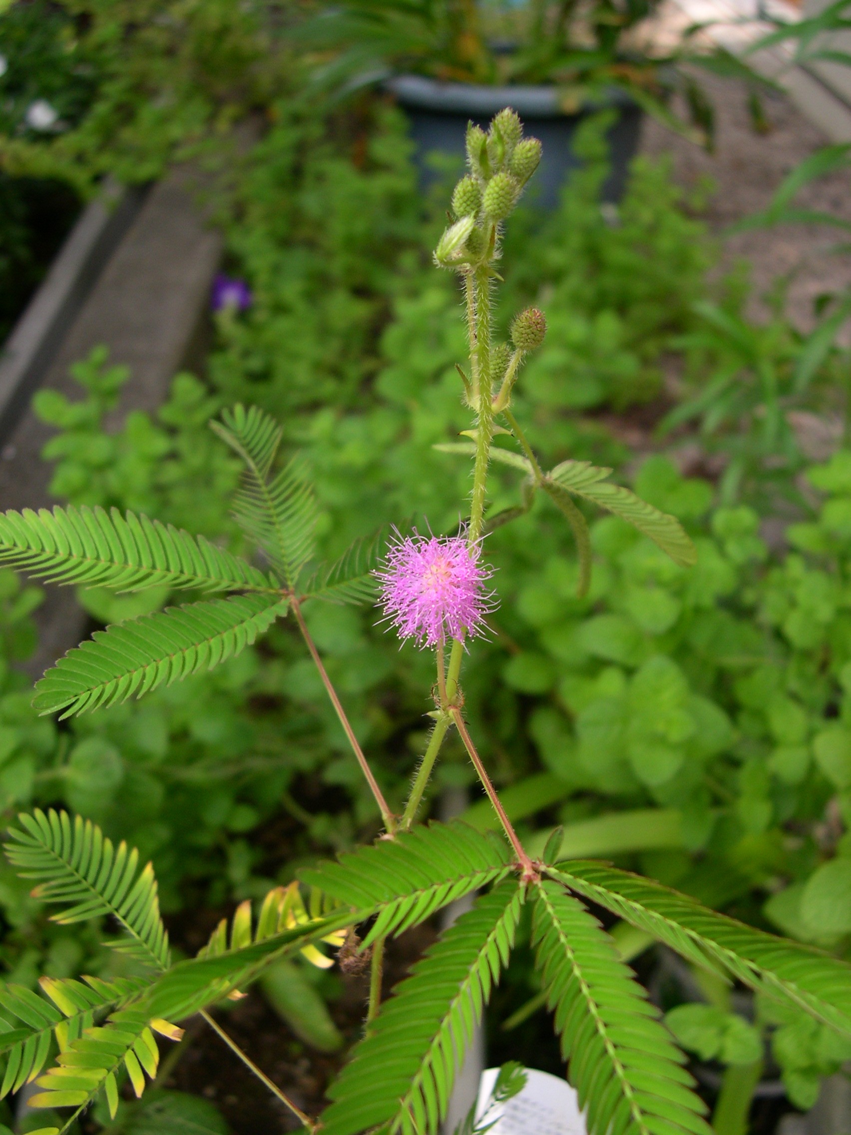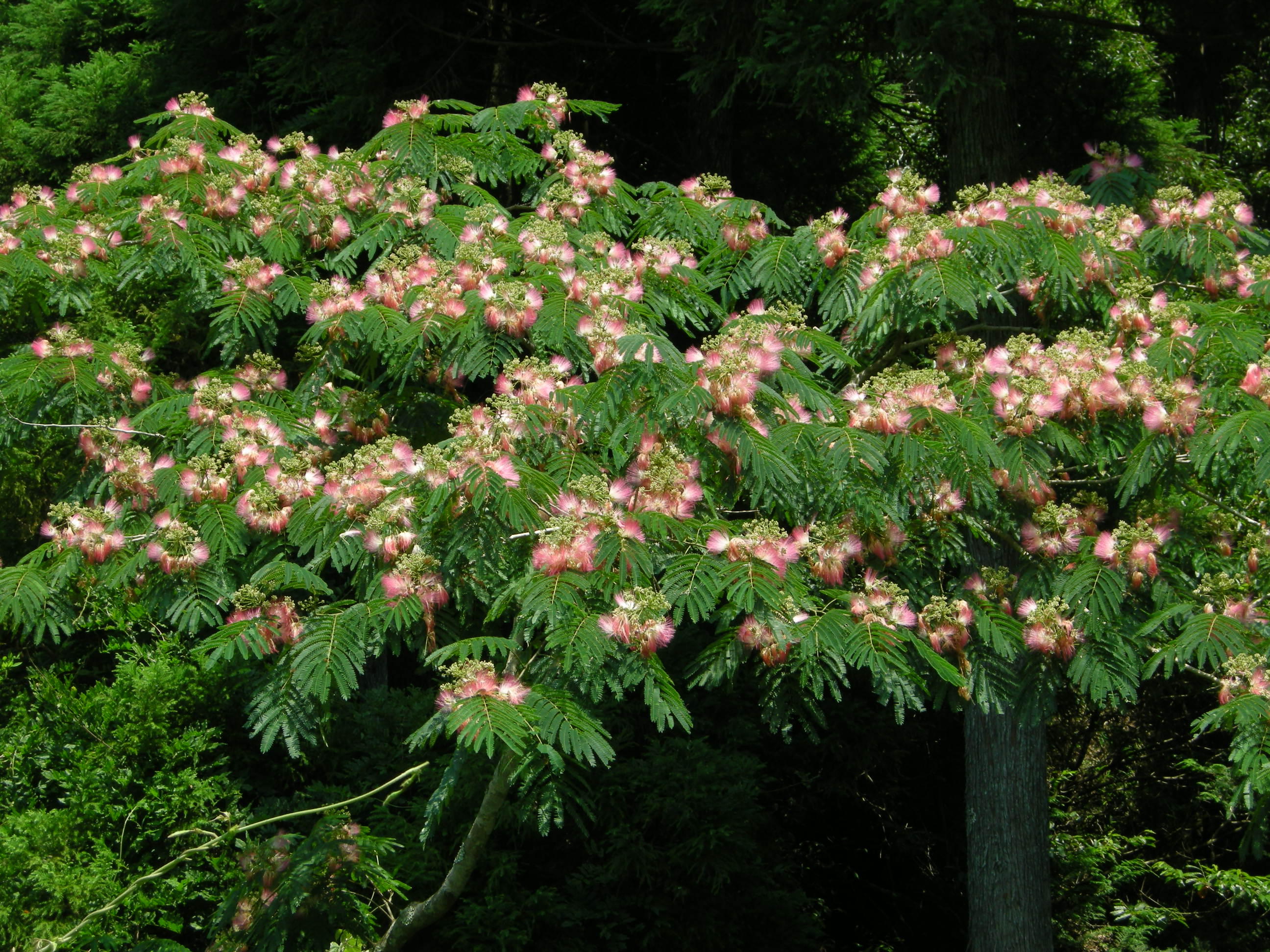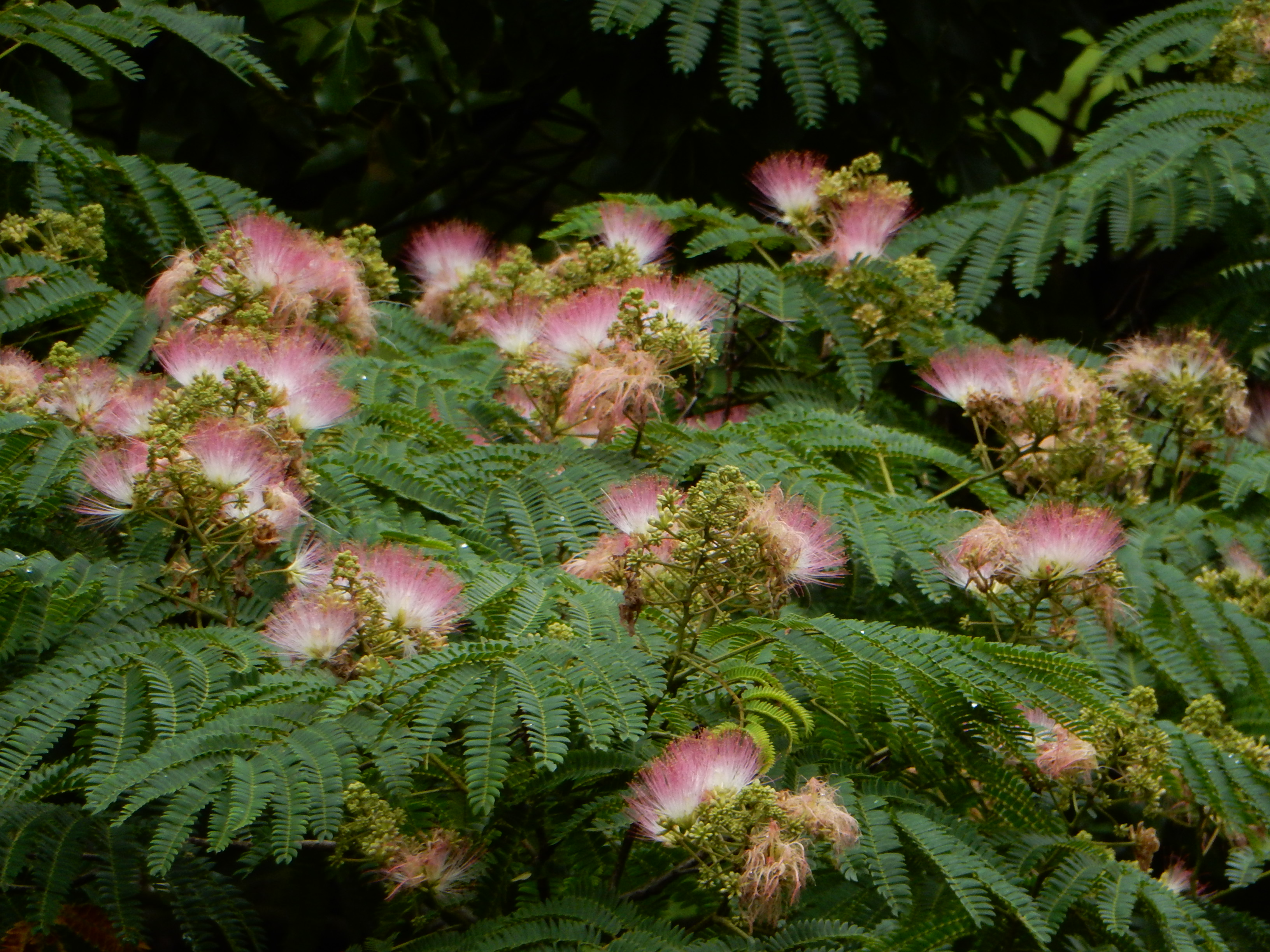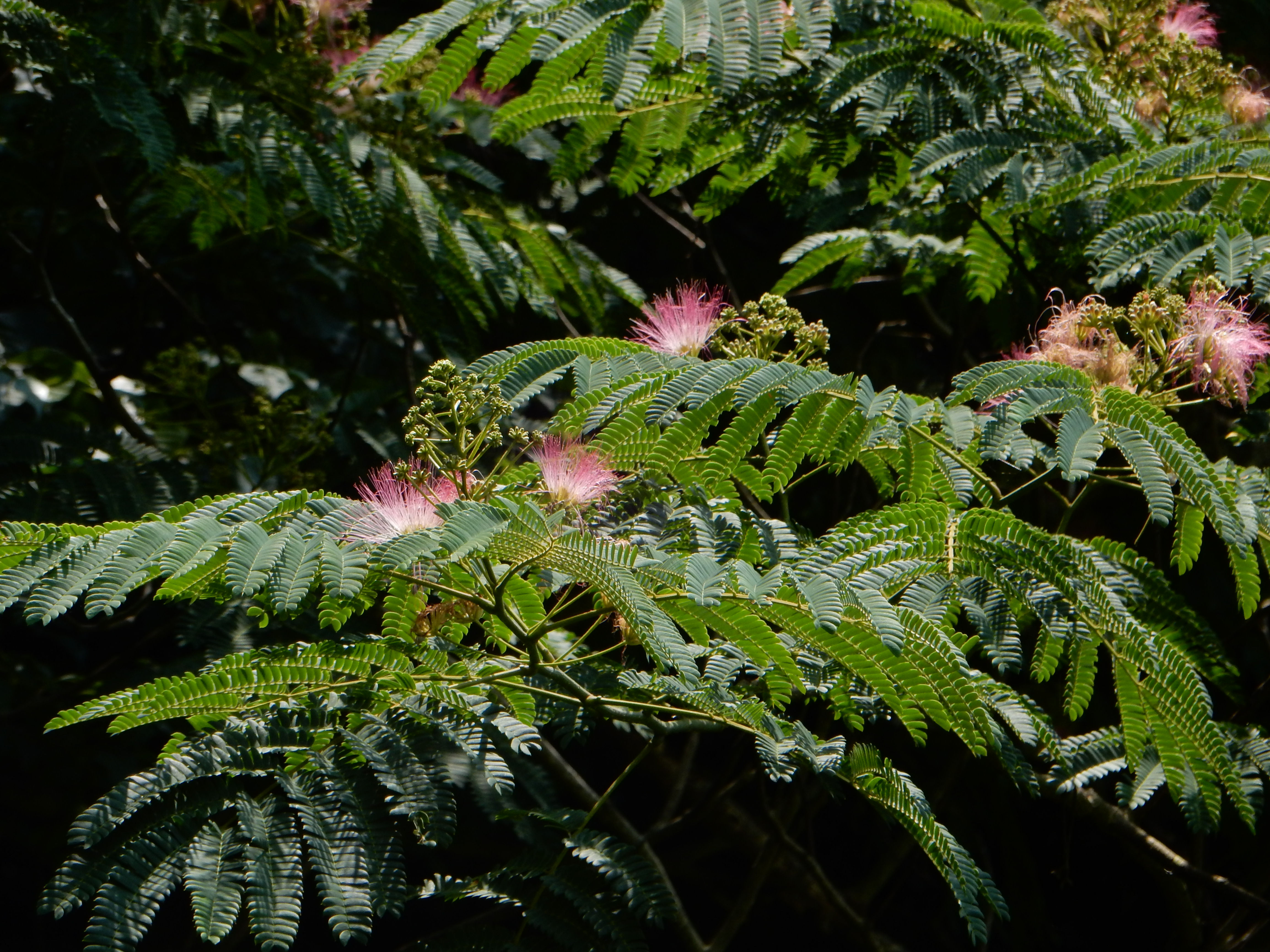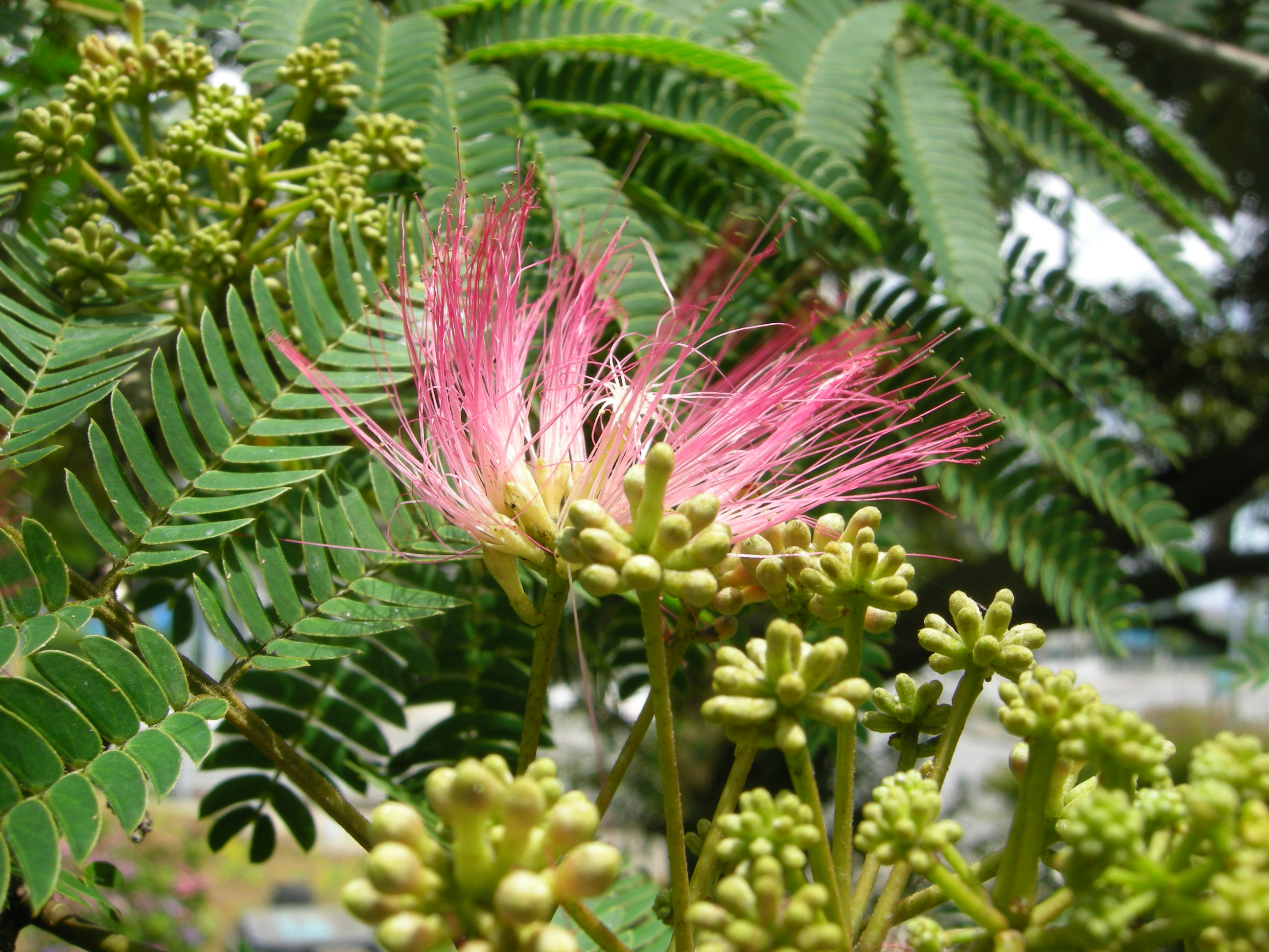 花は小さな花の集合で、葉が閉じ始める夕方から咲き始めます。葉が閉じることで花が目立ち、夕方から活動して花粉を媒介してくれるスズメガの仲間を誘います。