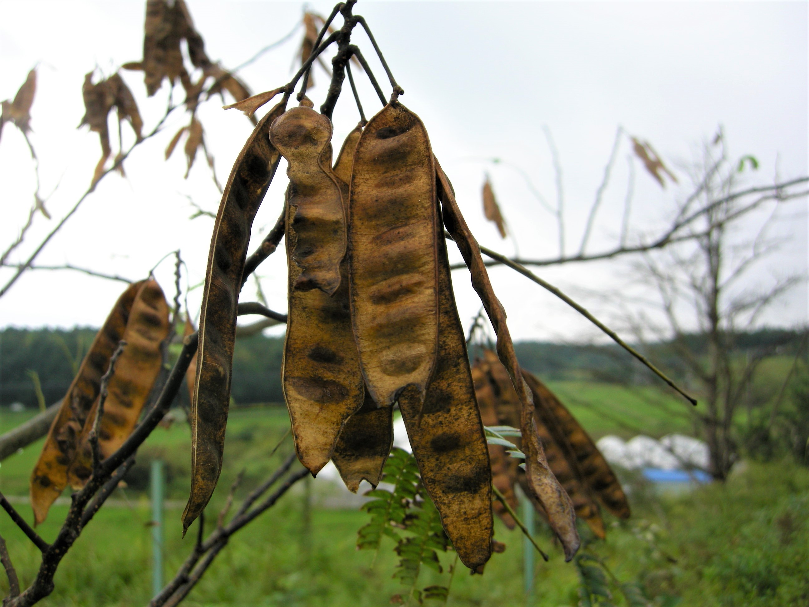 扁平な果実は莢(さや)のままで飛んで行くこともあります。種子も扁平で軽いので、遠くまで飛んで思いがけないところから発芽することもあります。