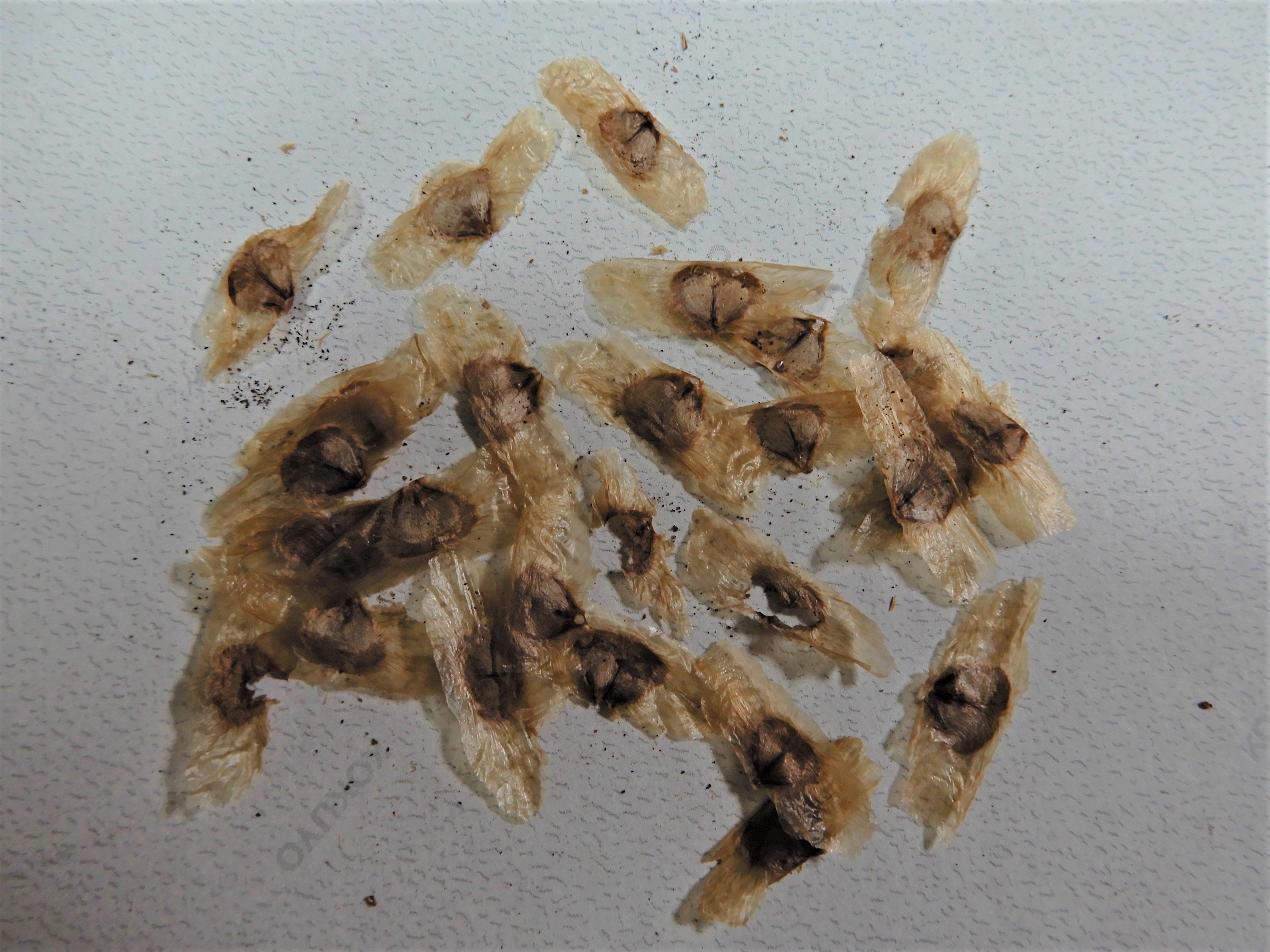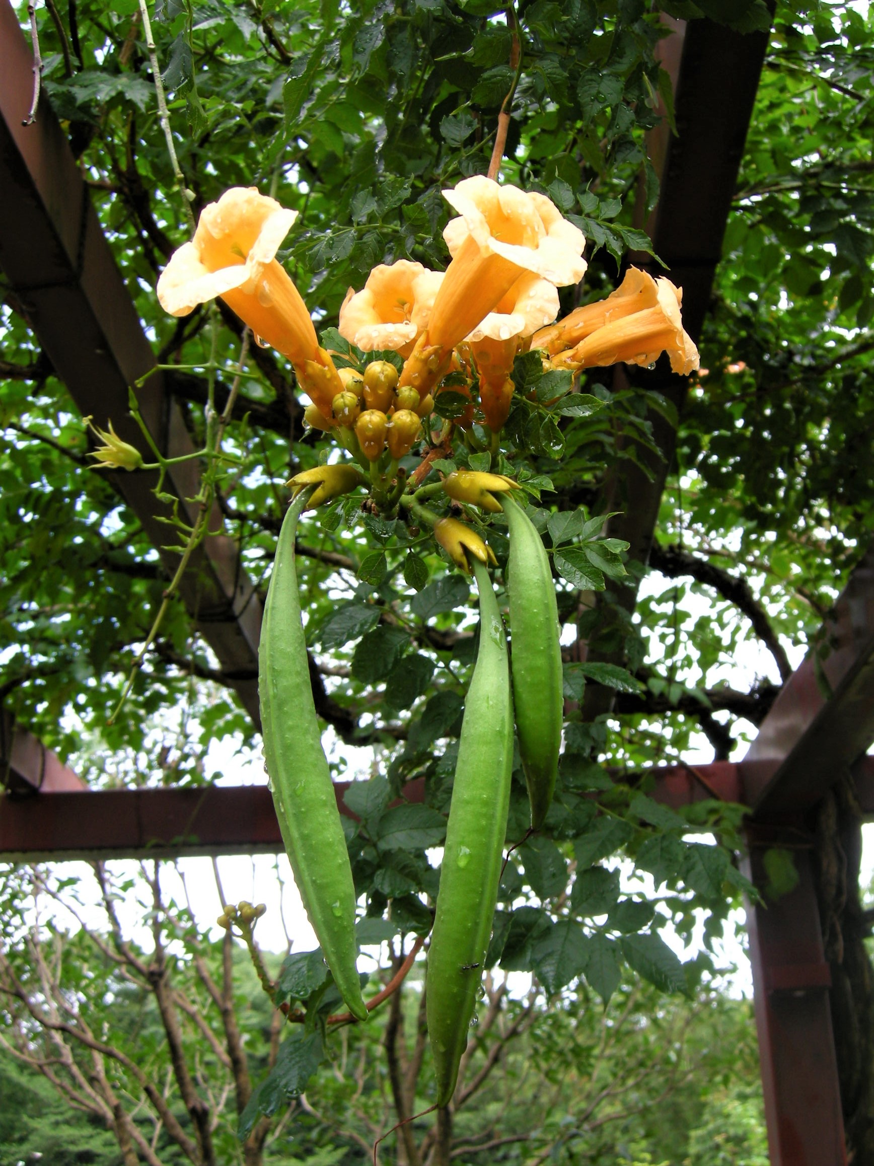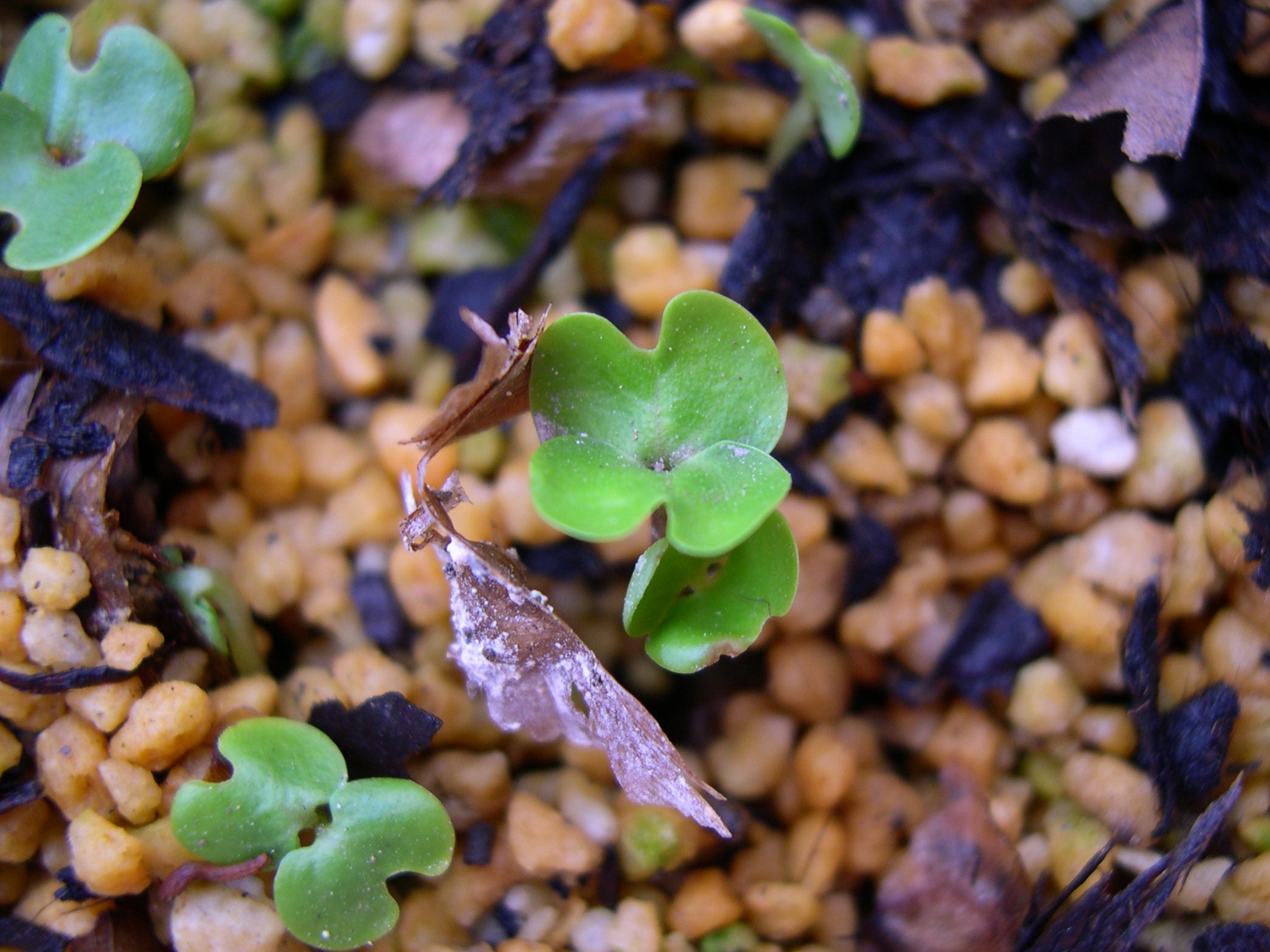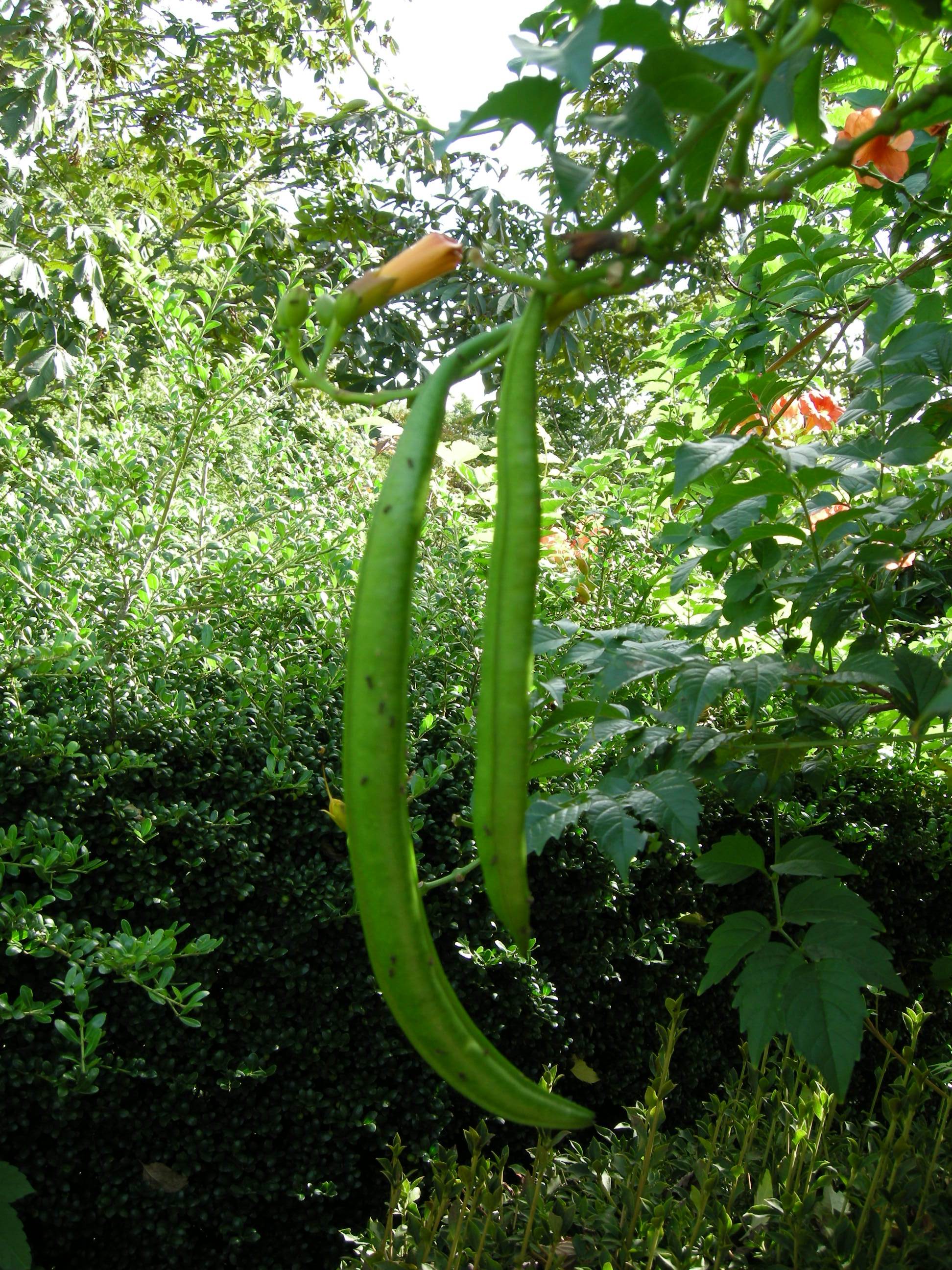 多くの図鑑に「日本では結実はしない」とか「結実は稀」と書かれていますが、千葉市都市緑化植物園では結実して話題になります。細長い豆果を思わせる果実ができますが、ノウゼンカズラ科ですので、薄いひらひらした種子が無数に入っています。発芽率は良く、播種後、すぐに発芽しました。自然界でむやみに繁殖しないように注意が必要かもしれません。発芽したノウゼンカズラですが、旺盛な繁殖力の故でしょうか、引き取り手は現れませんでした。