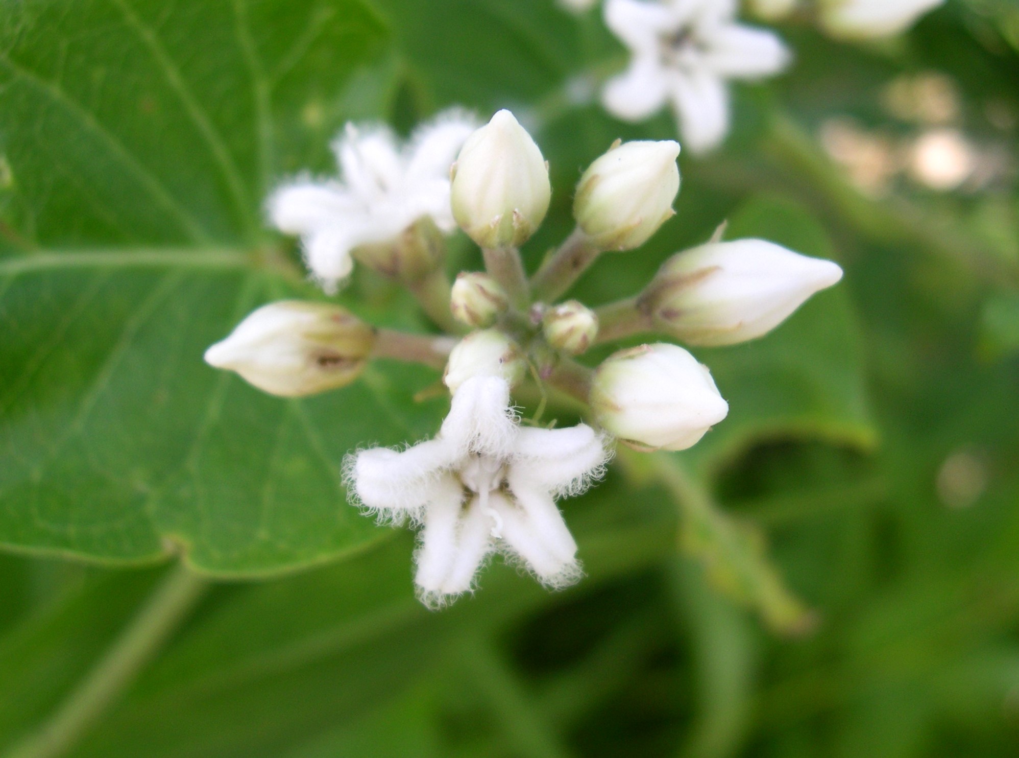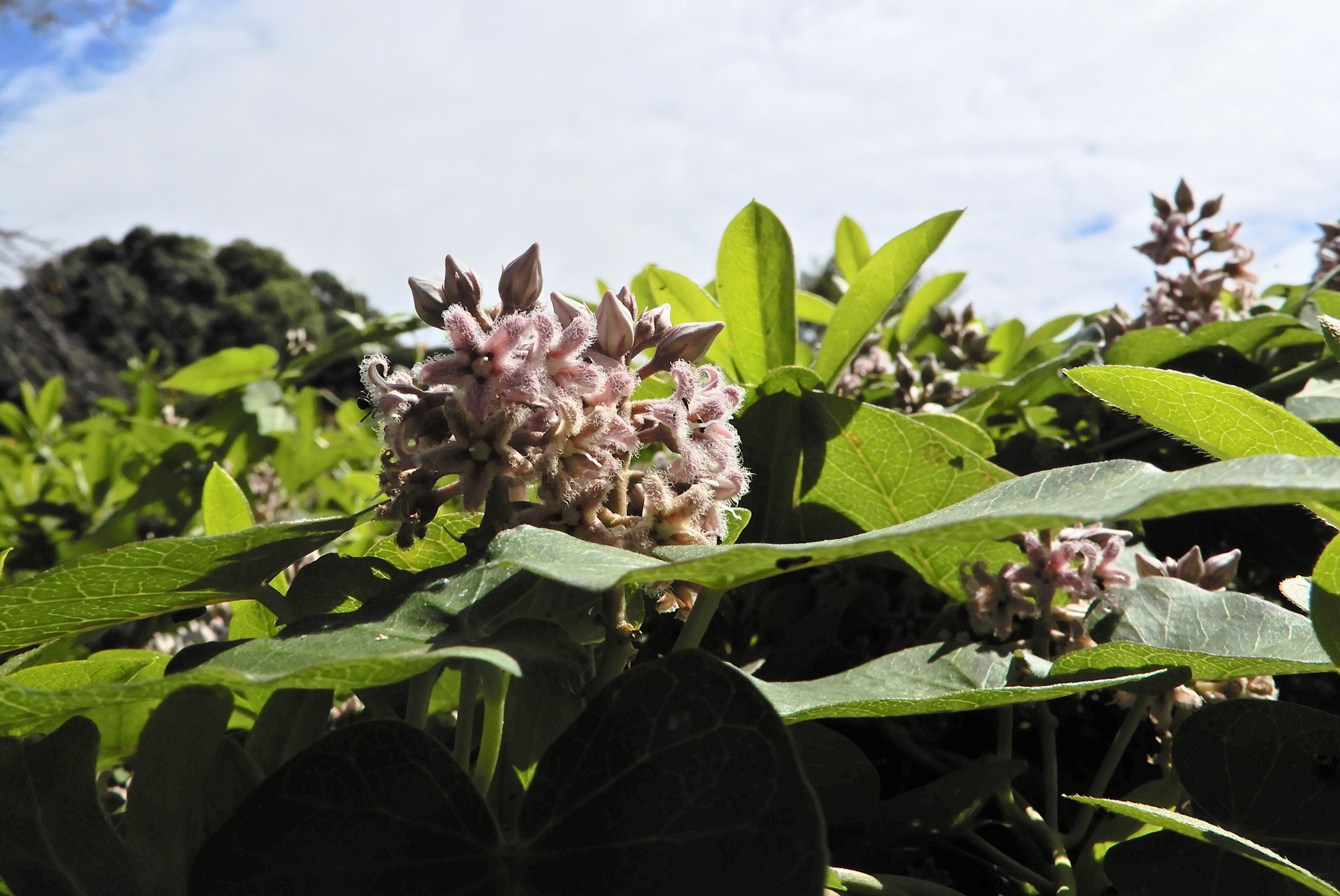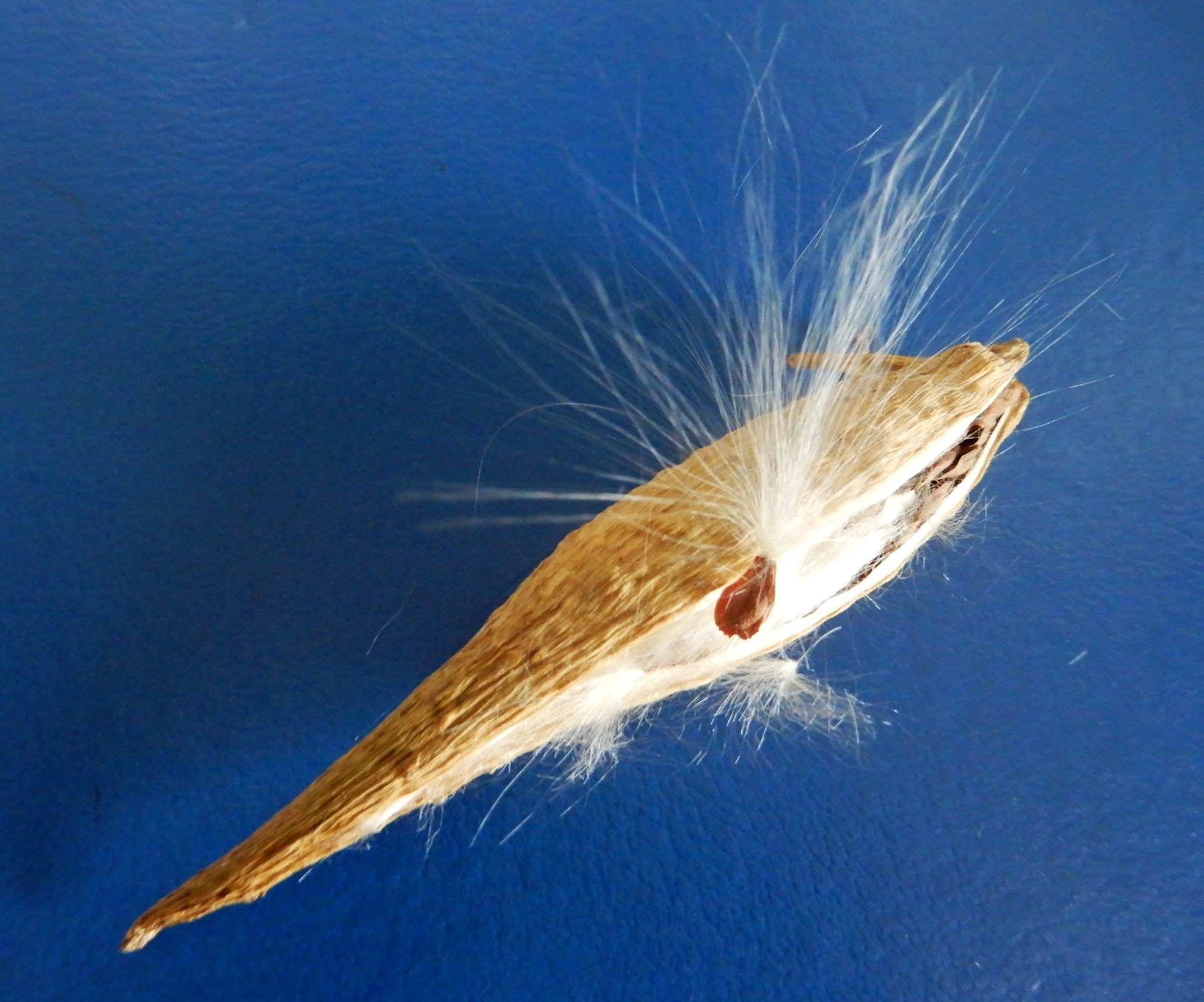 結実は少ないのですが、大きな果実に白い綿毛(種髪しゅはつ)をつけた扁平な種子が200個を越す数が並んでいます。この白い毛がパンヤに似ているということから別名クサパンヤとも呼ばれます。