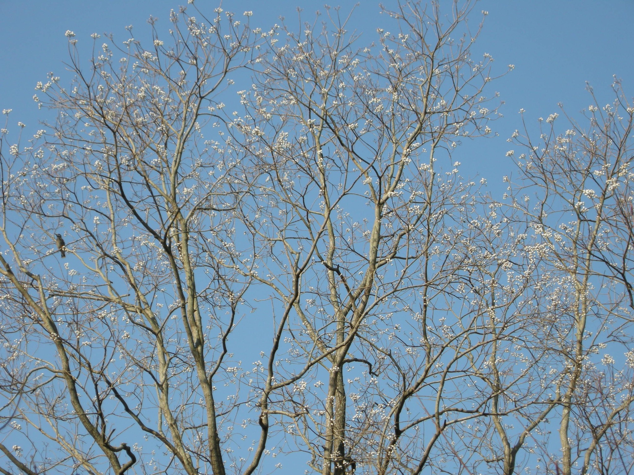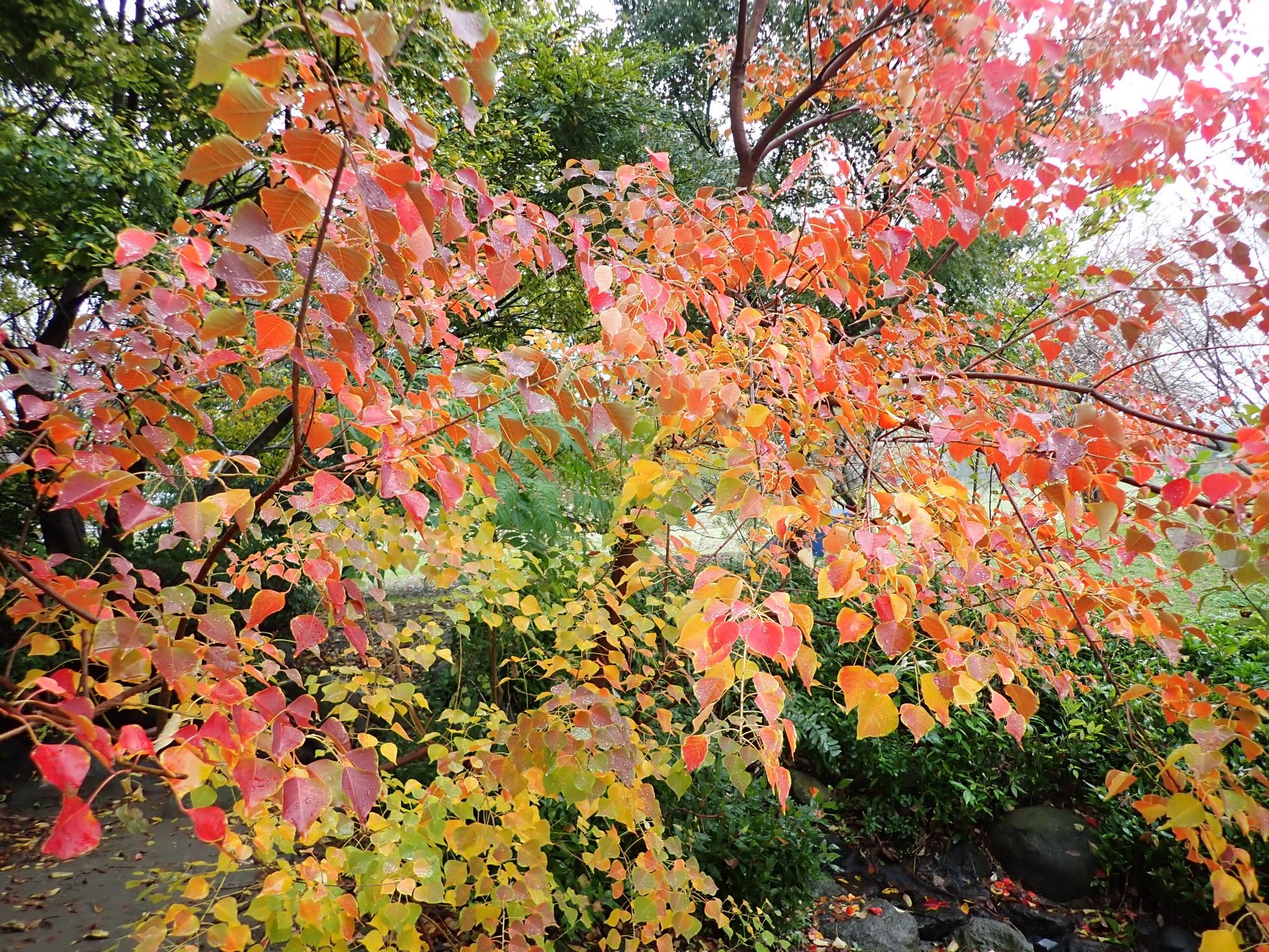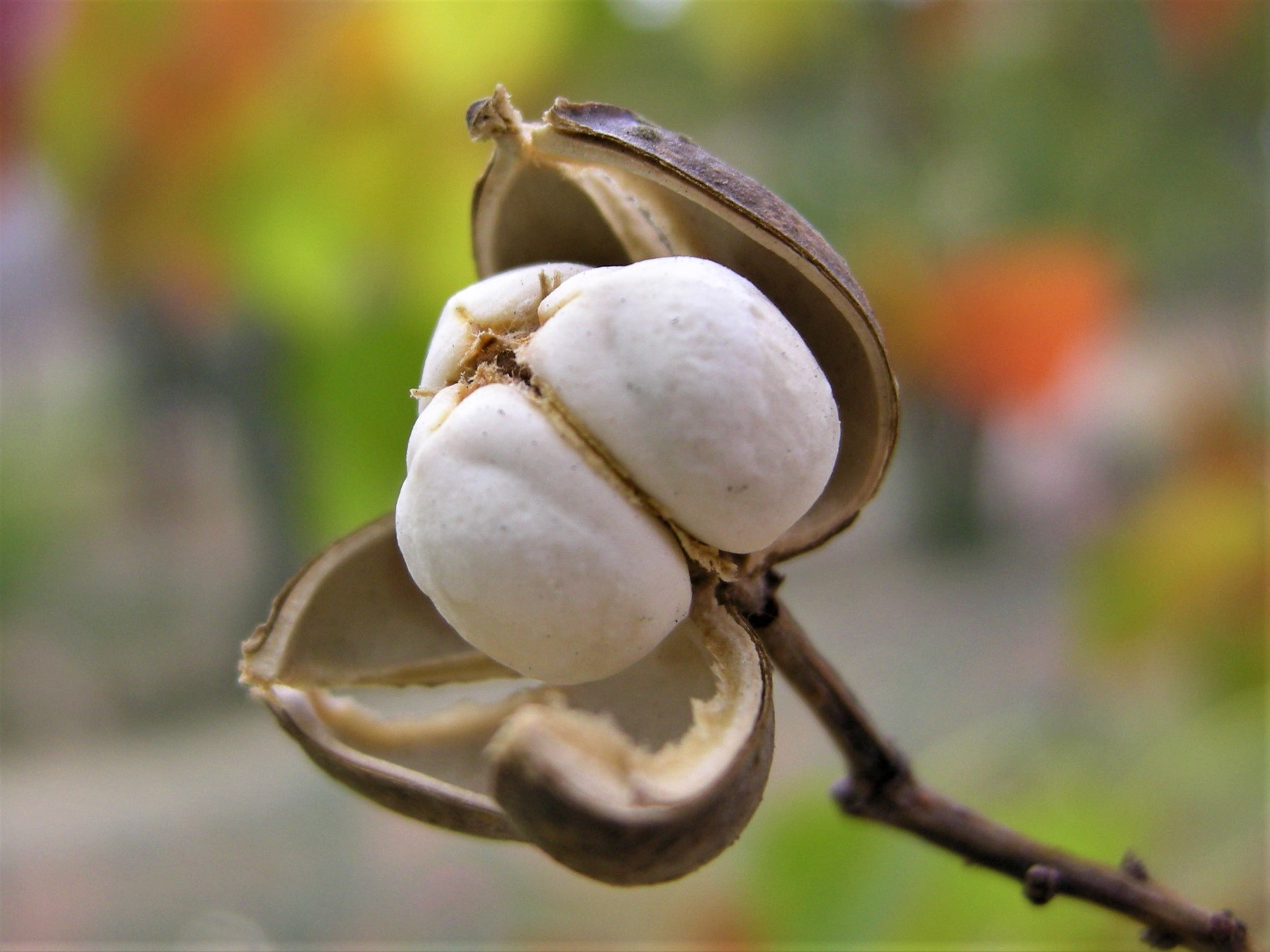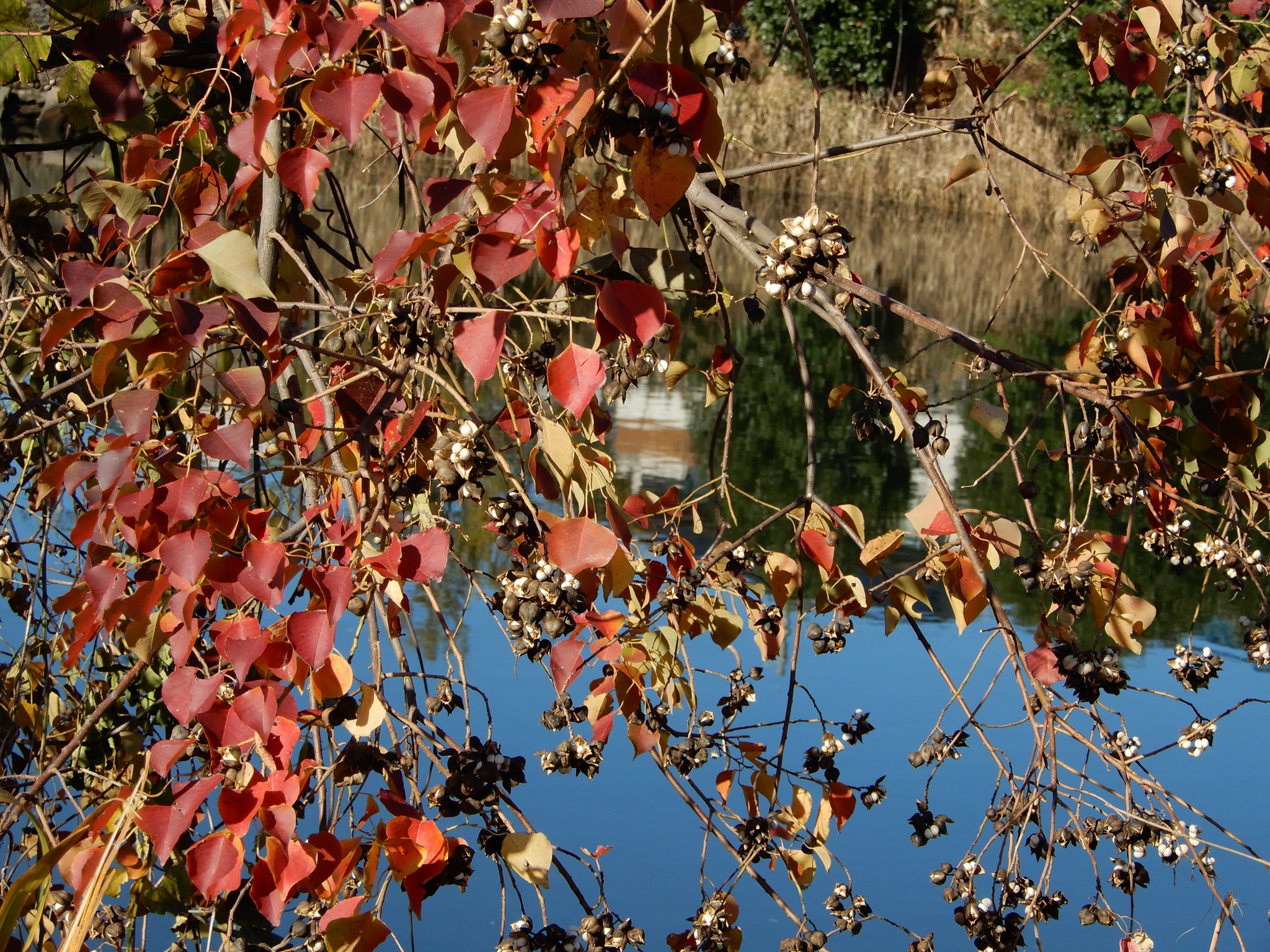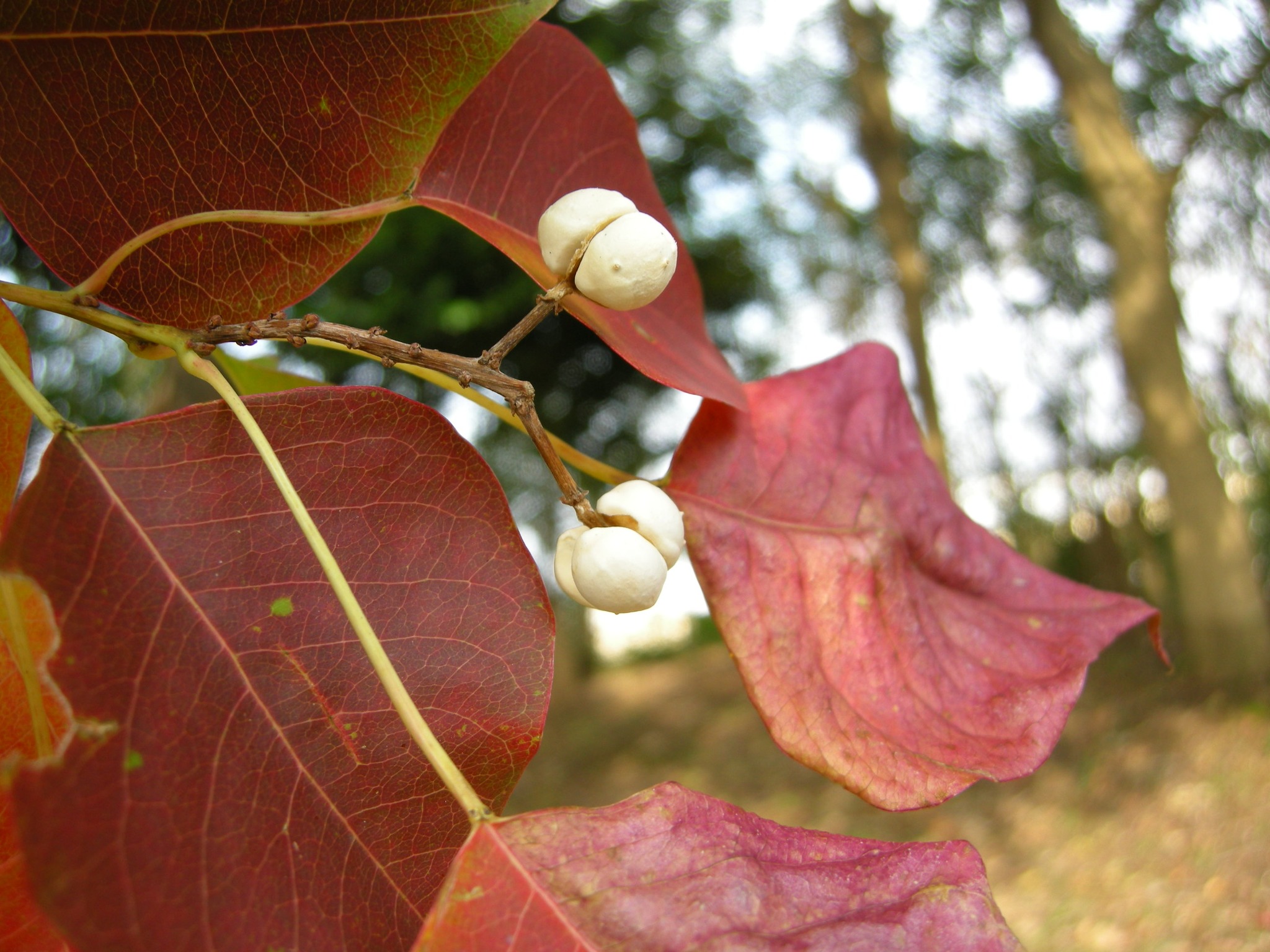 街路樹として植えられているのを多く見かける木です。この季節、紅葉の美しさは注目を集めます。また、裂開した果実は蝋物質に覆われており、白い実が青空に映えます。