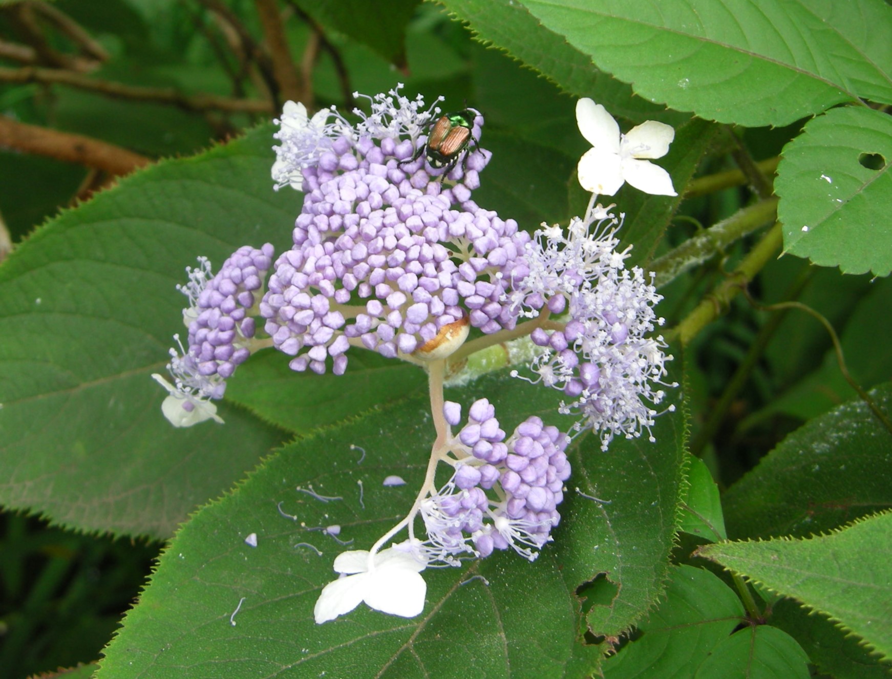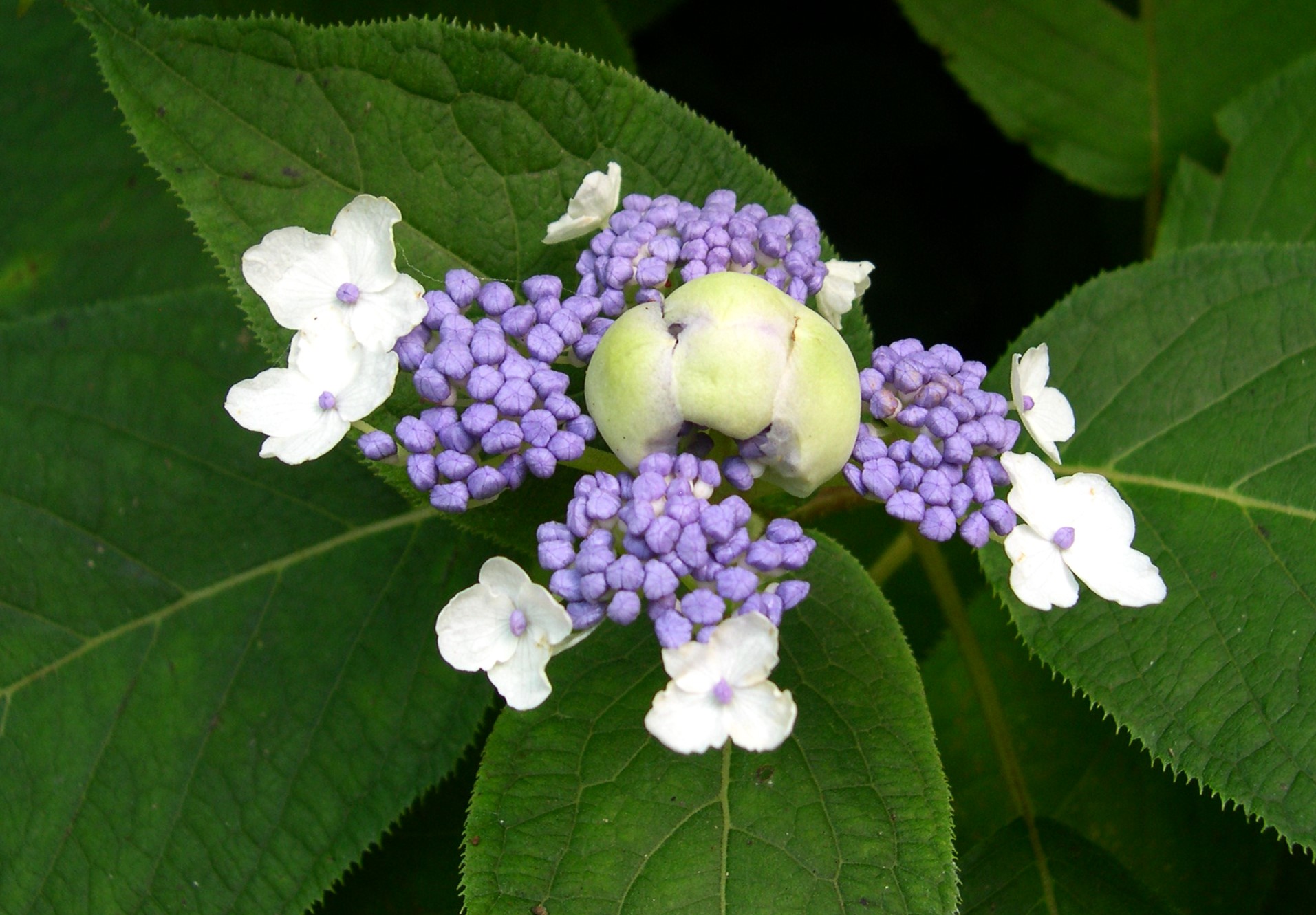 花はガクアジサイ同様、淡い紫色の両性花の周りを白いガク(萼)の目立つ装飾花が取り巻きます。