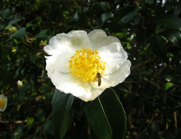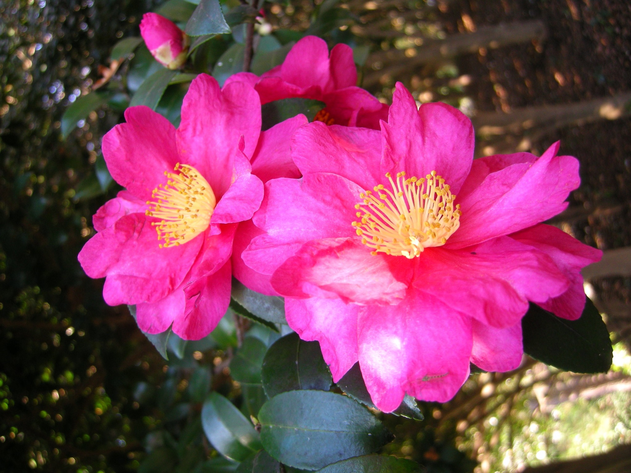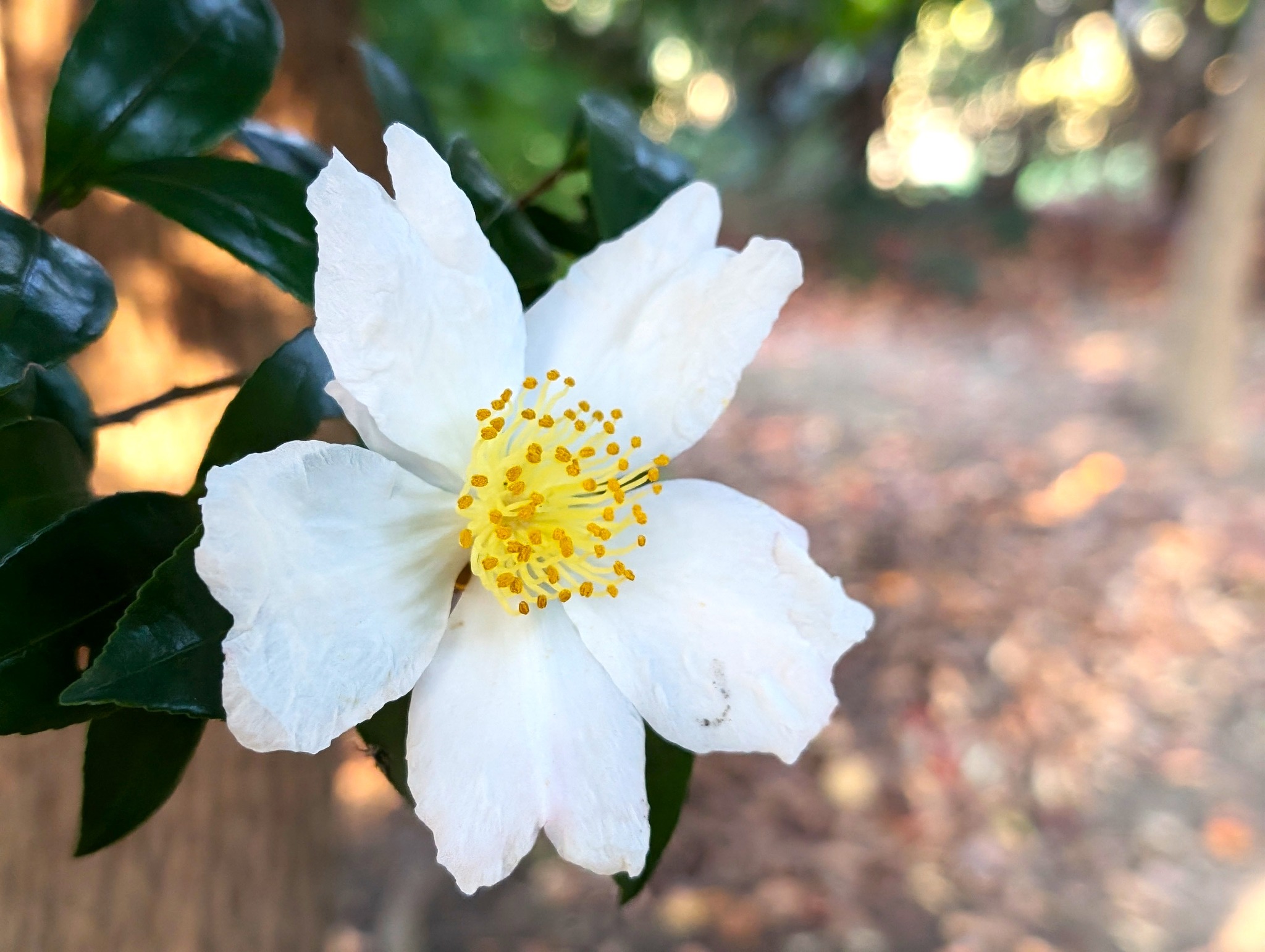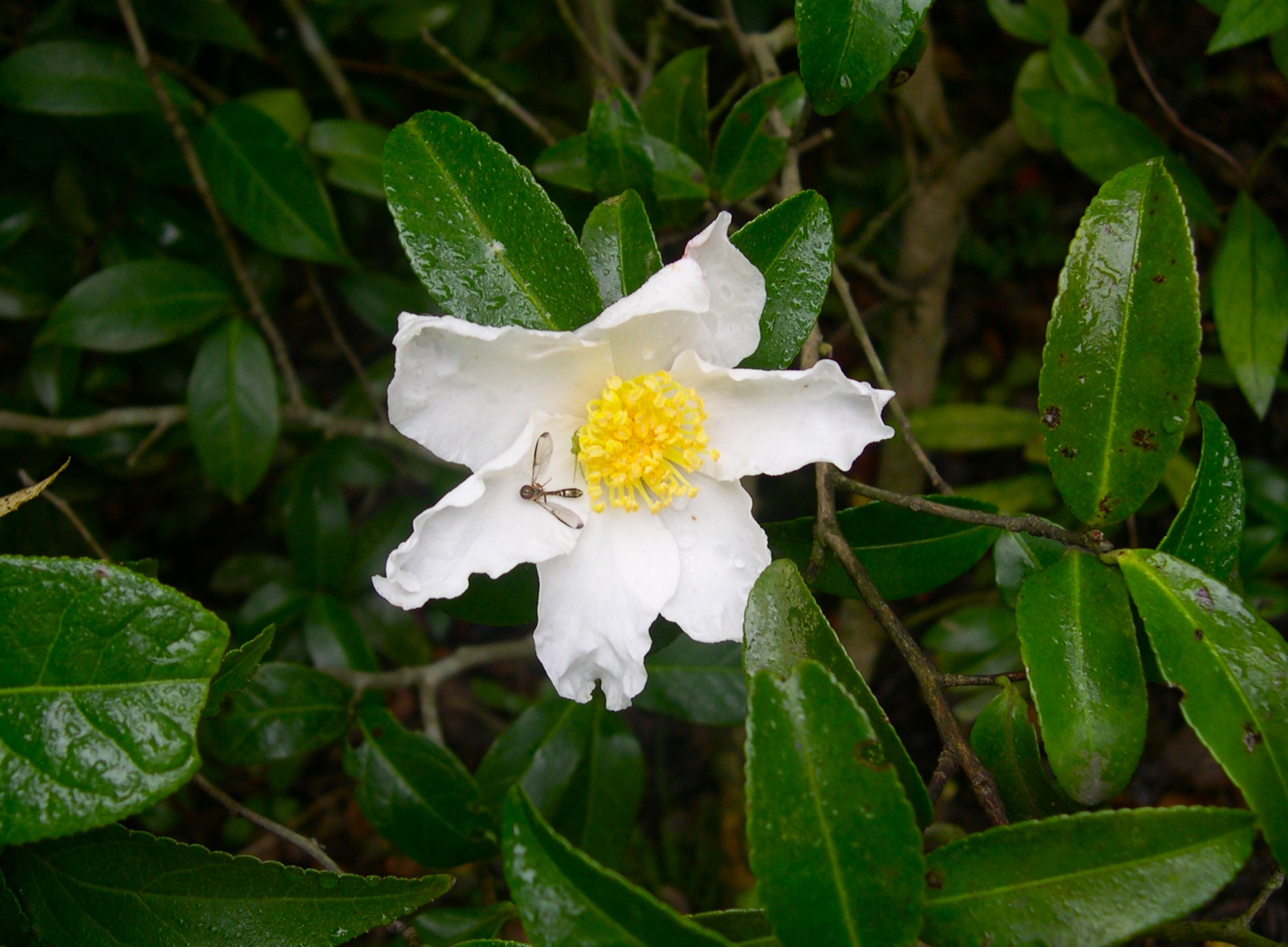 童謡「たきび」に“さざんか さざんか 咲いた道”と歌われているように、身近に見られる秋の花の一つです。