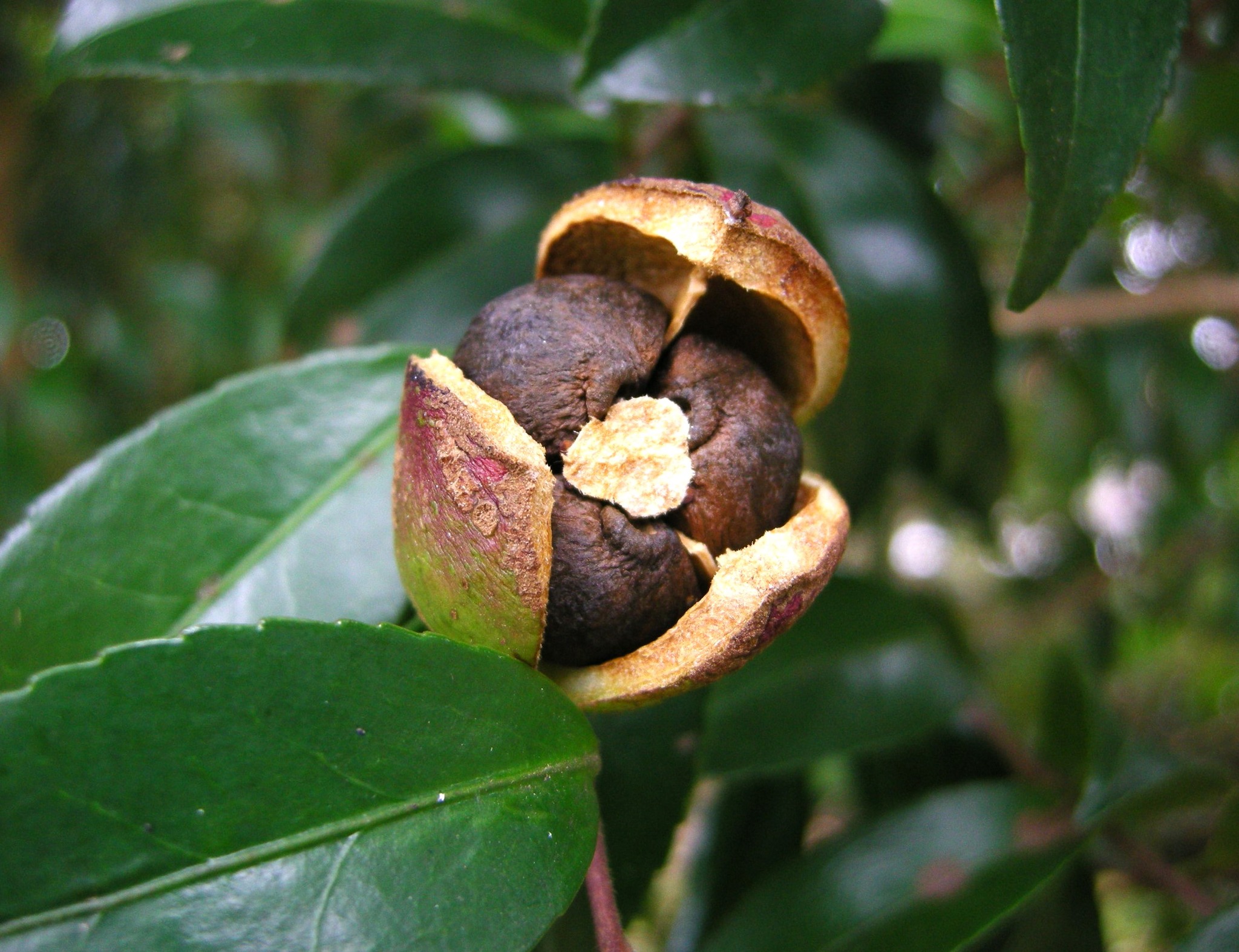 花後できる果実の中の種子からは、椿油同様に、山茶花油が採れますが、収量が少ないので一般に出回るには至っていません。
