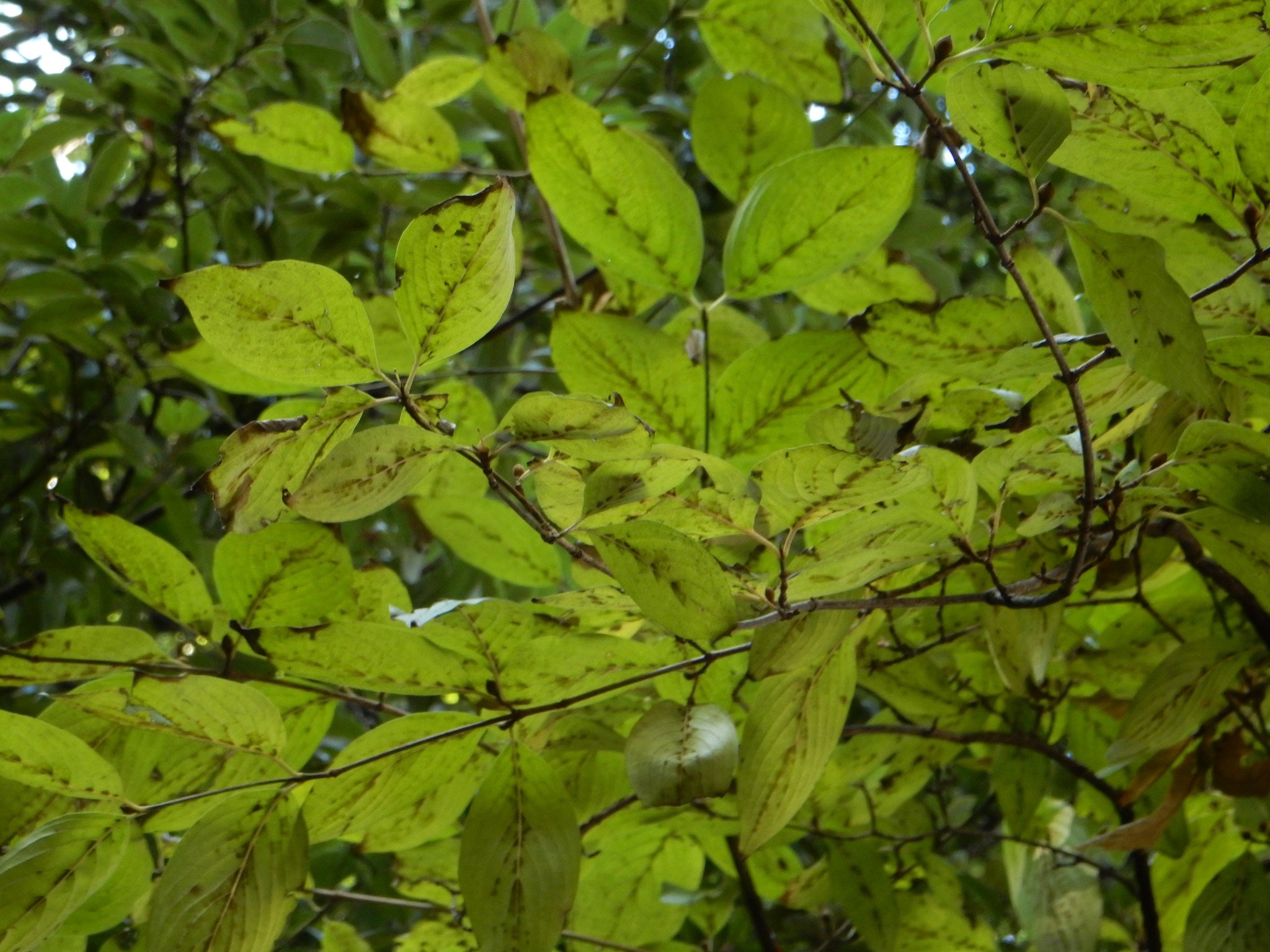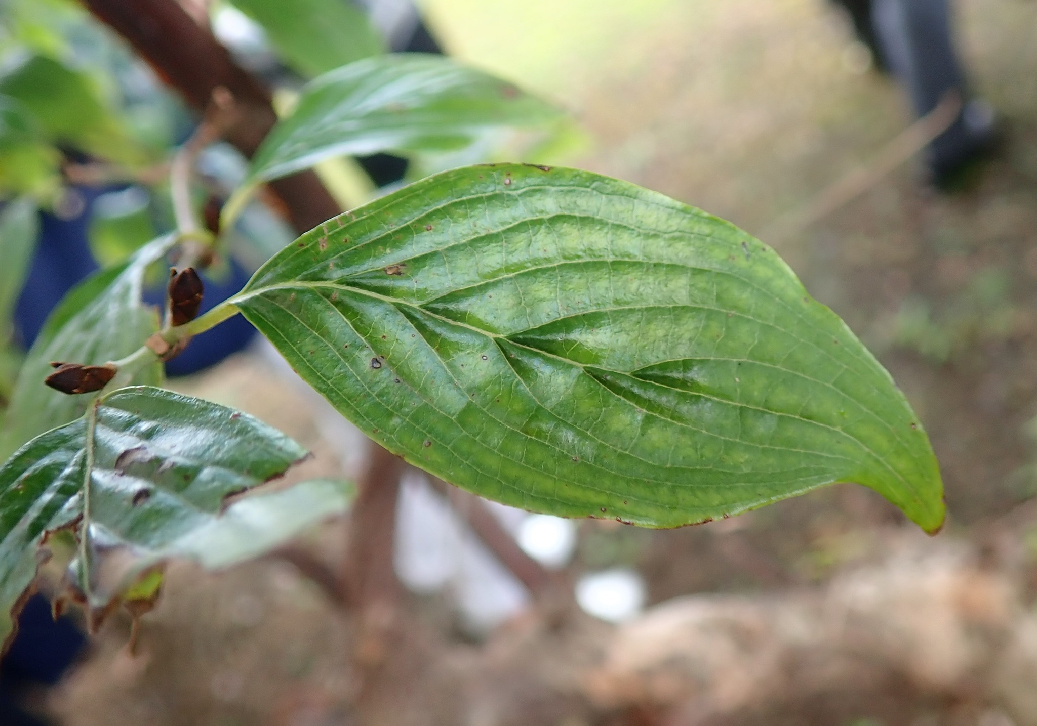 葉を裏側から見ると、葉脈の分かれ目に黄褐色の毛が密生して黒っぽく見えます。ダニ(人間に危害を加えることはない種類)を住まわせている部屋だという説があります。
