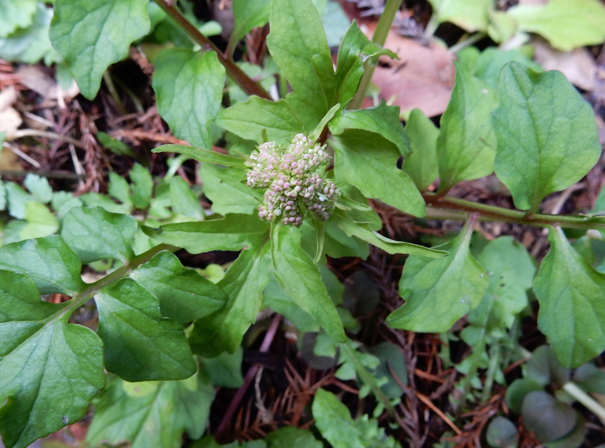地面から10㌢余り、茎を伸ばした先端に花芽をつけます。小さい花の集合で、開花時は白色に見えるのですが、花弁の裏側がほんのり紅色を帯びていますので、つぼみの時は少し紅を帯びて見えます。この姿を鹿の子絞りに見立てた名という説があります。