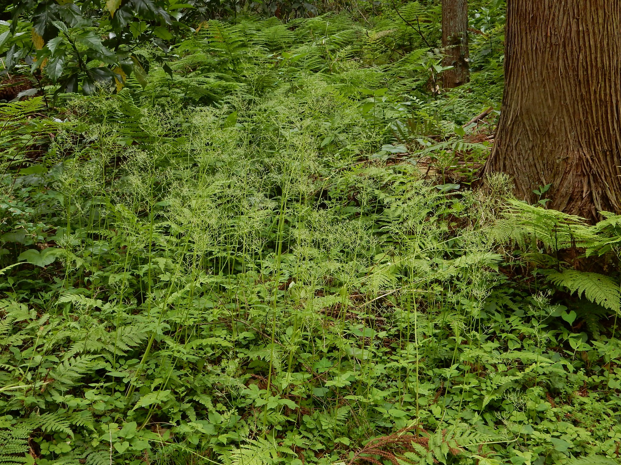 山地の木陰などで、やや湿り気のある場所で普通に見られる多年草です。