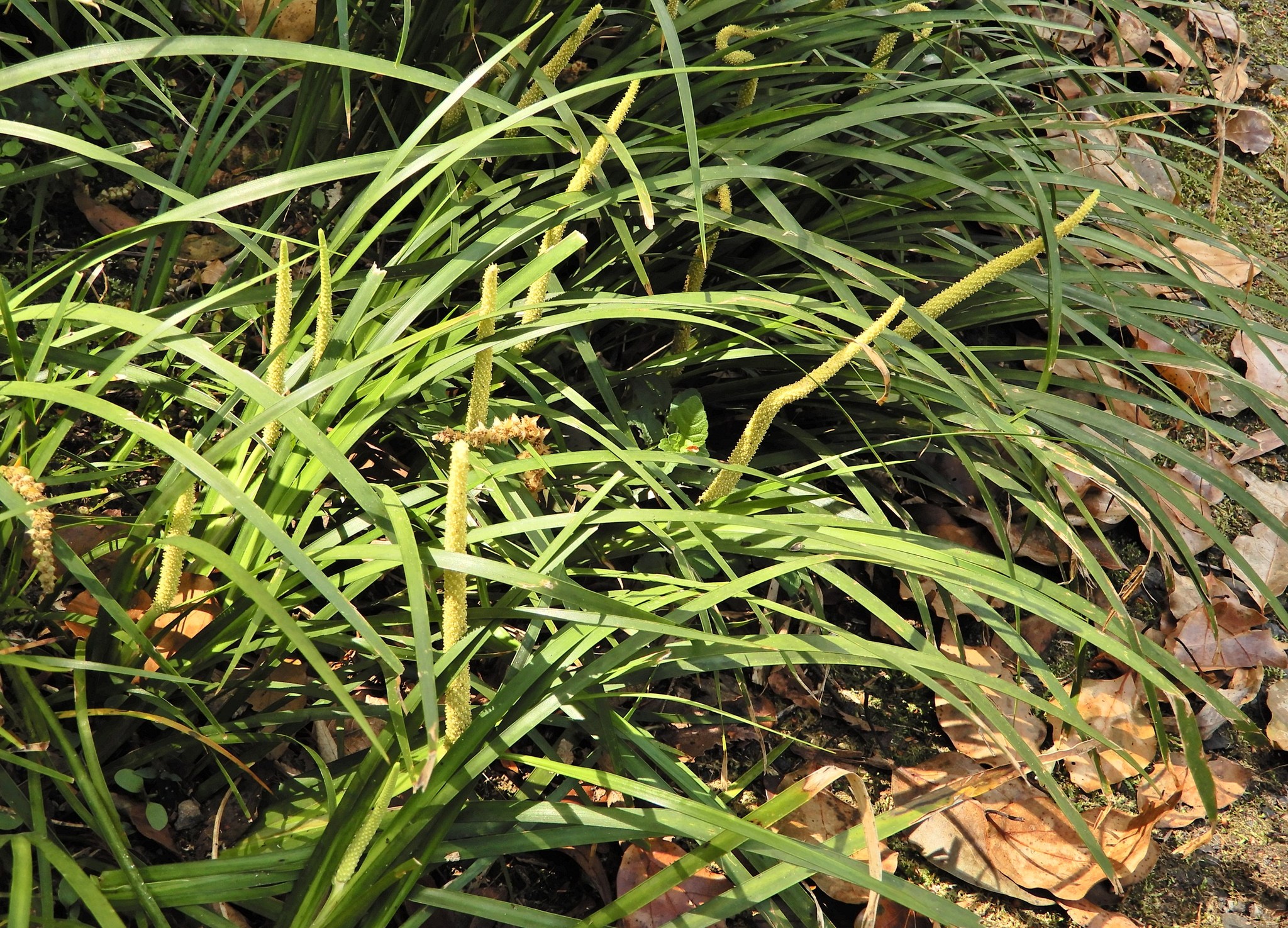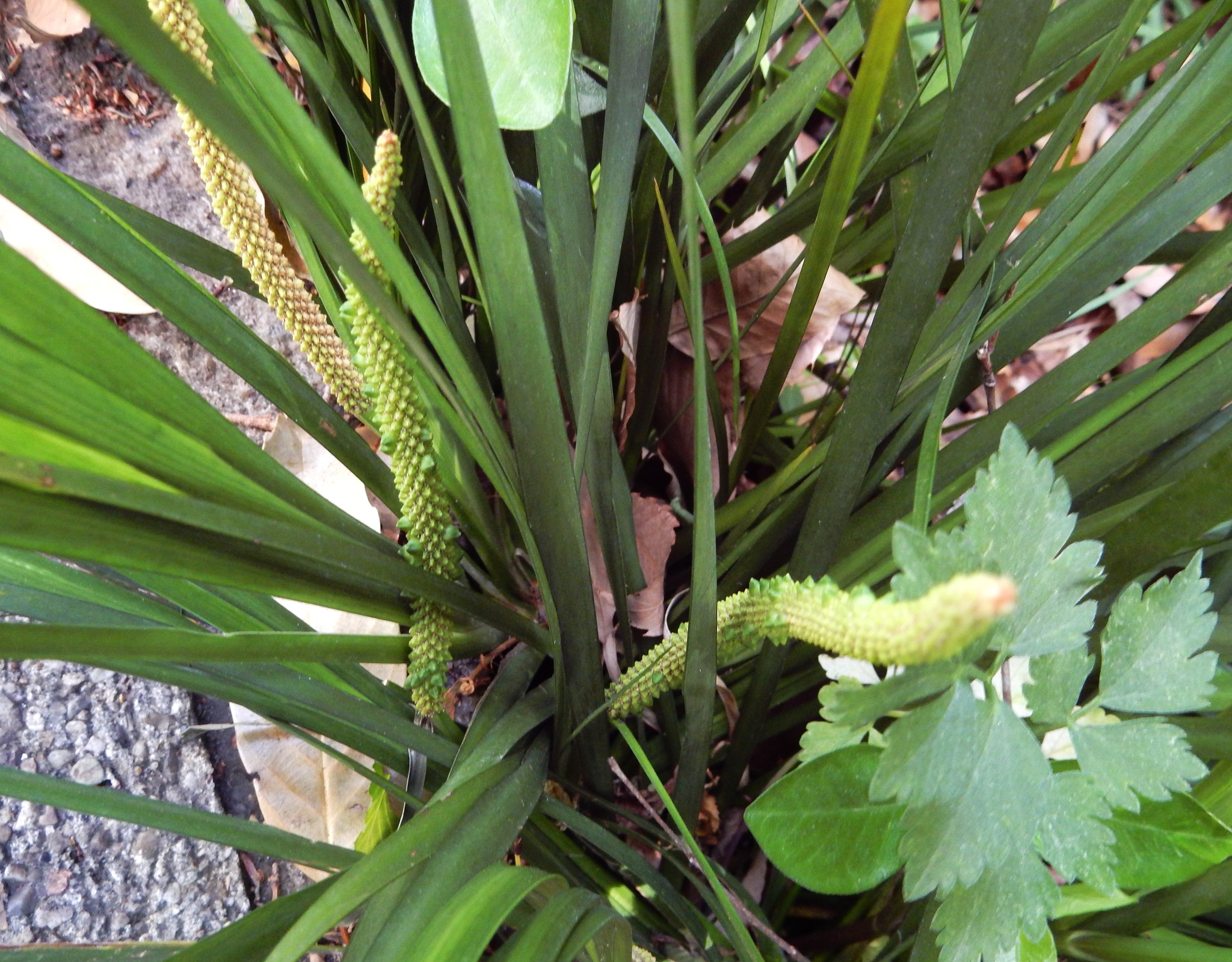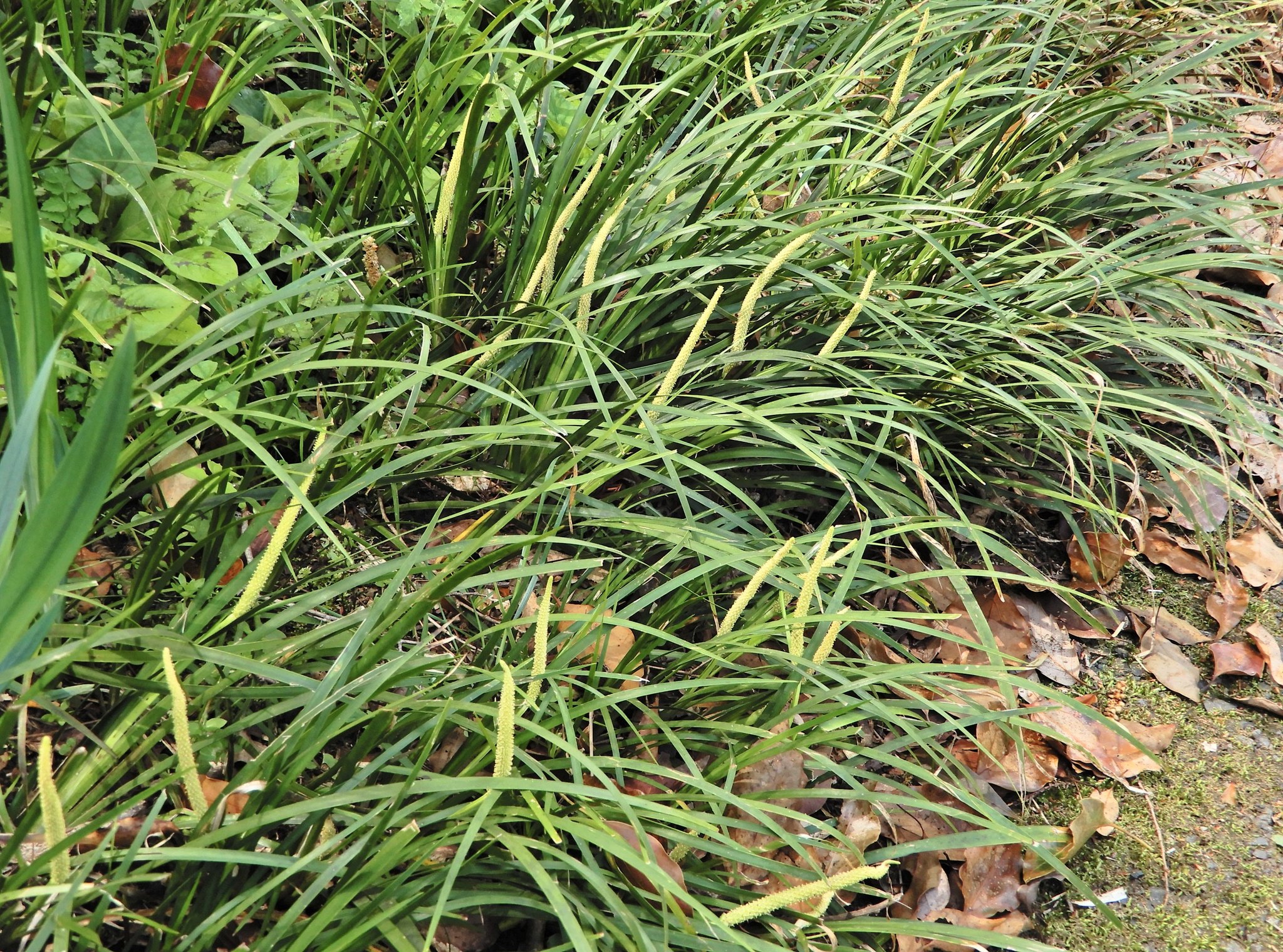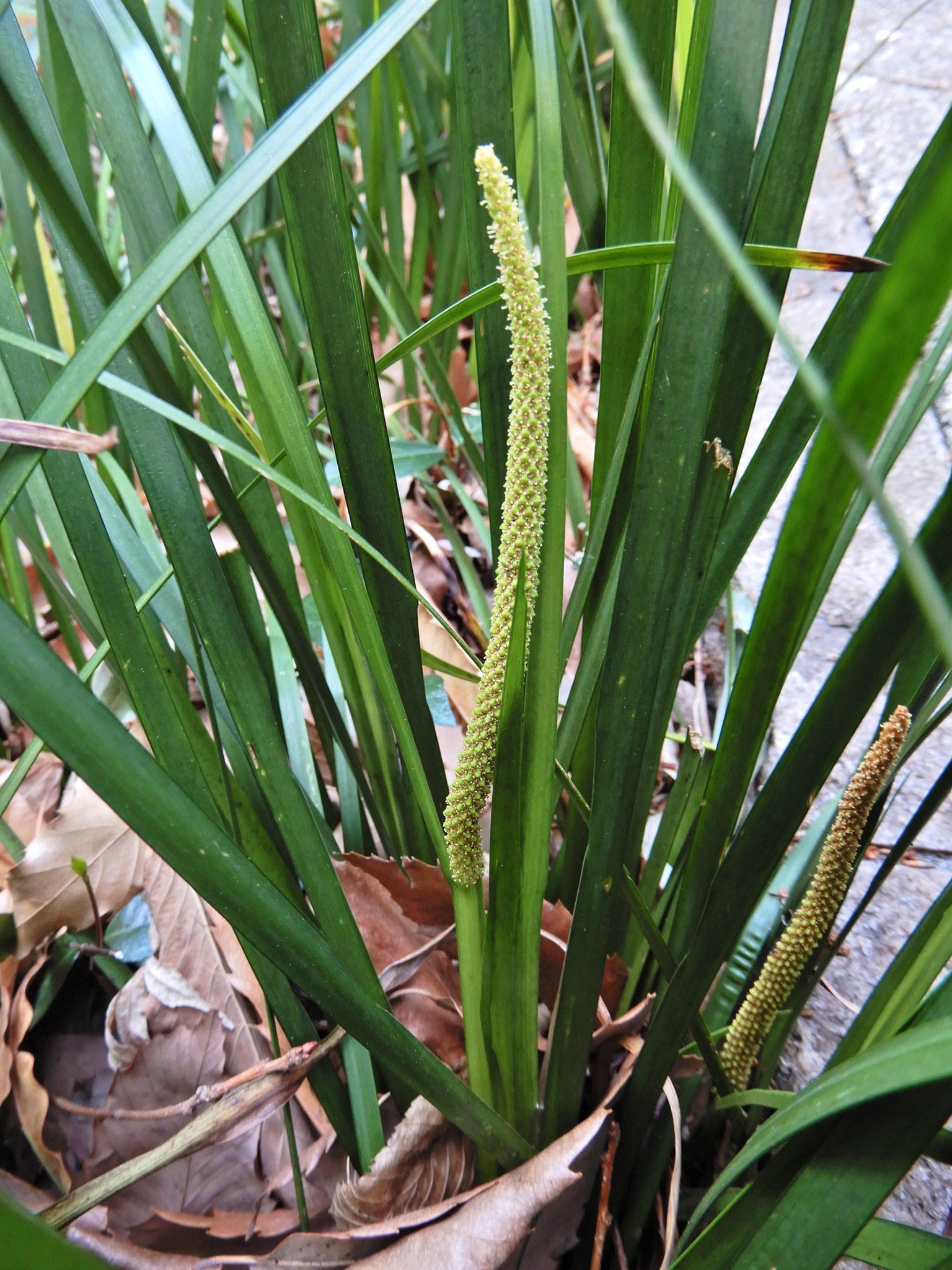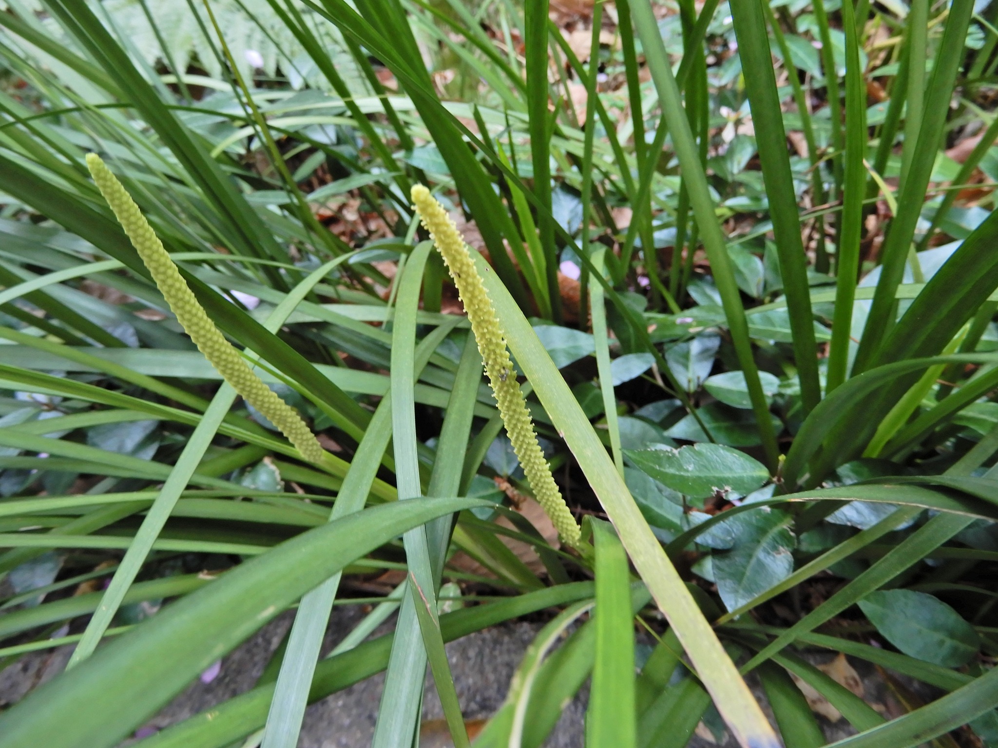 端午の節句に飾るショウブ(菖蒲)に似ていますが、全体に小ぶりです。ショウブが葉の中央部分の脈が鮮明なのに対して、セキショウは細い葉の中央部分の脈が不明瞭です。太いひげ根で石を抱くように育つショウブの意からの名前と言いう説があります。
