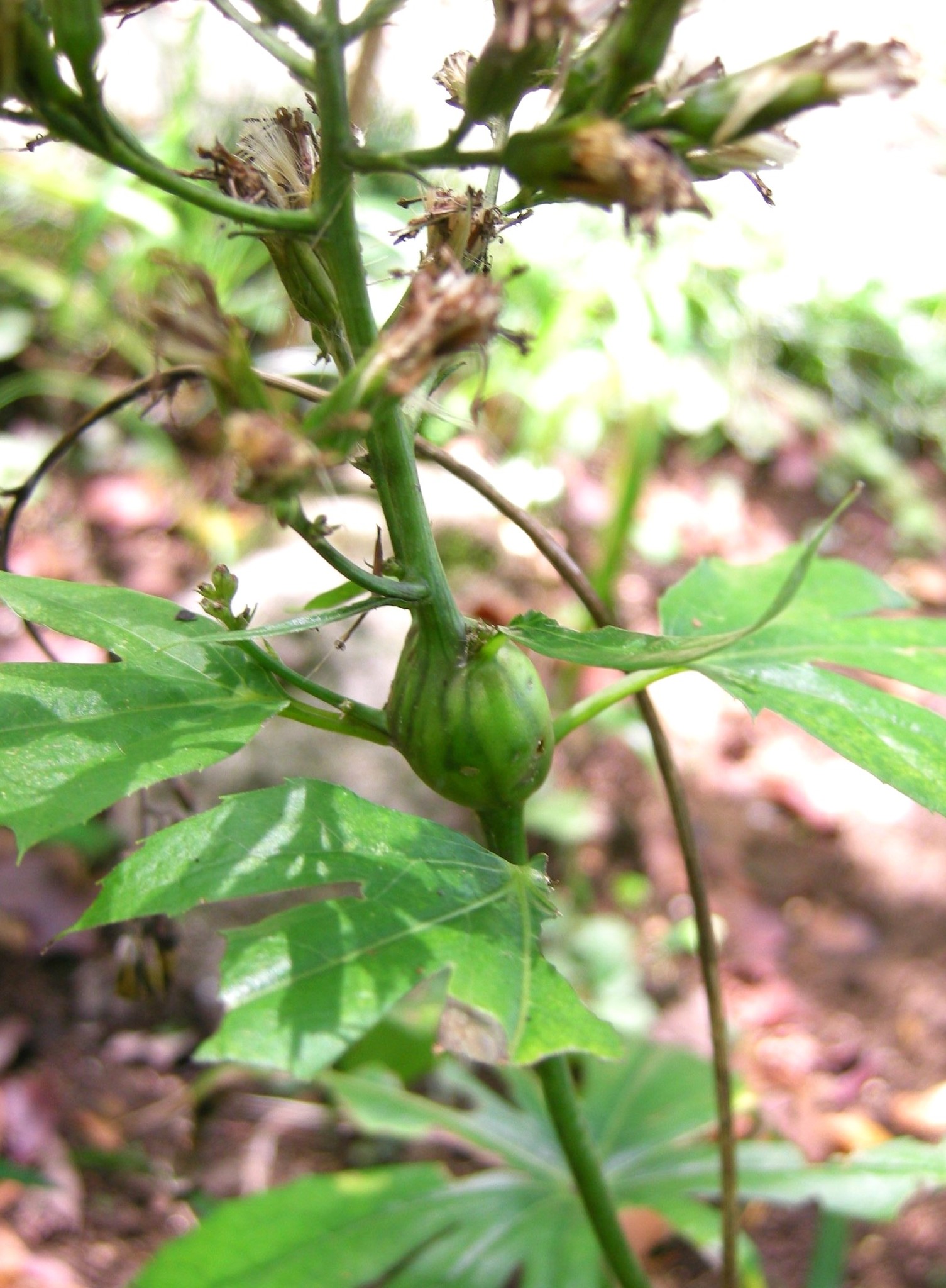 夏が近づくと、茎の一部が大きく膨らんでいる株を見ることがあります。ミバエの仲間(昆虫)が産卵したことによって形成された虫こぶで、ヤブレガサクキフクレズイフシ(破れ傘茎膨れ髄五倍子)と呼ばれます。