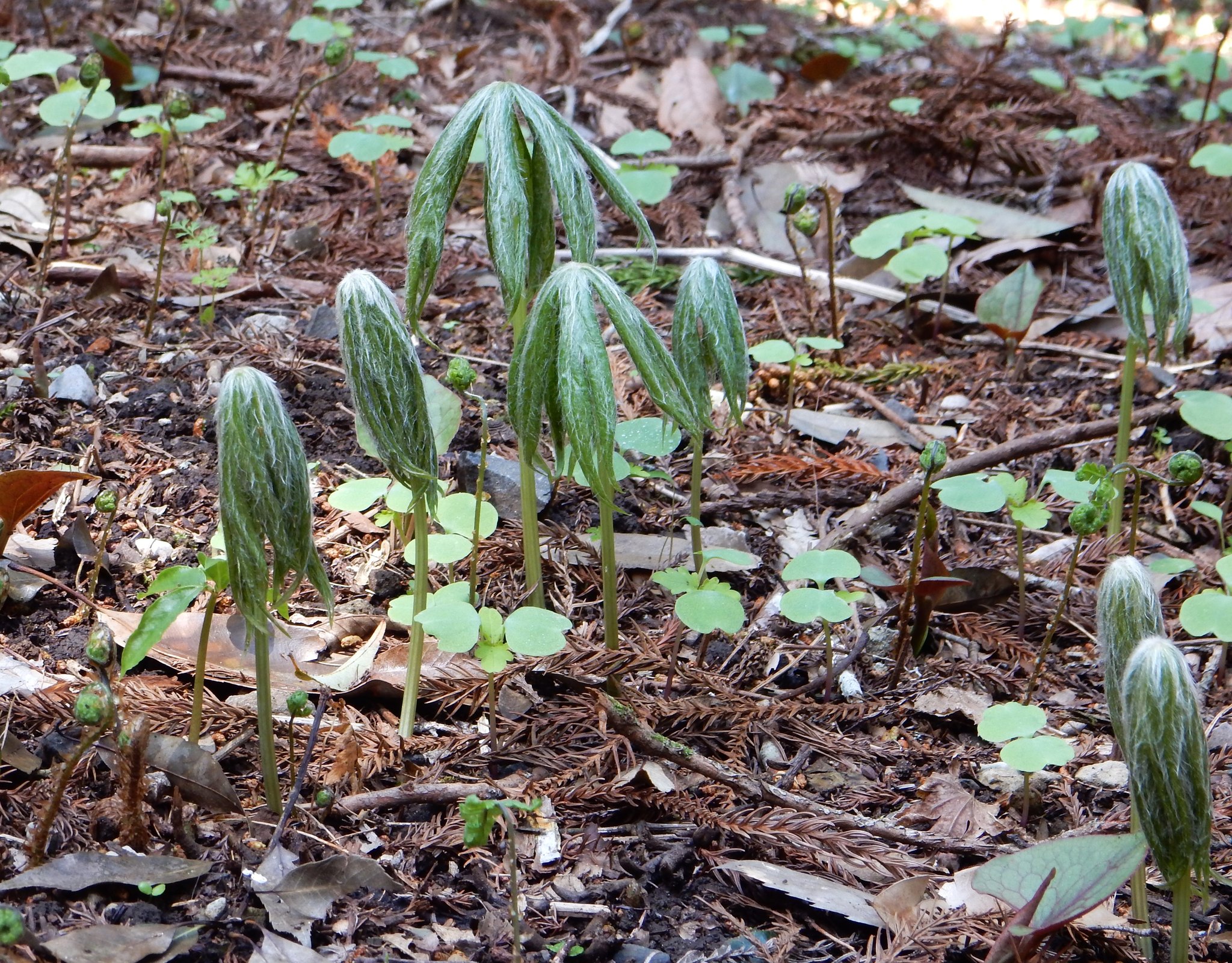 綿毛をかぶり、折りたたまれた傘のような姿、他の草が芽を出す前に出現するこの姿は、マニアックな魅力なのか、人気を集めます。