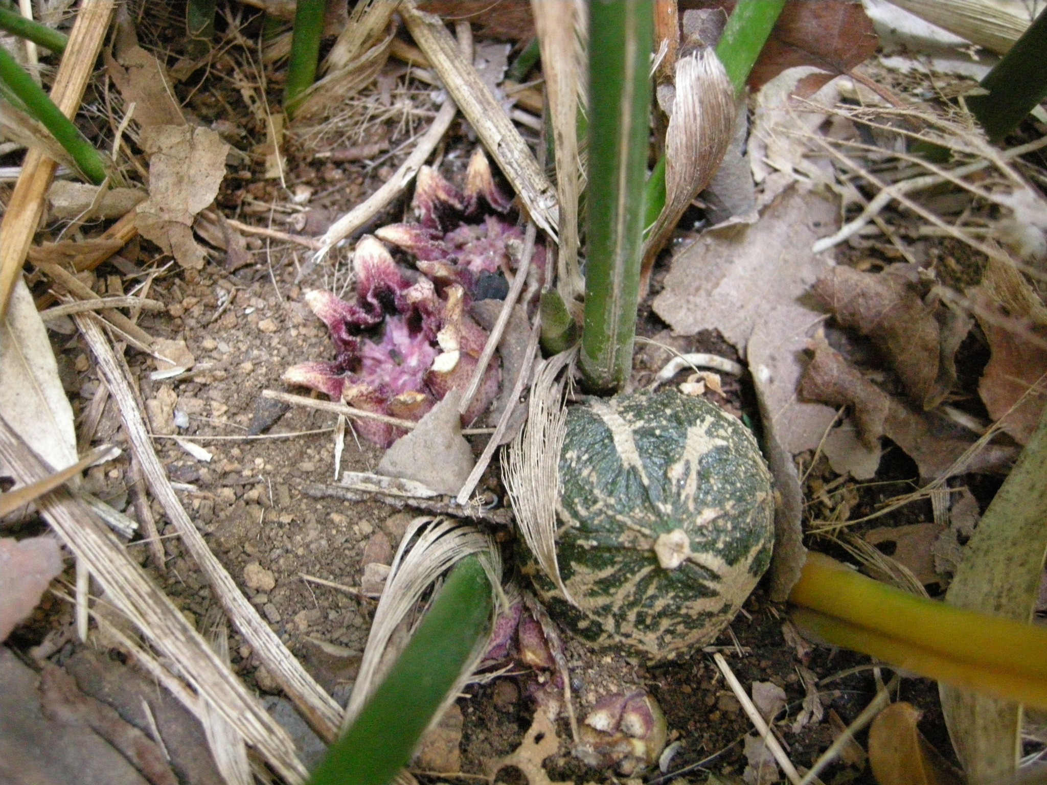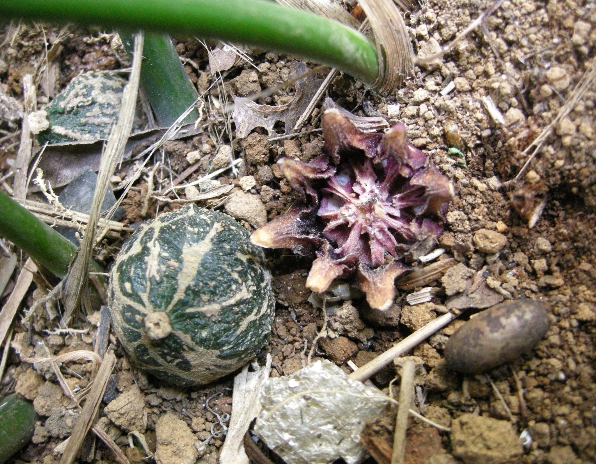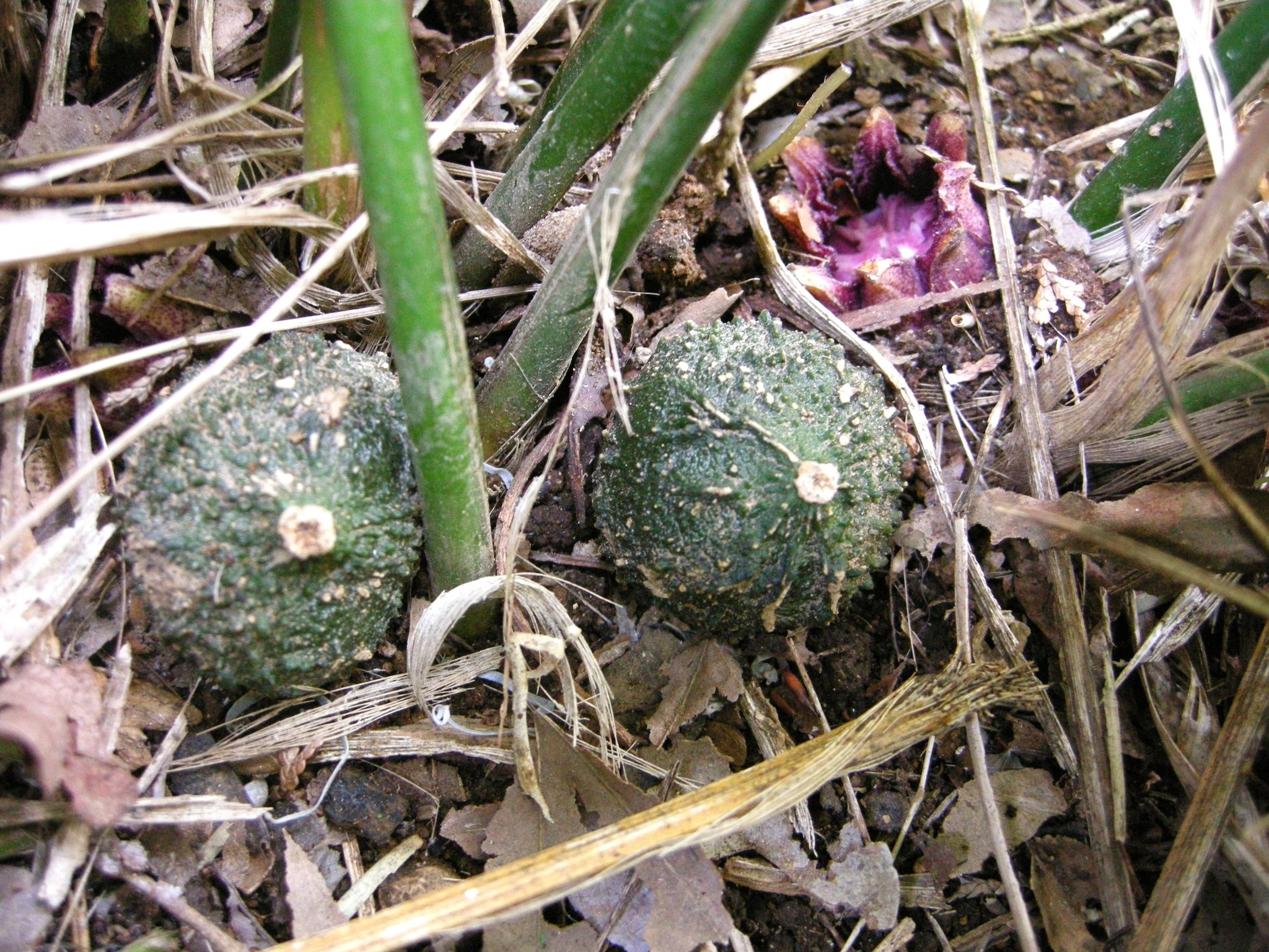 「花が咲くのですか?」「株元に虫の卵みたいなのがあります」などのご質問を頂戴します。株元をかき分けて見て下さい。地面にへばりつくように薄紫色の花が見られるかもしれません。腐敗臭と表現される臭いがあります。この臭いにハエなどが集まって受粉に貢献すると言われています。
