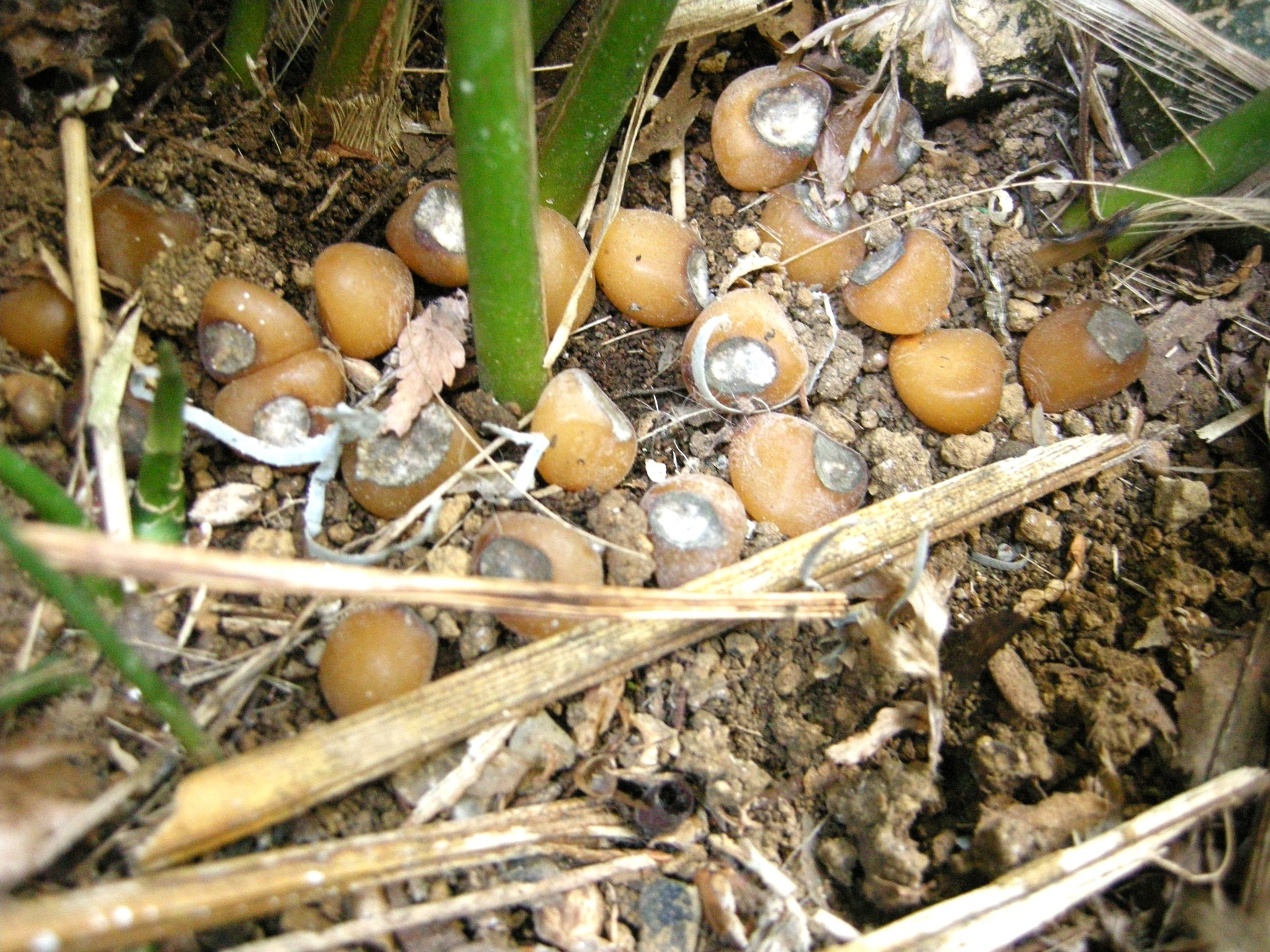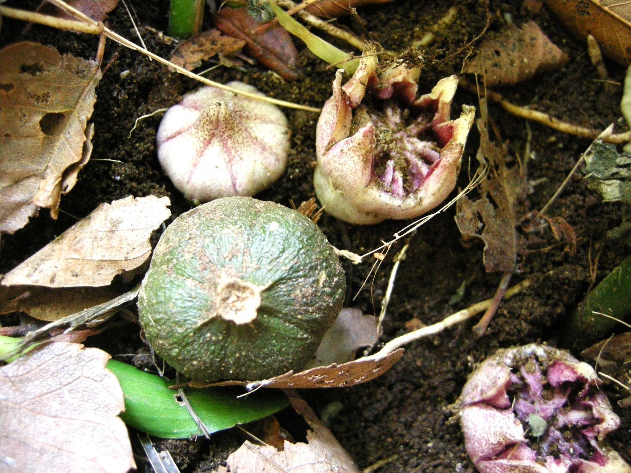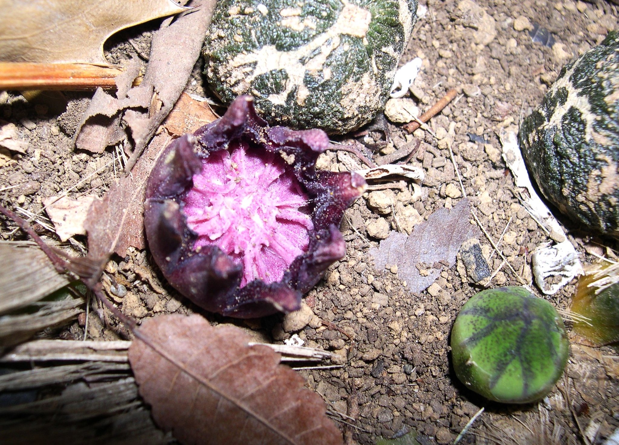 「花が咲くのですか?」「株元に虫の卵みたいなのがあります」などのご質問を頂戴します。株元をかき分けて見て下さい。地面にへばりつくように薄紫色の花が見られるかもしれません。腐敗臭と表現される臭いがあります。この臭いにハエなどが集まって受粉に貢献すると言われています。