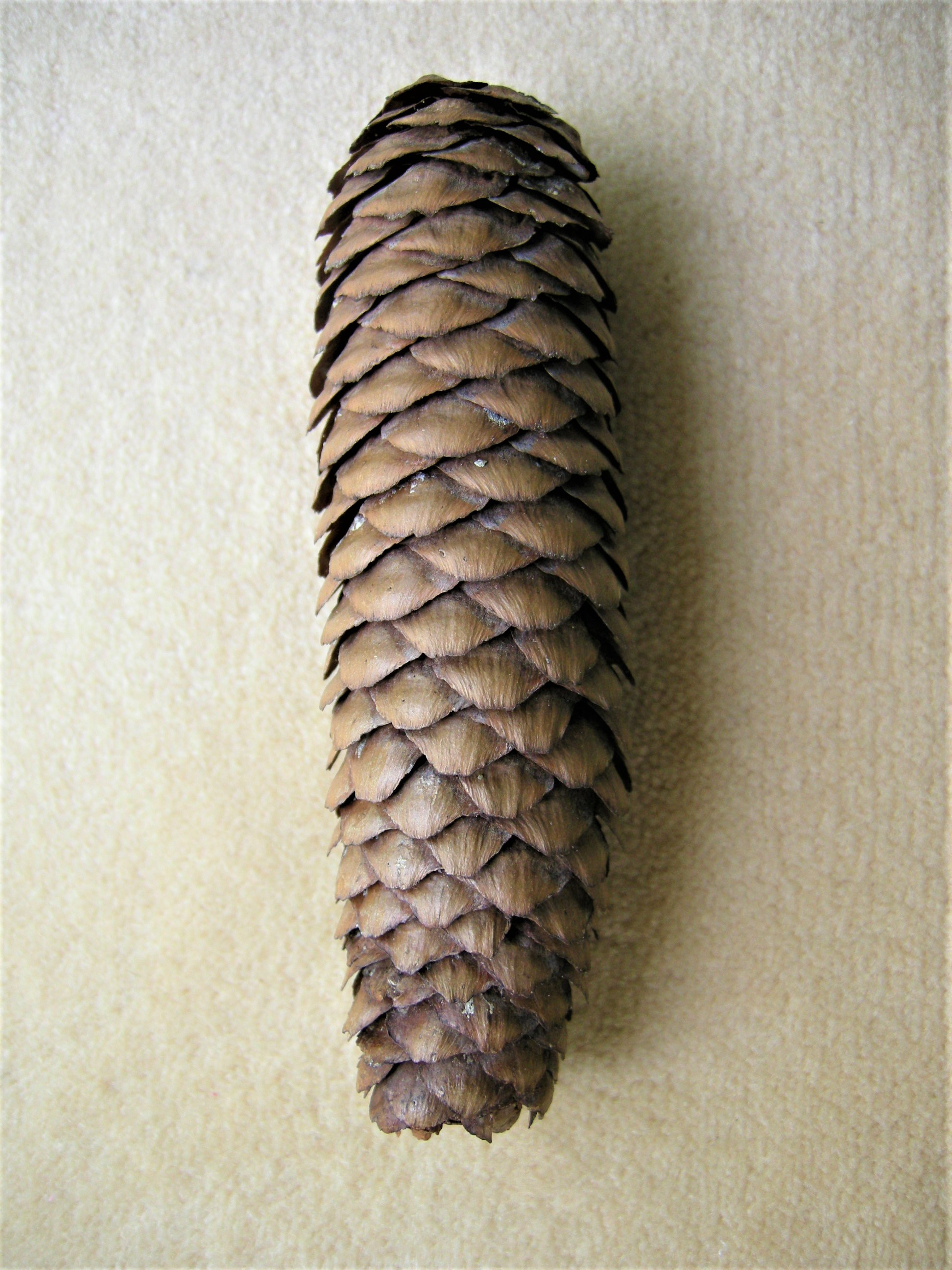 球果が上に向いて着き、熟すと鱗片は中軸だけ残して落ちてしまうモミに対して、ドイツトウヒは下に向いてつき、鱗片の間から種子を放出し、崩れることはありません。