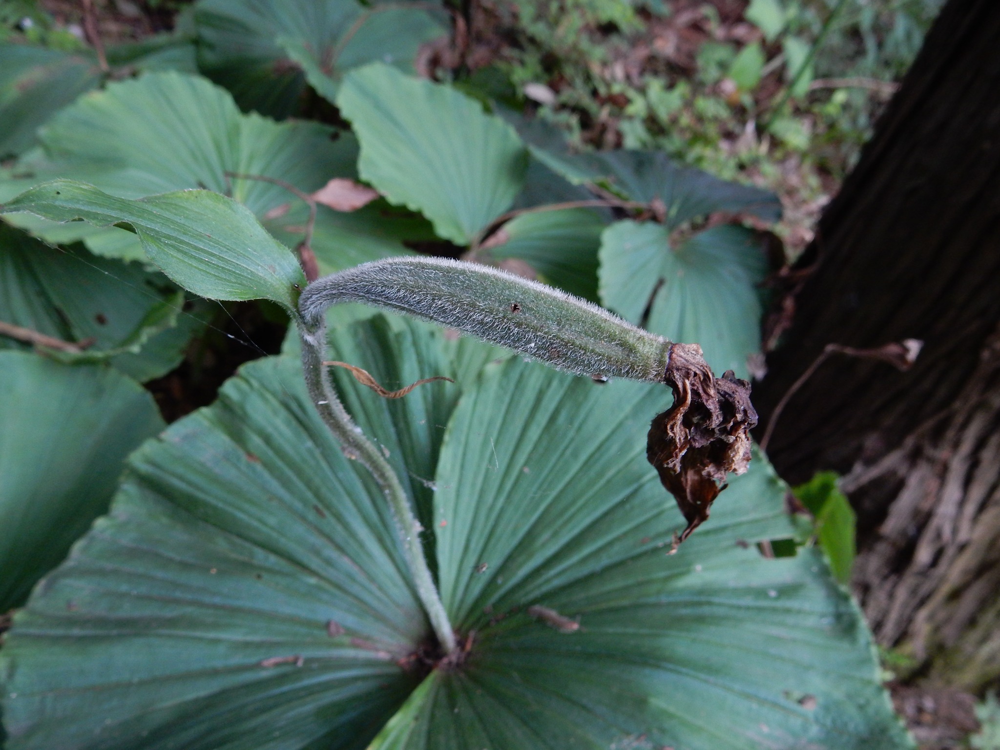 虫は逃げ道を探して奥の方に進み、上の方に見える出口に向かいます。狭い出口をくぐる時、背中に花粉をつけていきます。次の花に入るとき、受粉に貢献することになりますが、受粉の機会は少ないようで、結実している株は稀です。