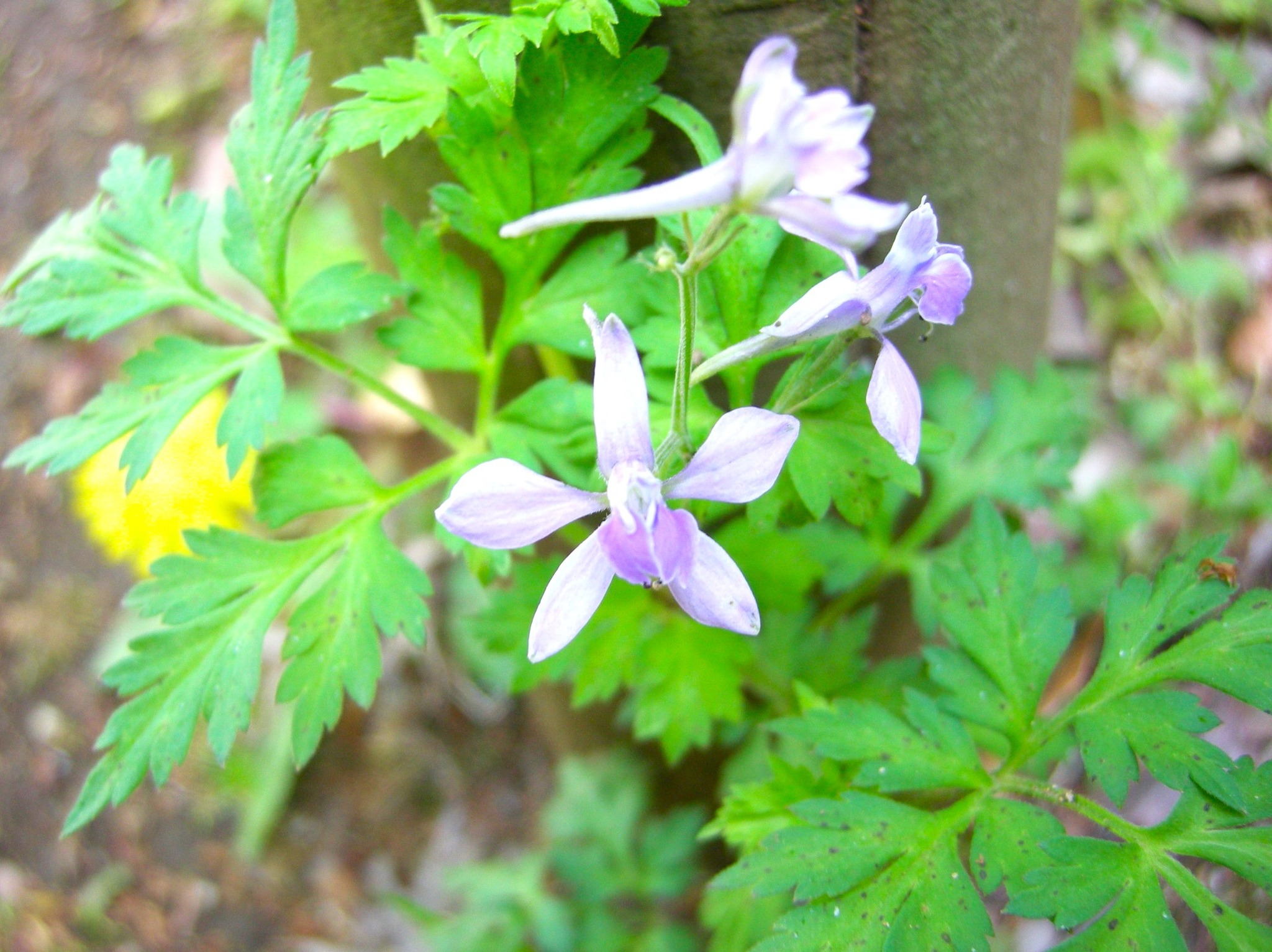 葉がセリ(芹)に似ているヒエンソウという意味です。花には距(きょ)と呼ばれる尖った部分があり、蜜を溜めて虫を呼んでいます。この花の姿を飛翔するツバメの姿に見立てた名前といわれています。