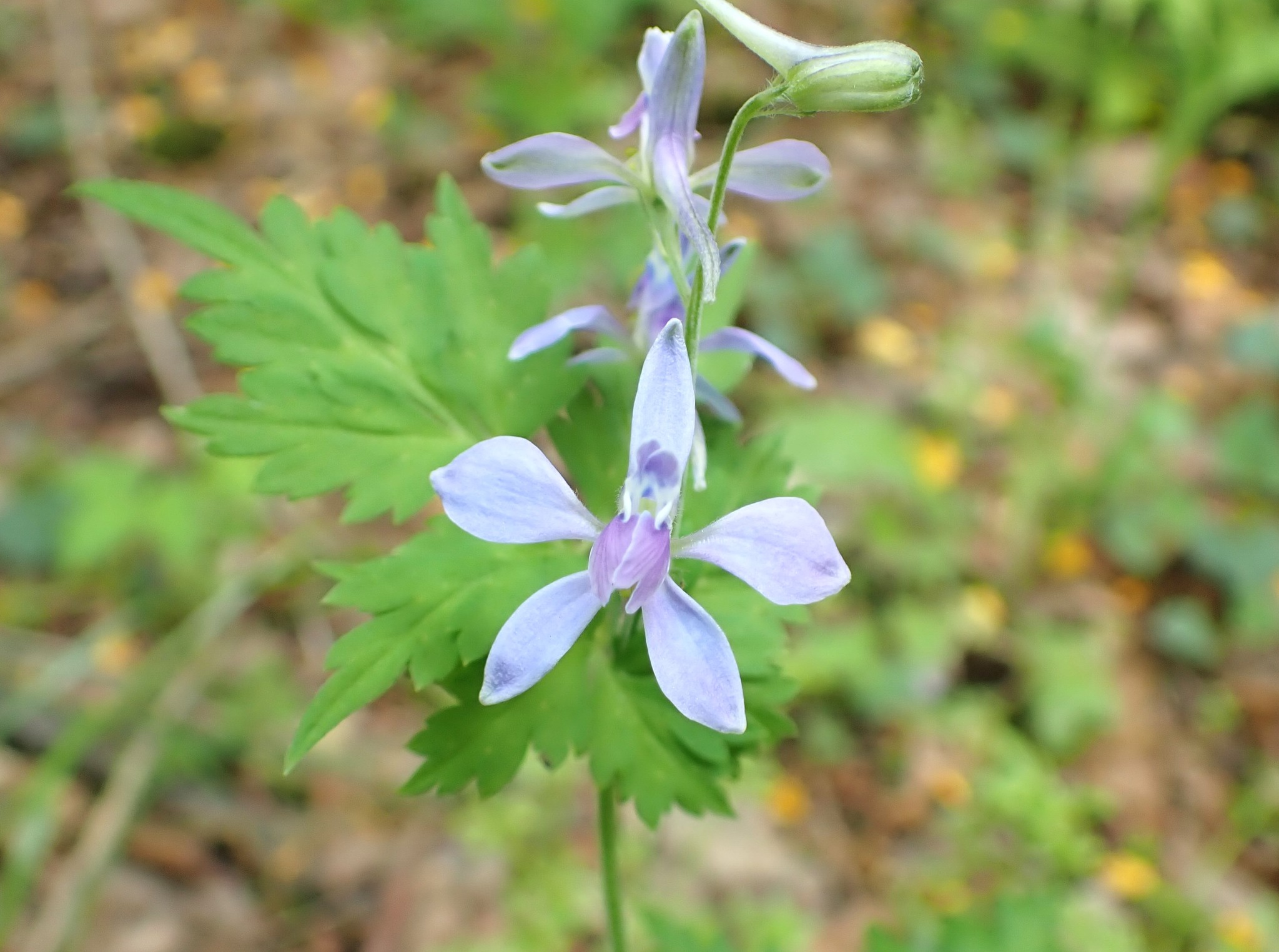 デルフィニウム(オオヒエンソウ 大飛燕草)と呼ばれる園芸種と同じ仲間ですが、園芸種が1㍍を超える大型なのに比べて、セリバヒエンソウは20㌢余りと小ぶりです。