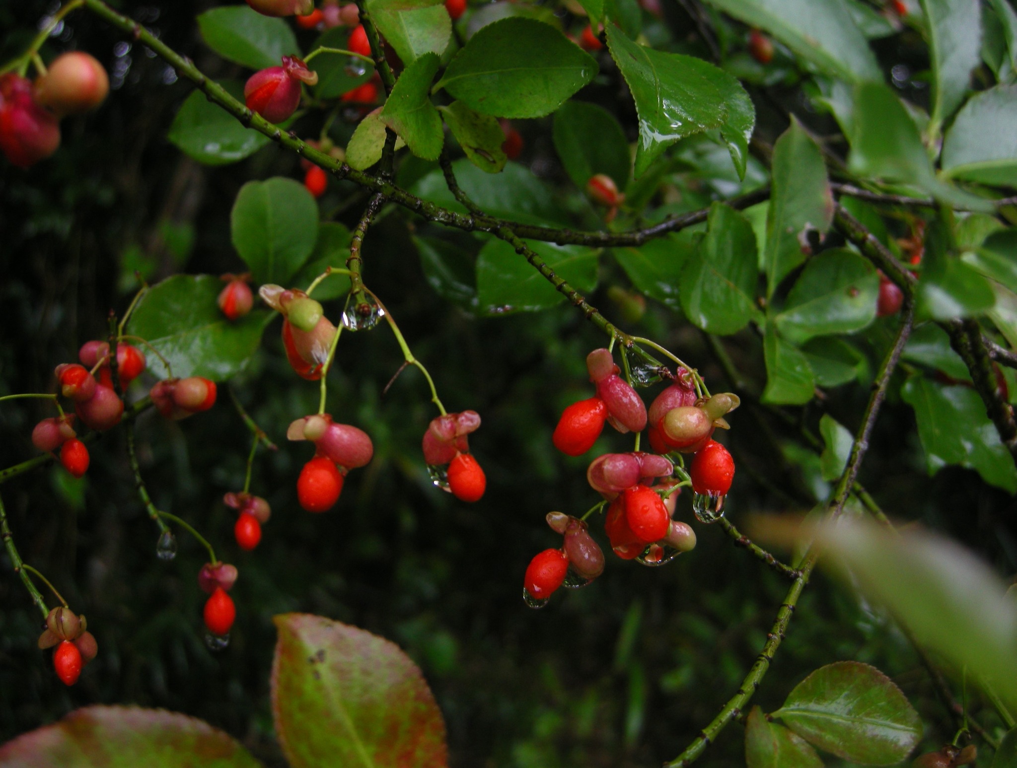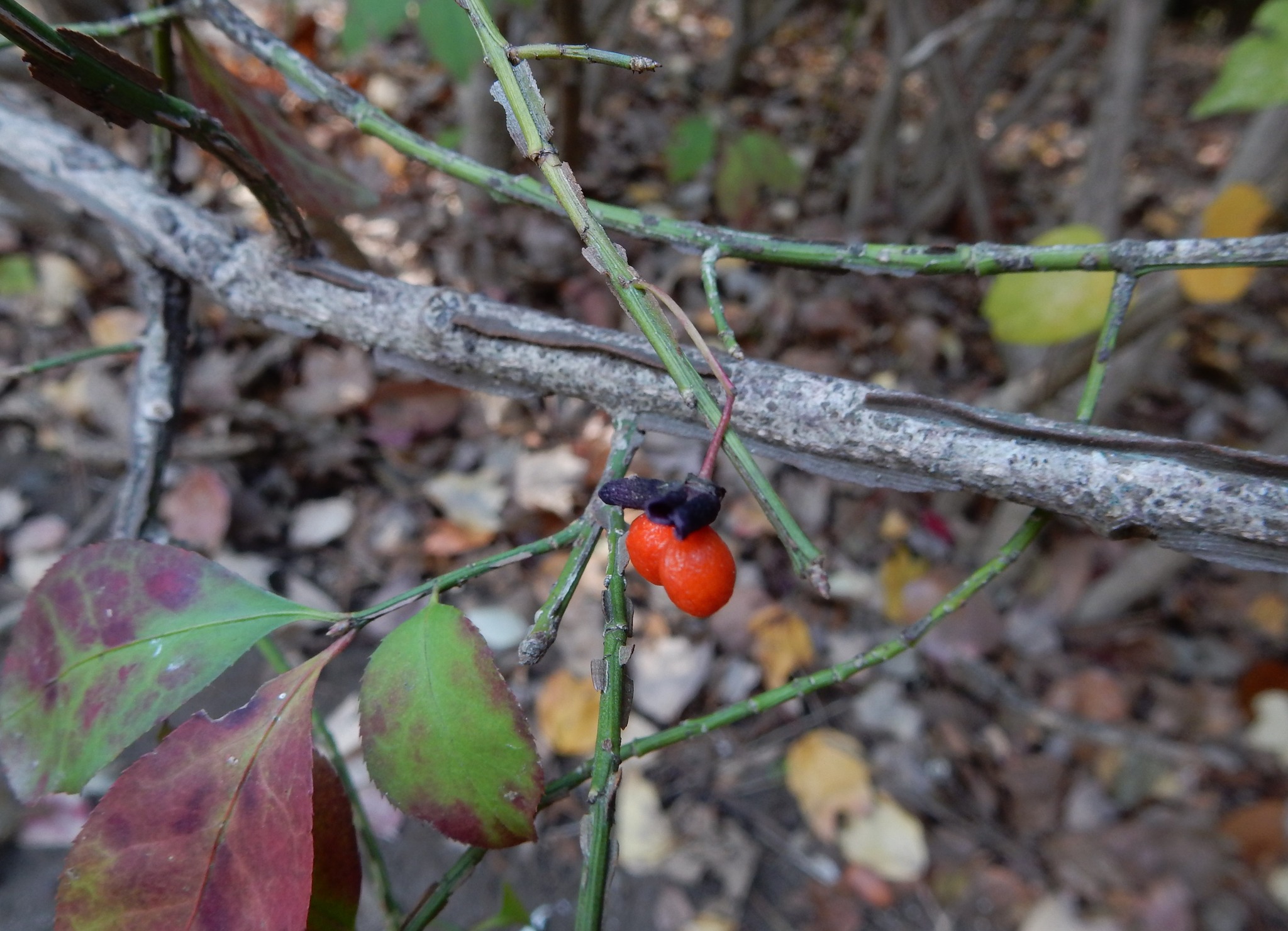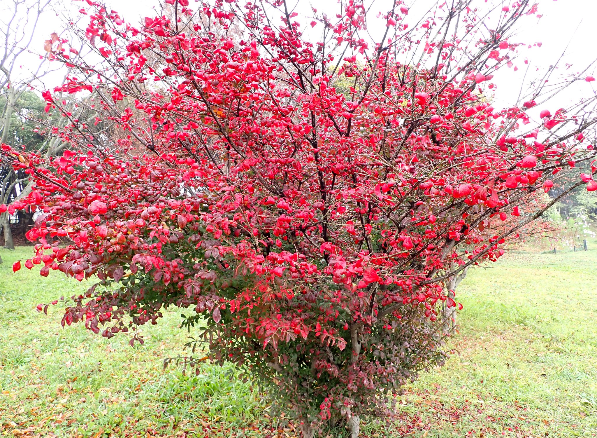 結実した小さな果実は秋が深まるころに果皮が裂けます。裂け目から赤い皮を被った種子が顔をだして人気を集めます。有毒ですから、注意してください。