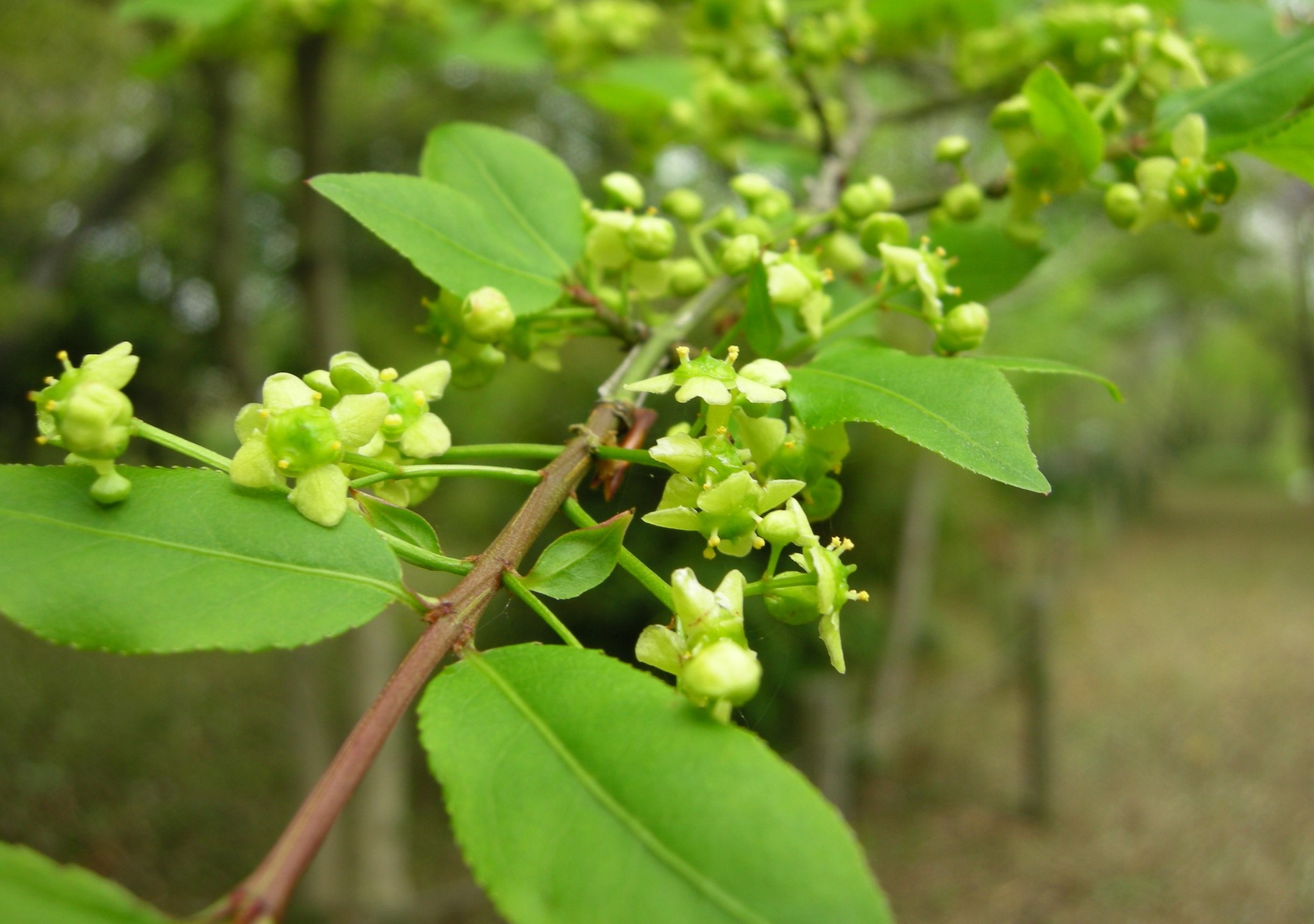 初夏に咲く花は黄緑色で目立ちませんが、雌しべの根元の花盤(かばん)と呼ばれる部分から染み出す蜜に、ハチやアブ、アリなどの虫が集まります。