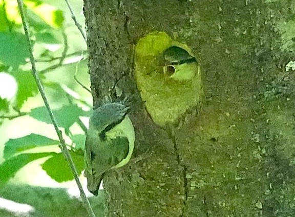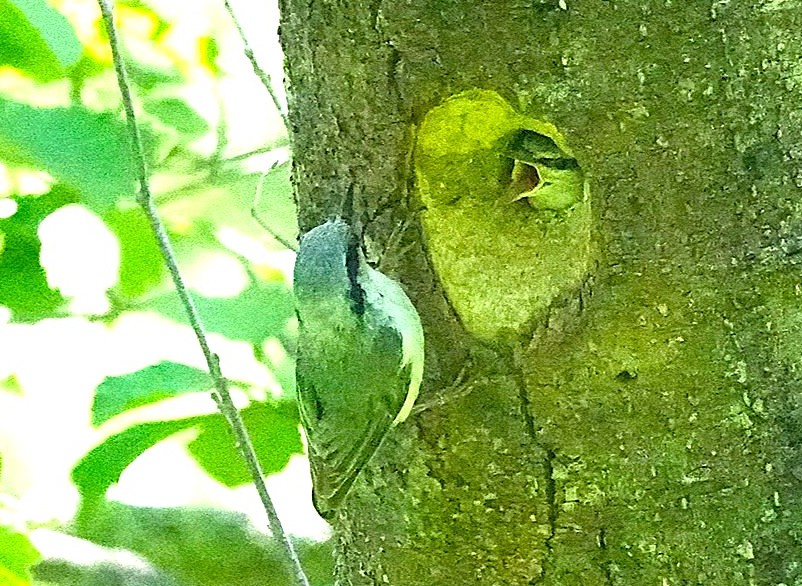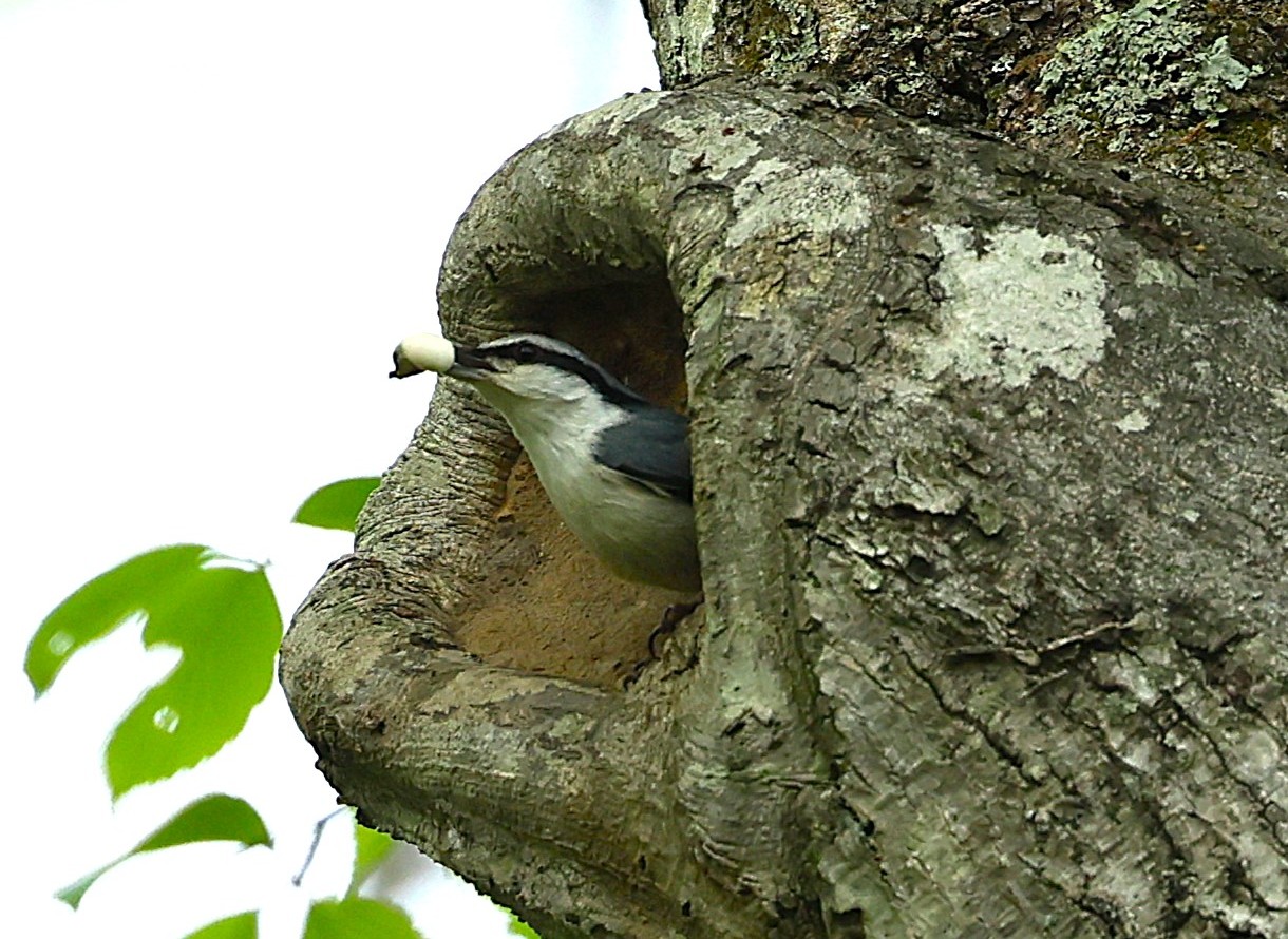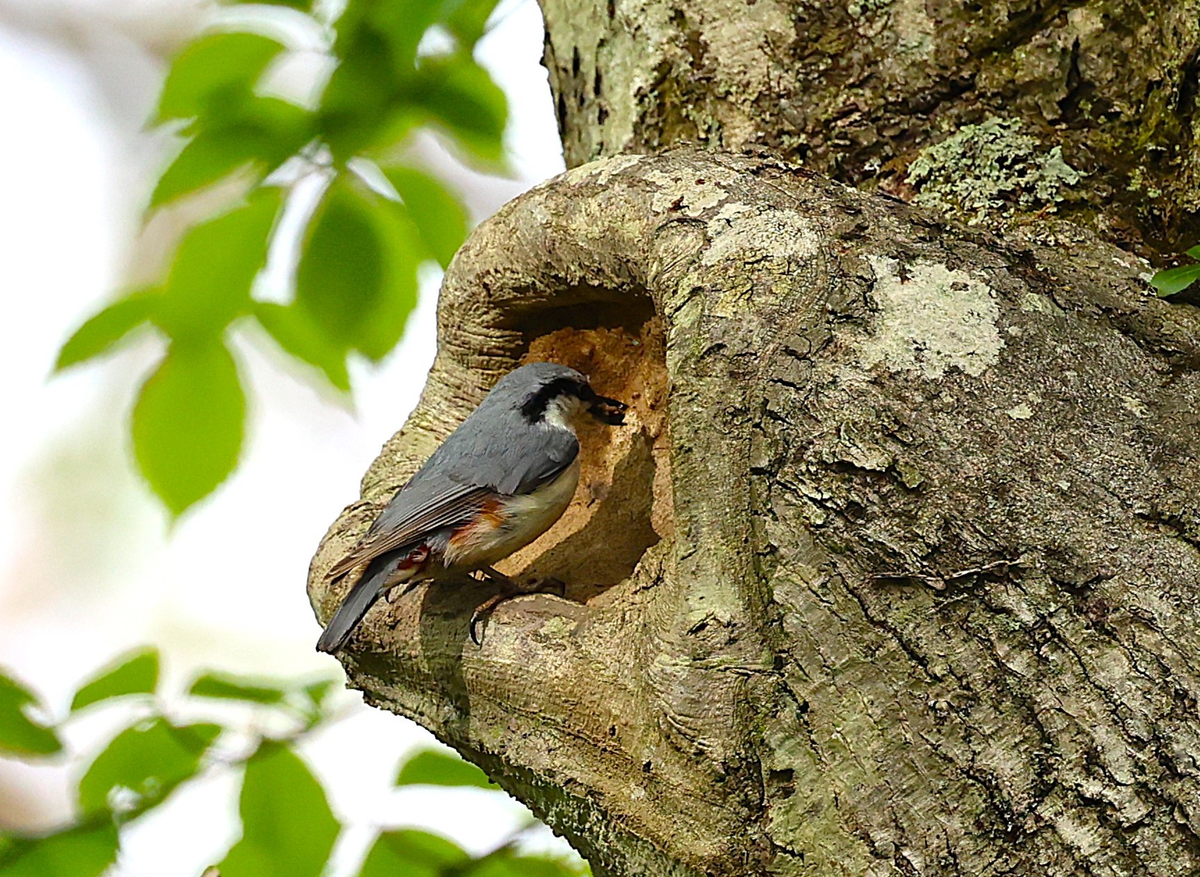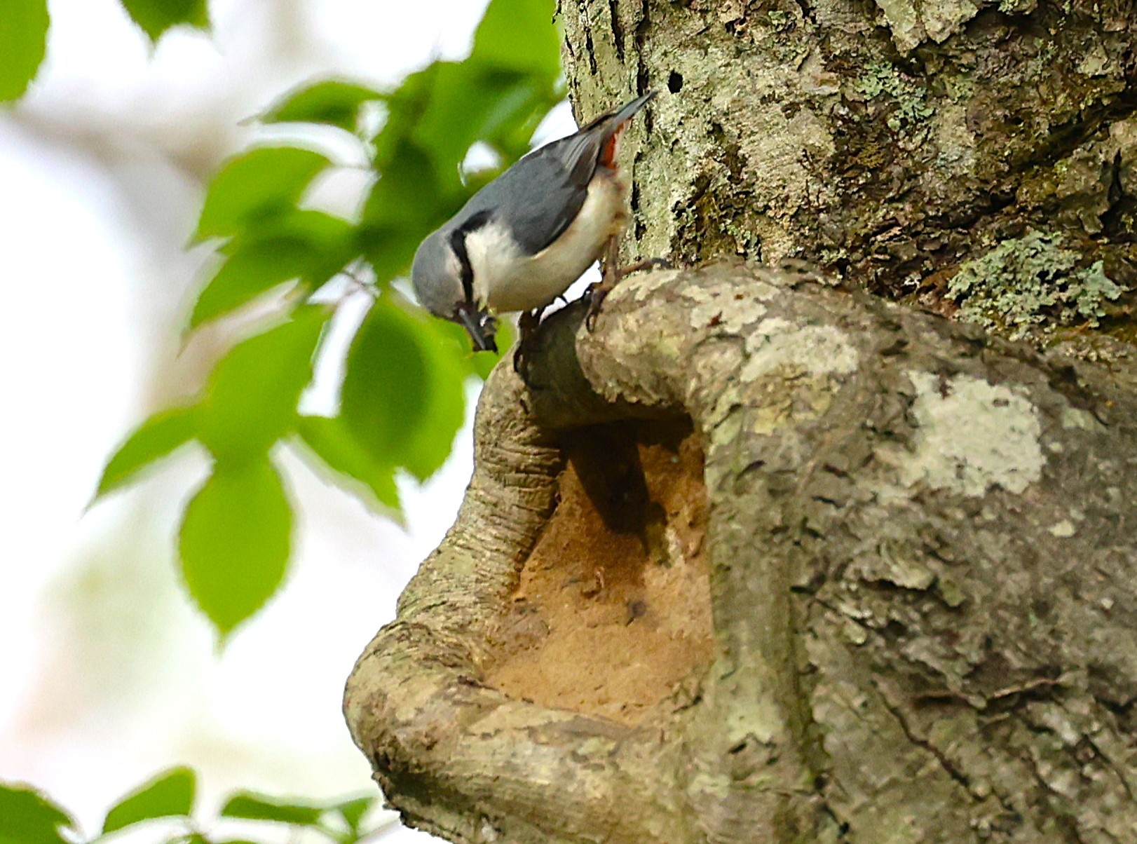 巣は樹洞の他にキツツキが空けた古巣を利用する事も有ります。入口が大きすぎるとせっせと泥を運んで入口を塗り固め、丁度良い大きさにして使います。