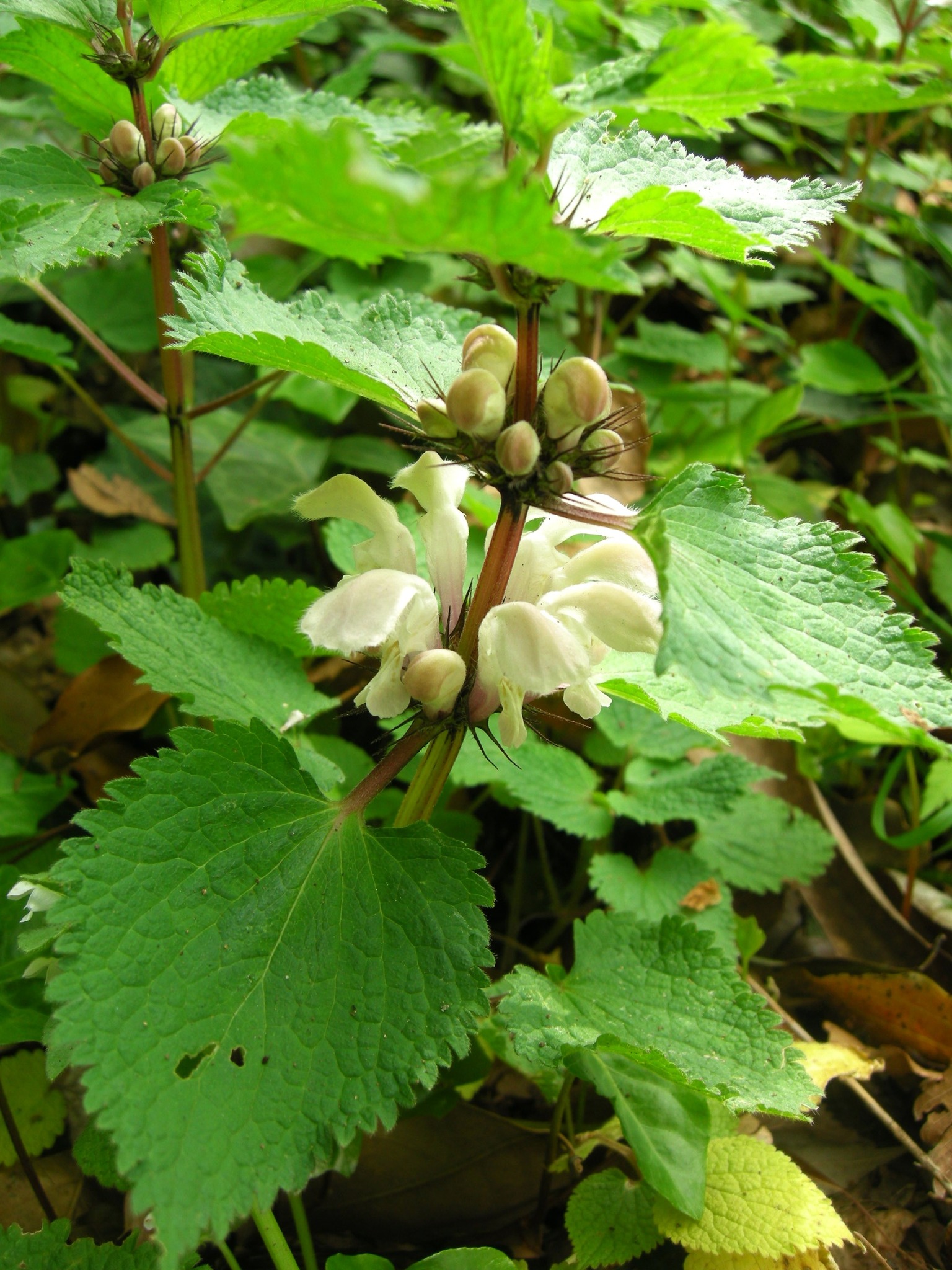 シロバナヒメオドリコソウの場合、開花時の茎頂の葉は緑色のままです。