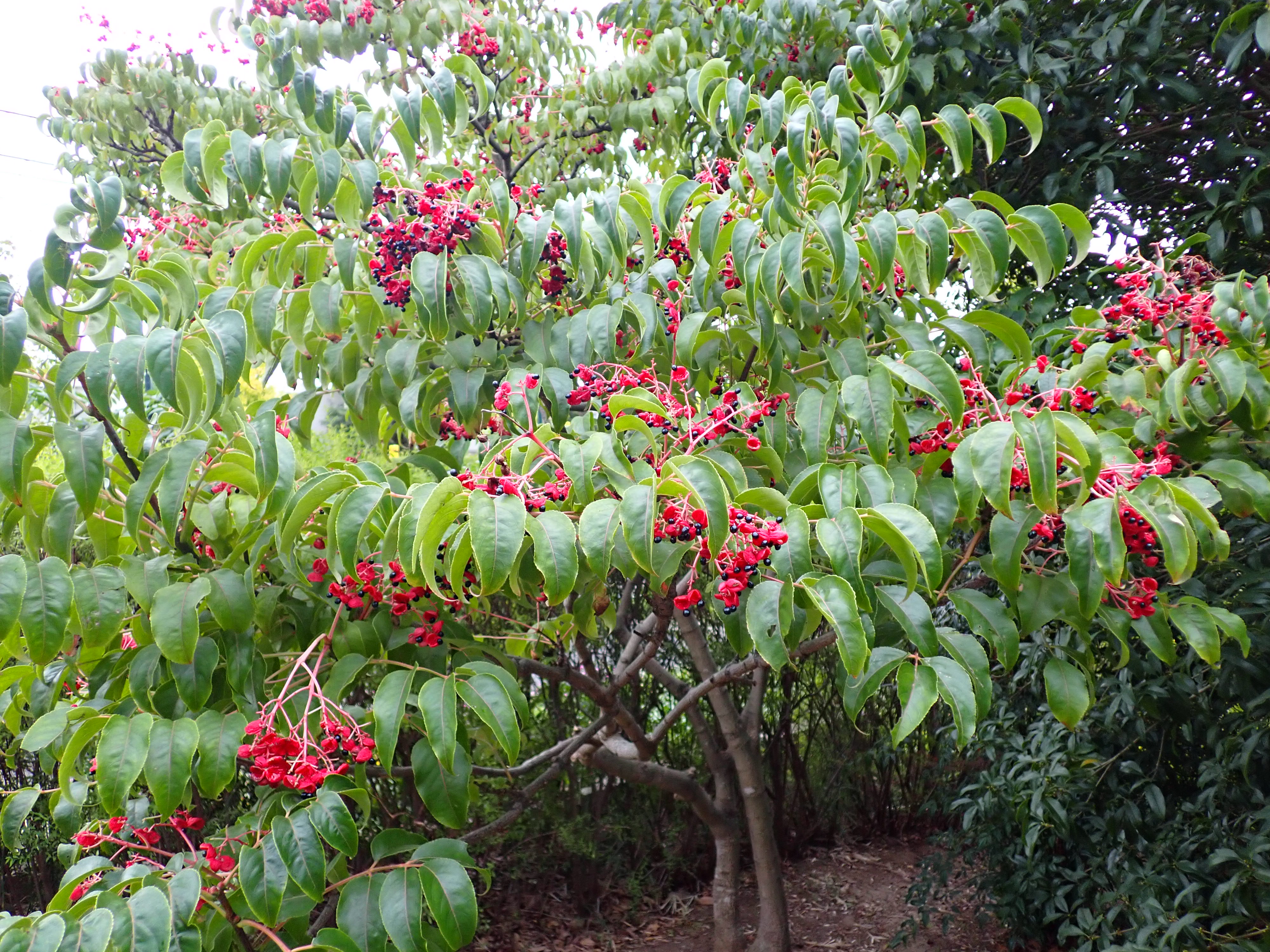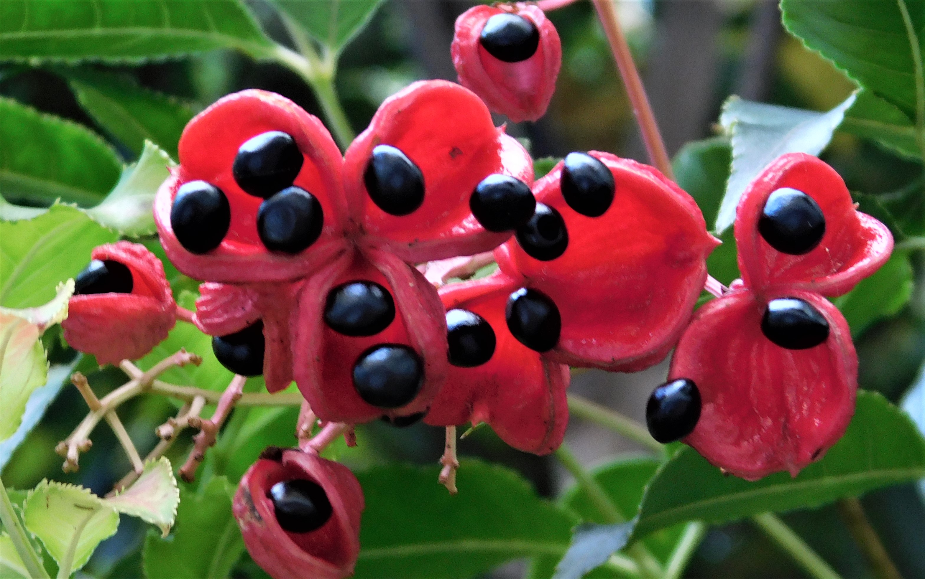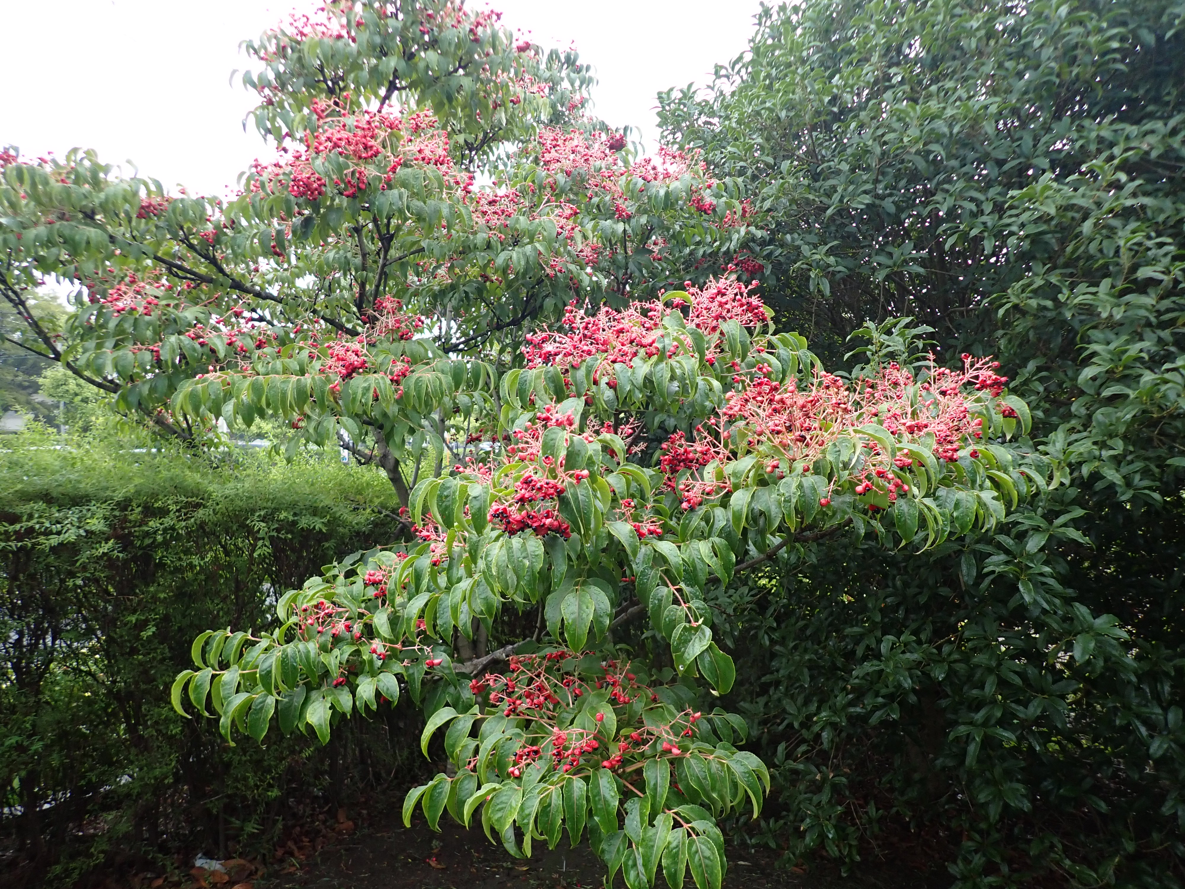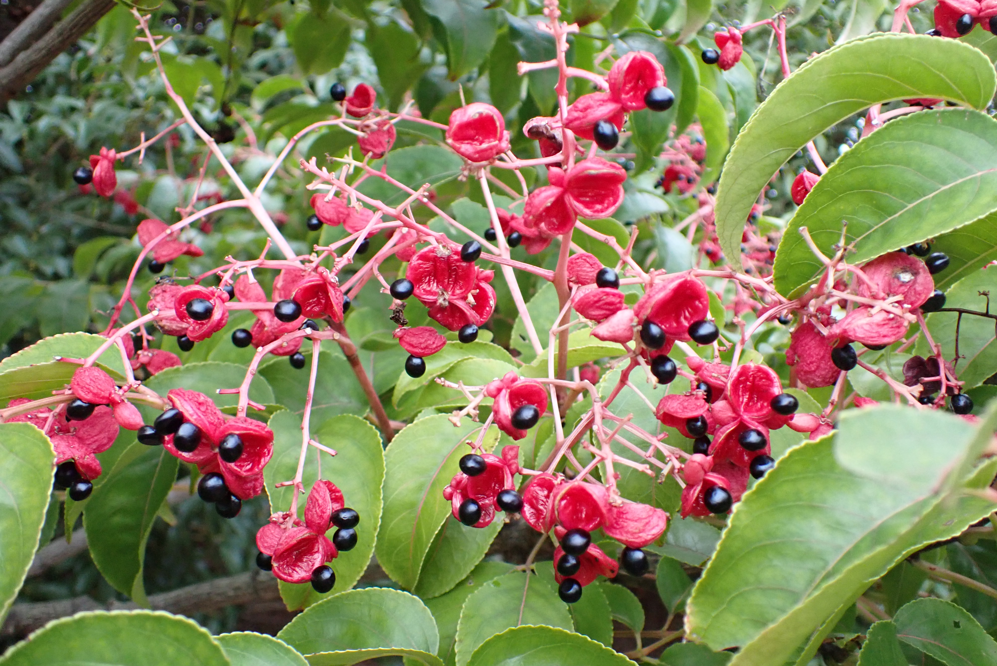あまり目立つ木ではなく地味な存在ですが、9月~10月に真っ赤な果皮の中から黒い光沢のある種が顔を出し、とても目立ちます。