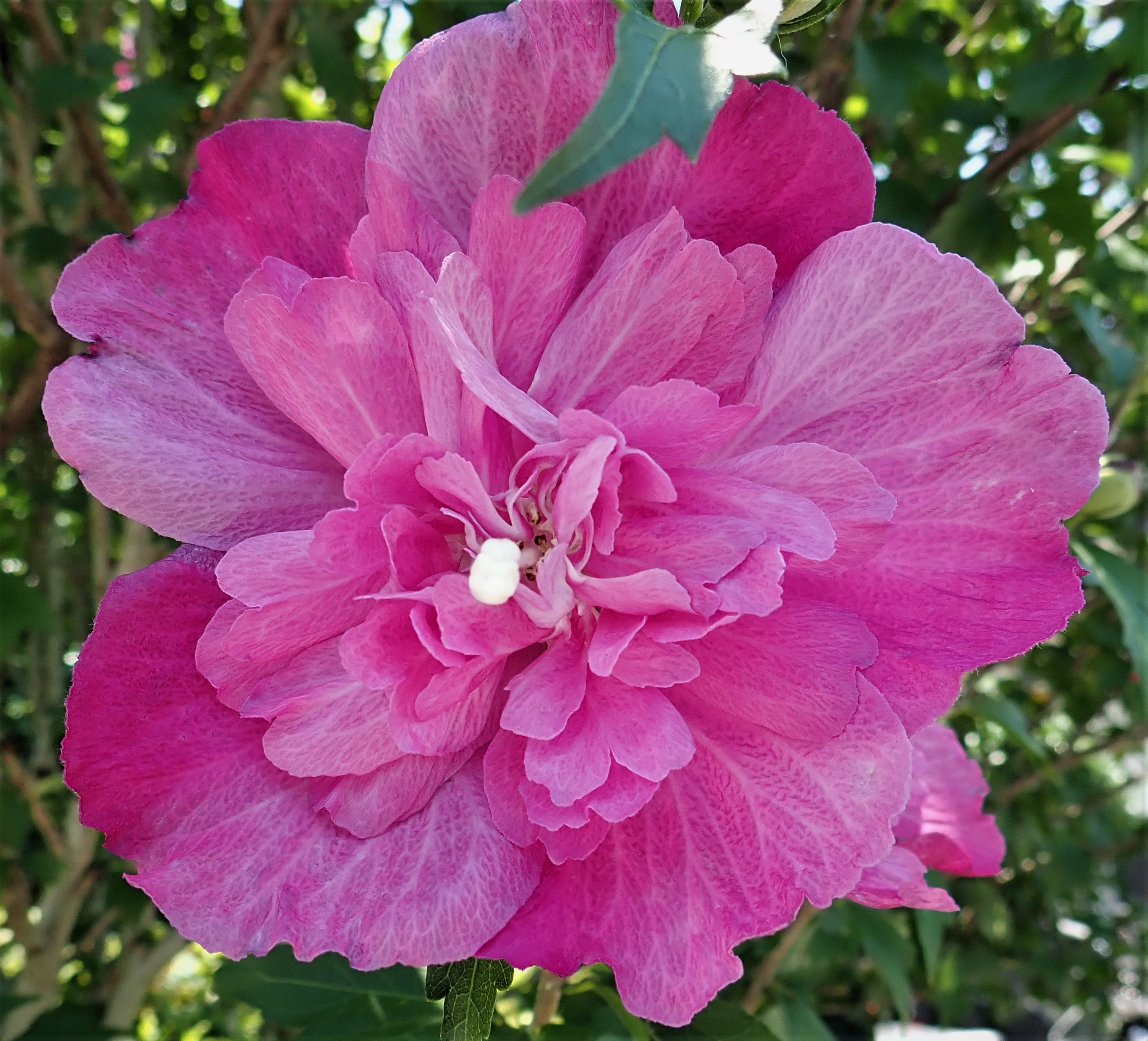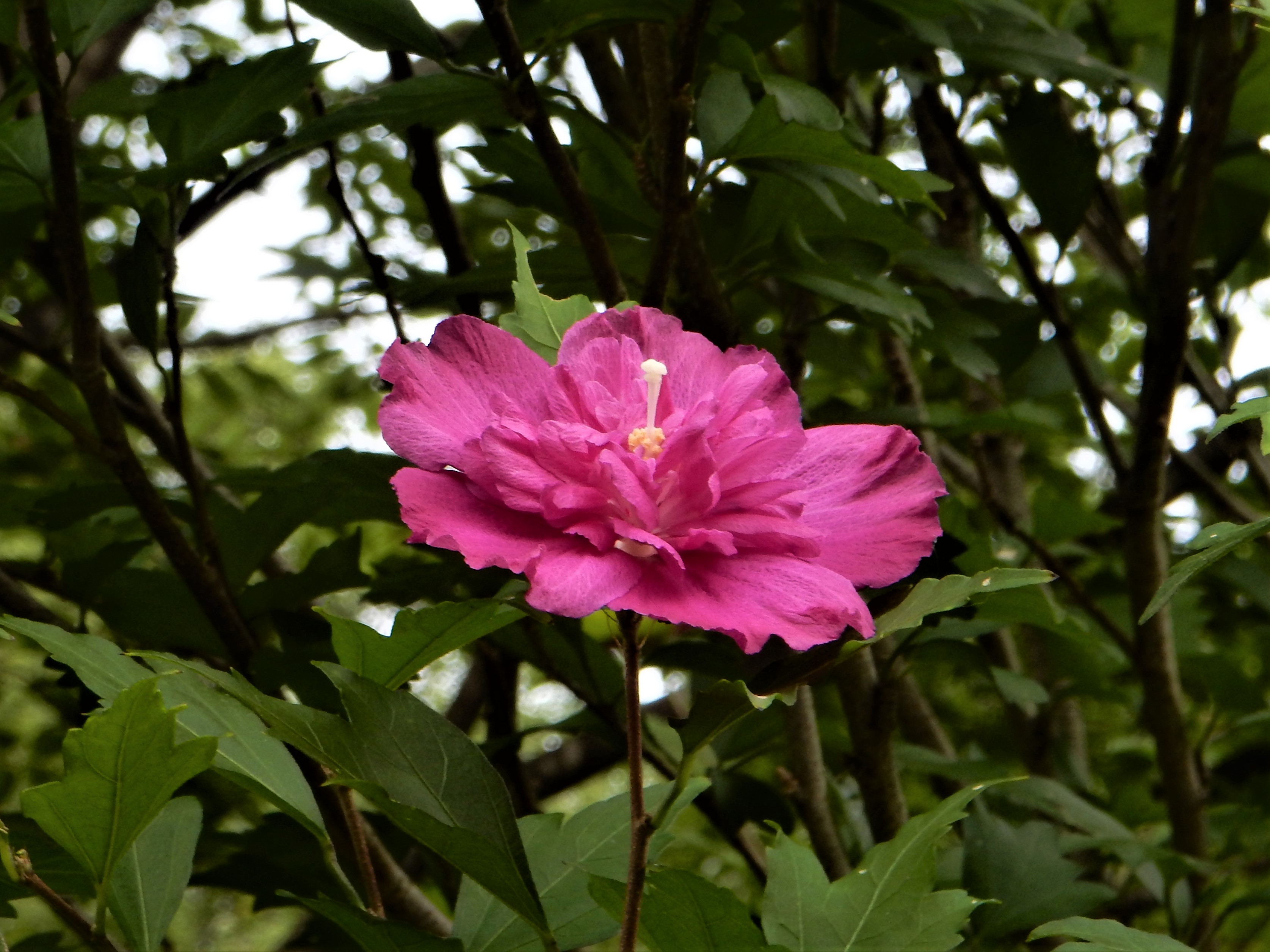 花色は白や紫などいろいろあり、更に、一重咲き、八重咲きなど、変化に富んでいますが、早朝に咲いて、夕方には閉じる一日花です。儚い栄華を「槿花(きんか)一朝の夢」と表現されることがあります。ムクゲの花の儚さ故の表現です。