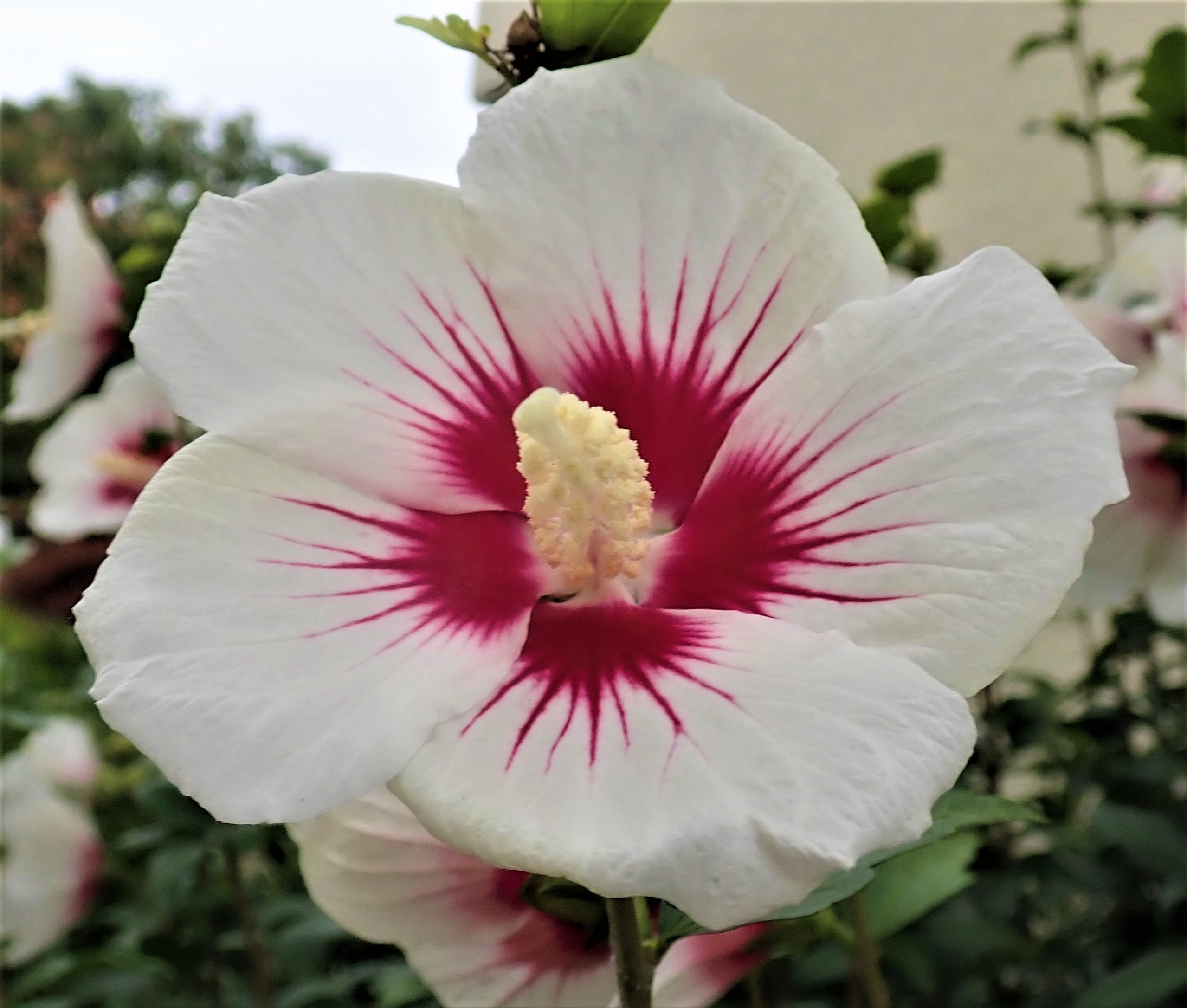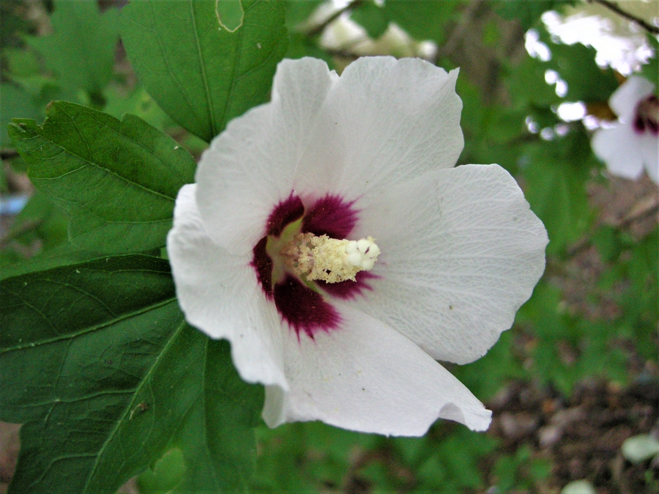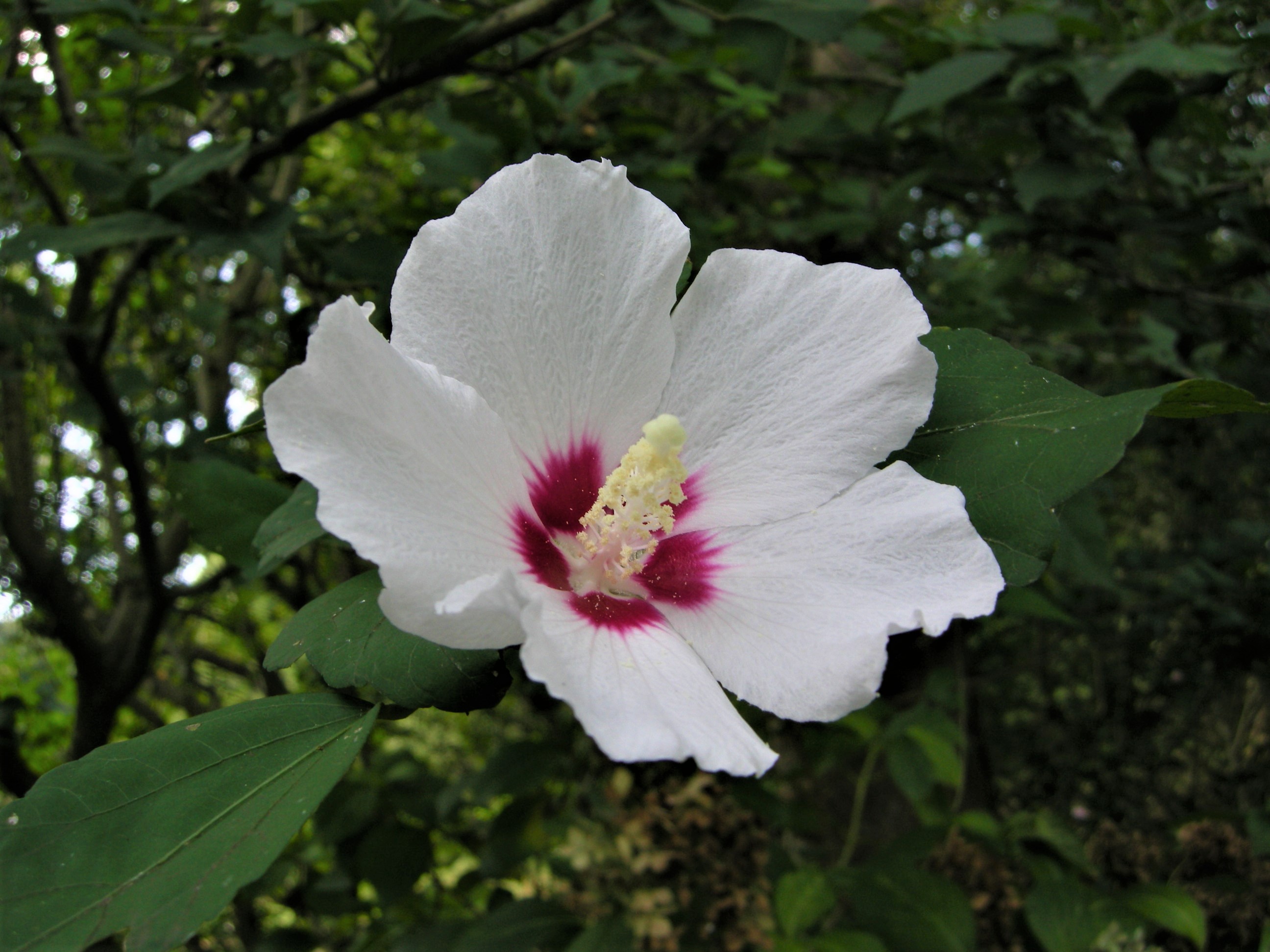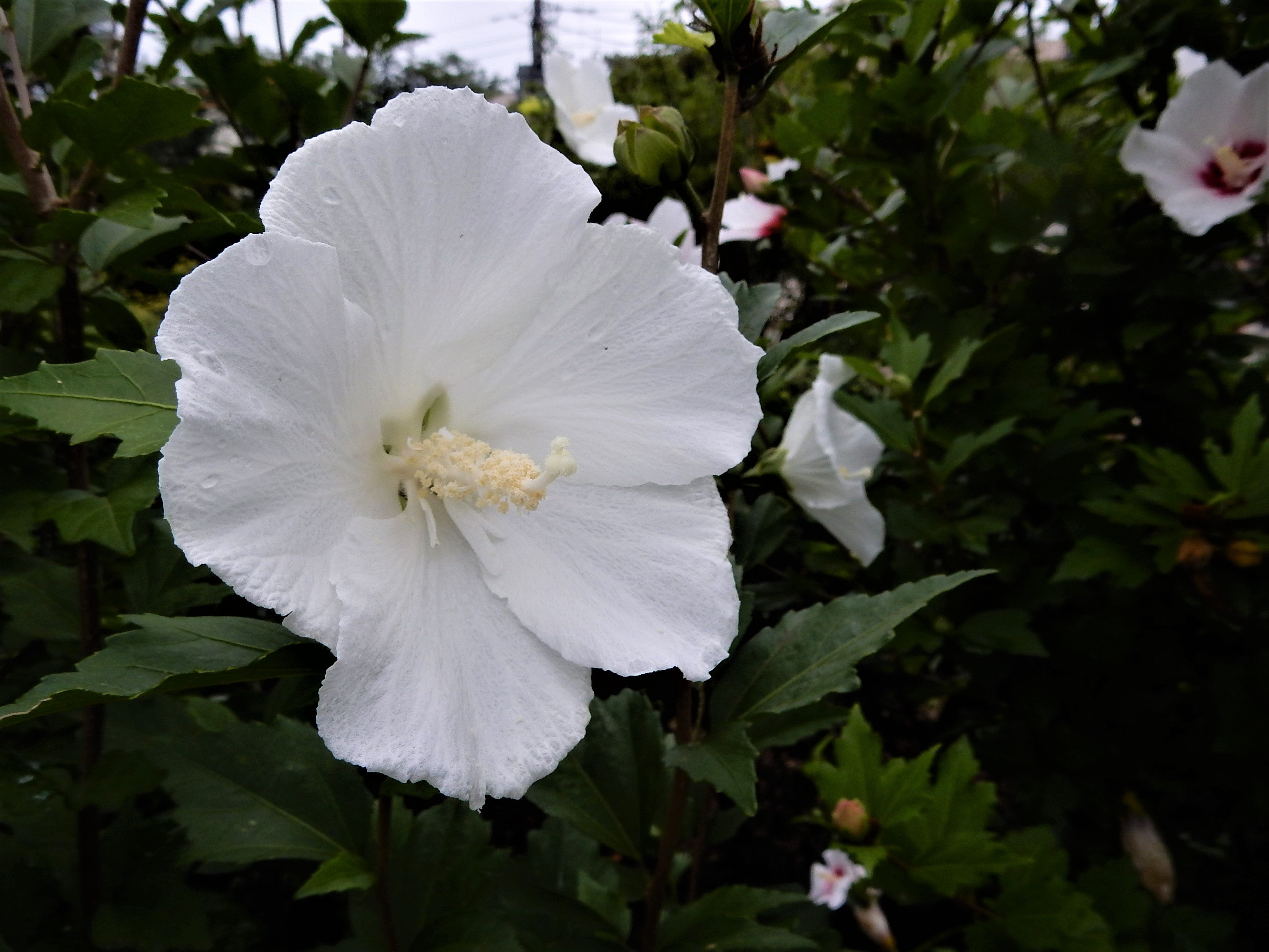 白い花で、花の底の部分が濃紅色の一重咲きを「宗旦木槿(そうたんむくげ)」と言います。千利休の孫、現在の茶道三千家の祖といわれている宗旦が好んだことからの名と言われています。早朝から行われる朝茶事の茶室を飾ることの多い花です。