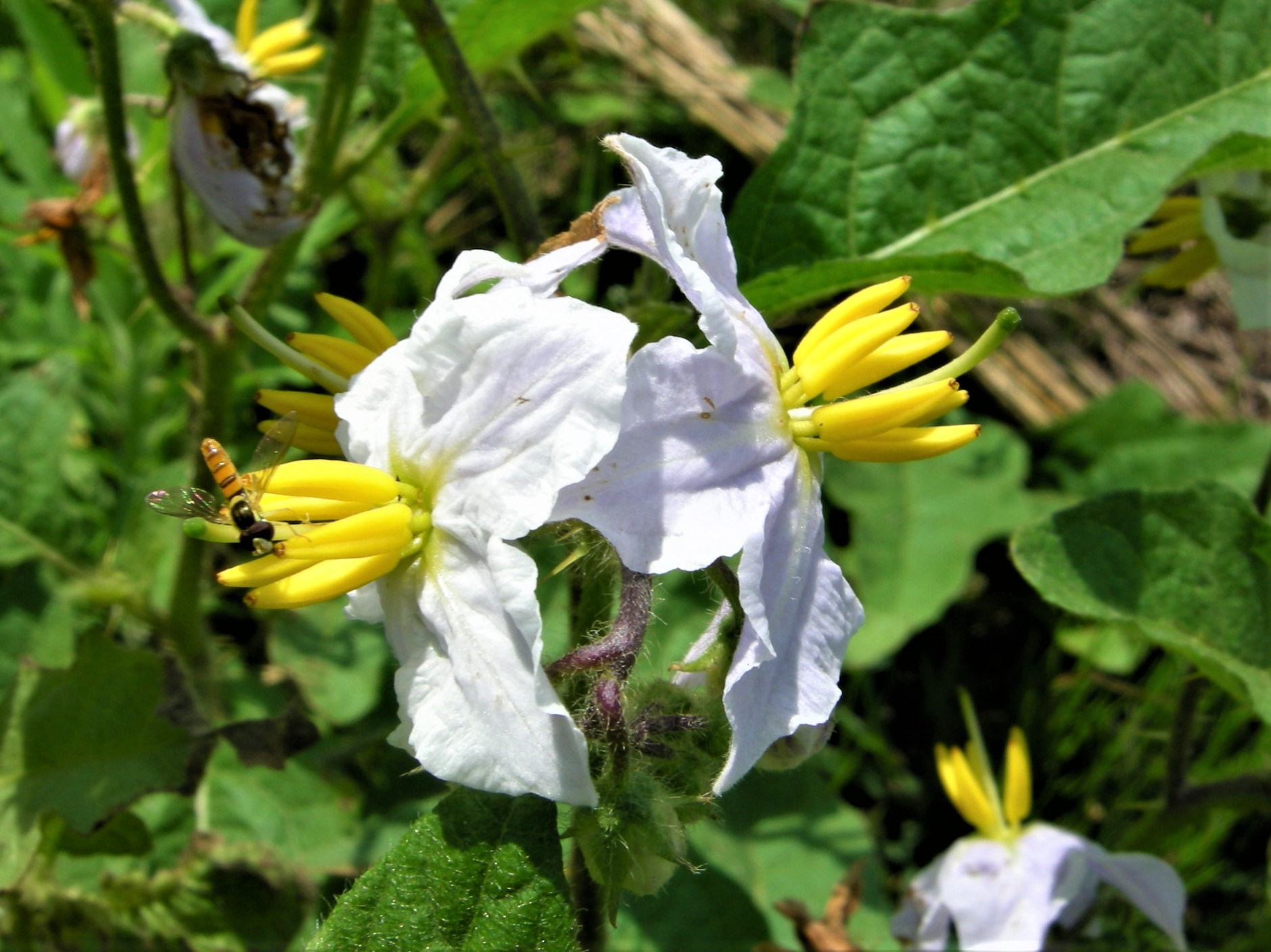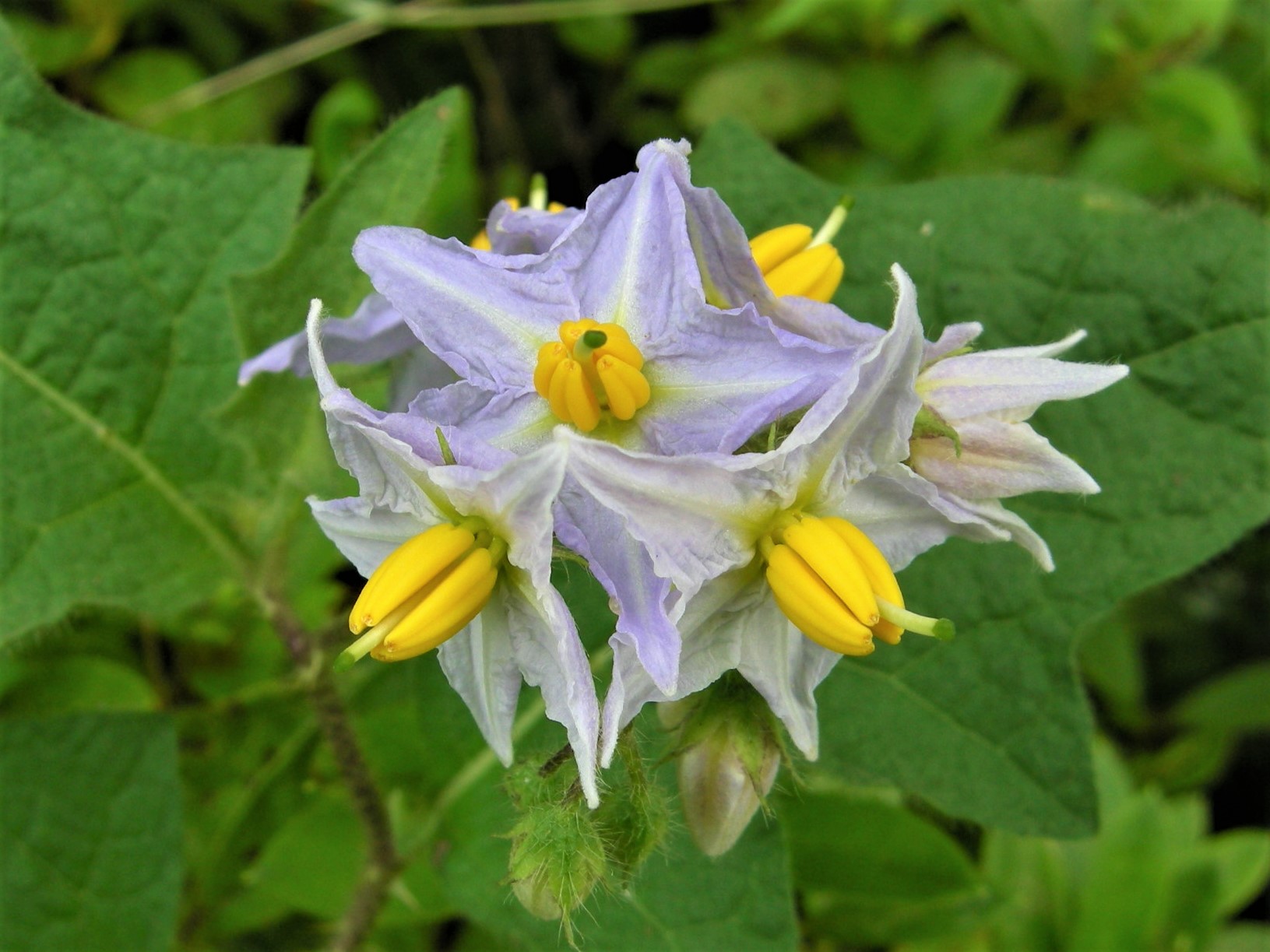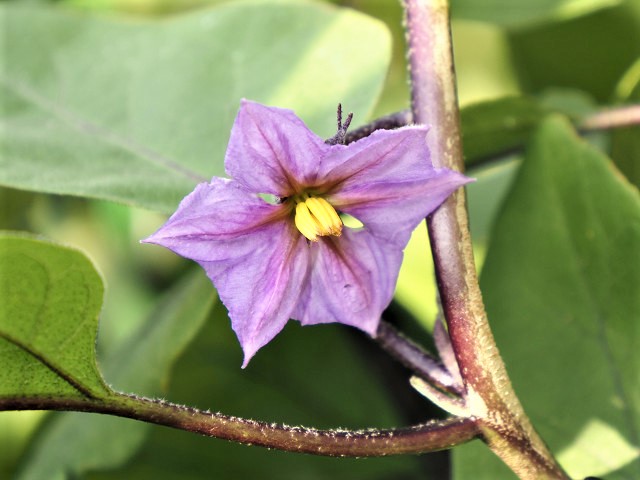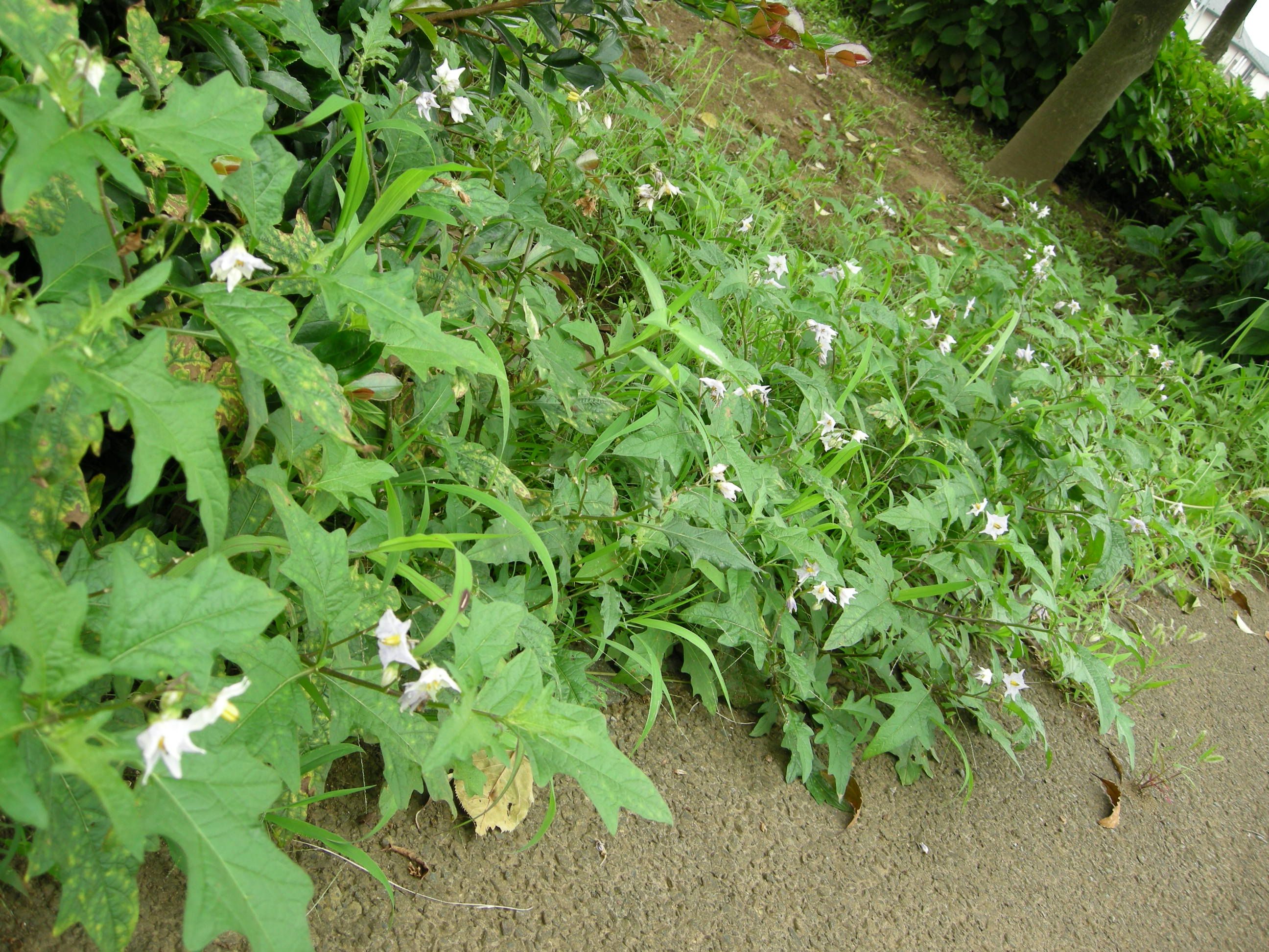 道端や荒地などで、ナスによく似た花が咲いているのを見かけることが多くなっています。北アメリカ原産の植物、ワルナスビです。ナス?と思って不用意に手を出すと、葉の中央脈上や茎にある鋭い刺に刺されることになりますので要注意です。