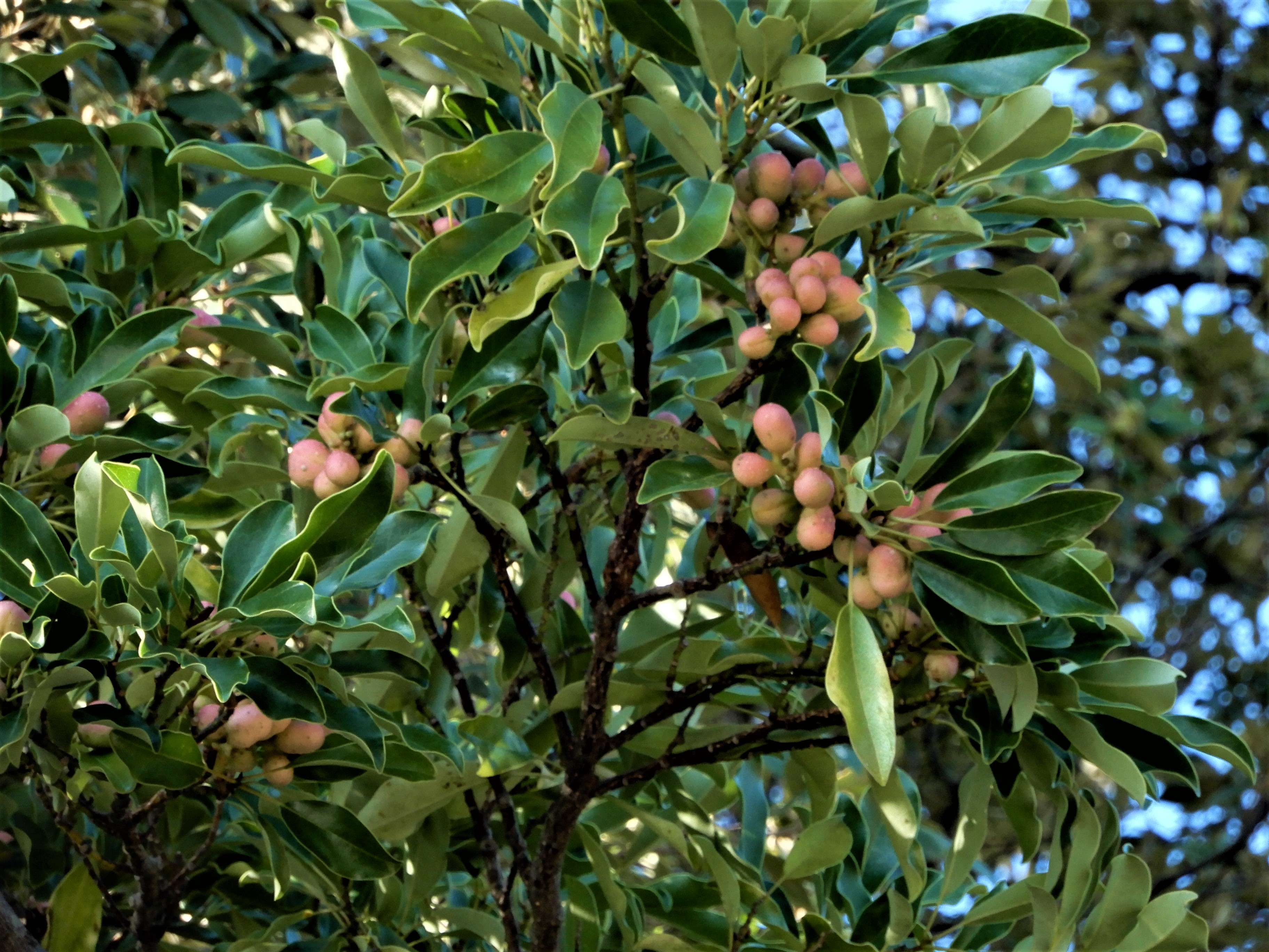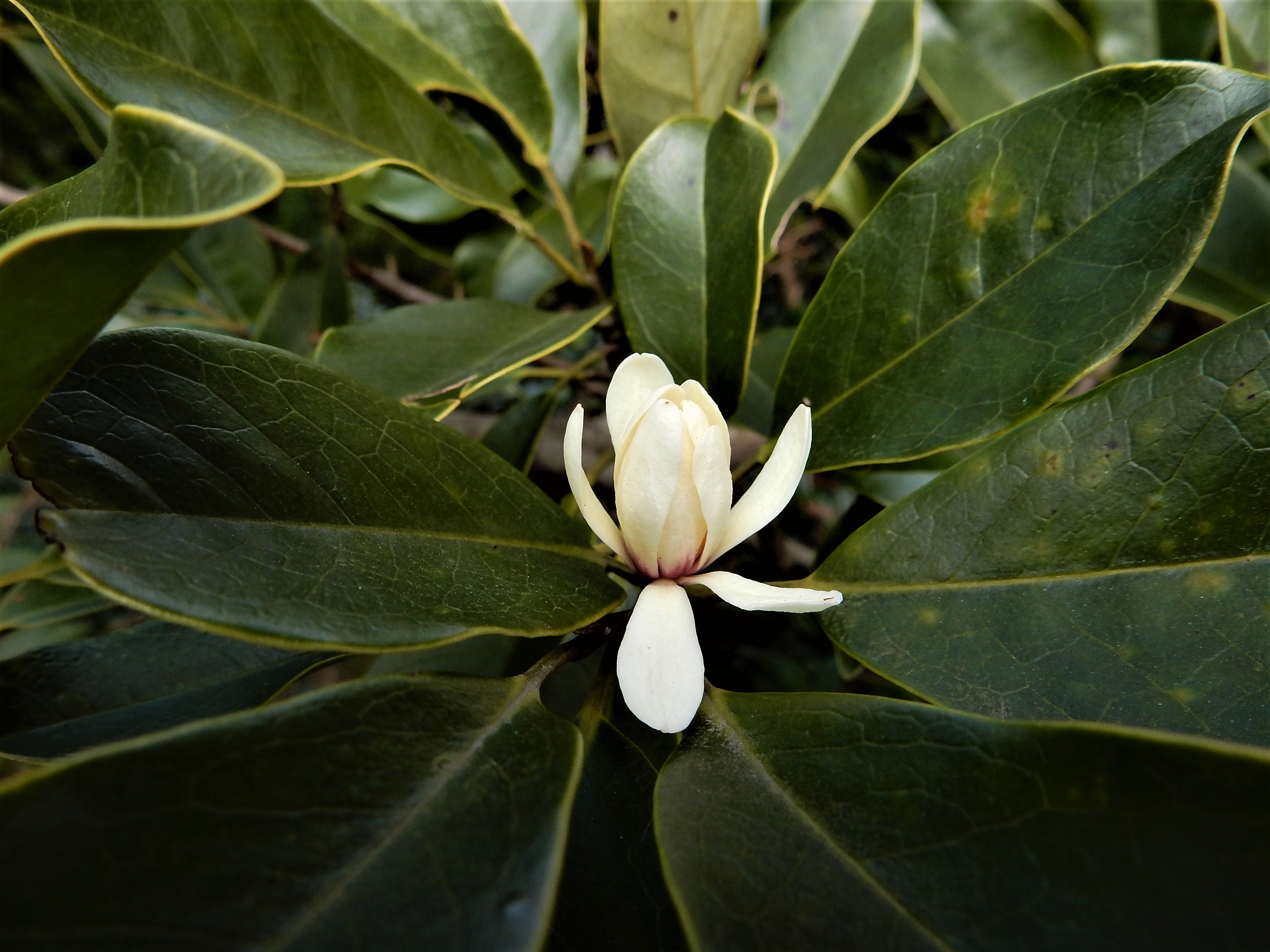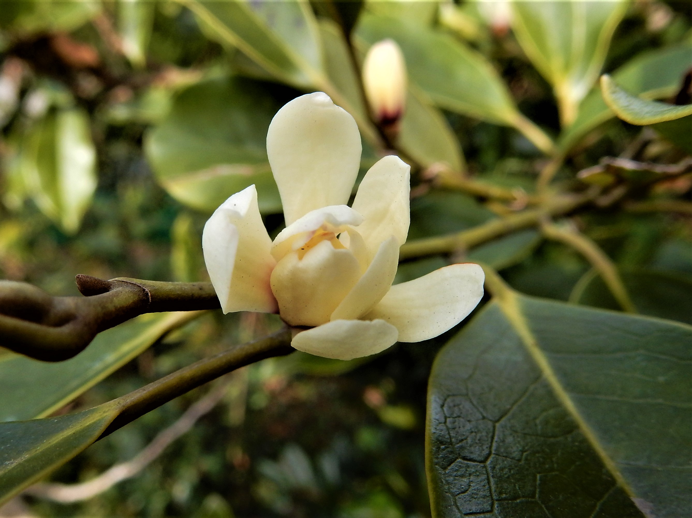早春に白い花を咲かせます。モクレンほどの大きさはなく、常緑の葉の中で咲きますので、ちょっと気づきにくいかもしれません。