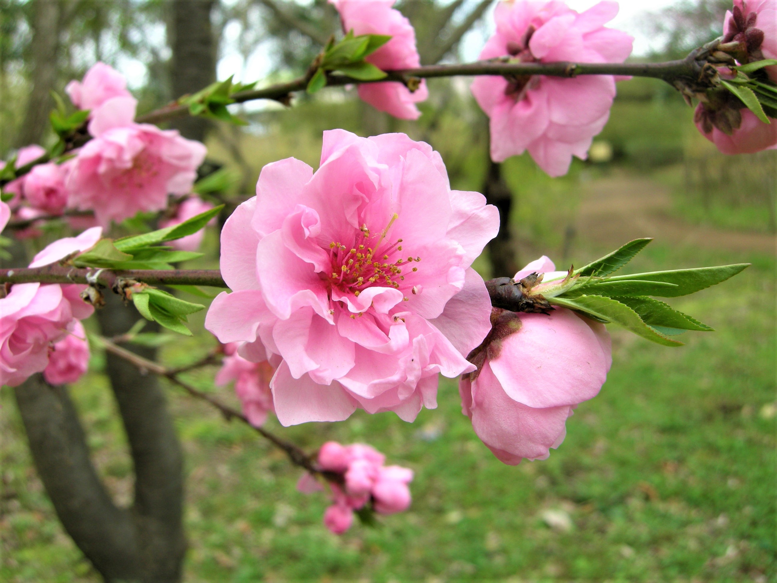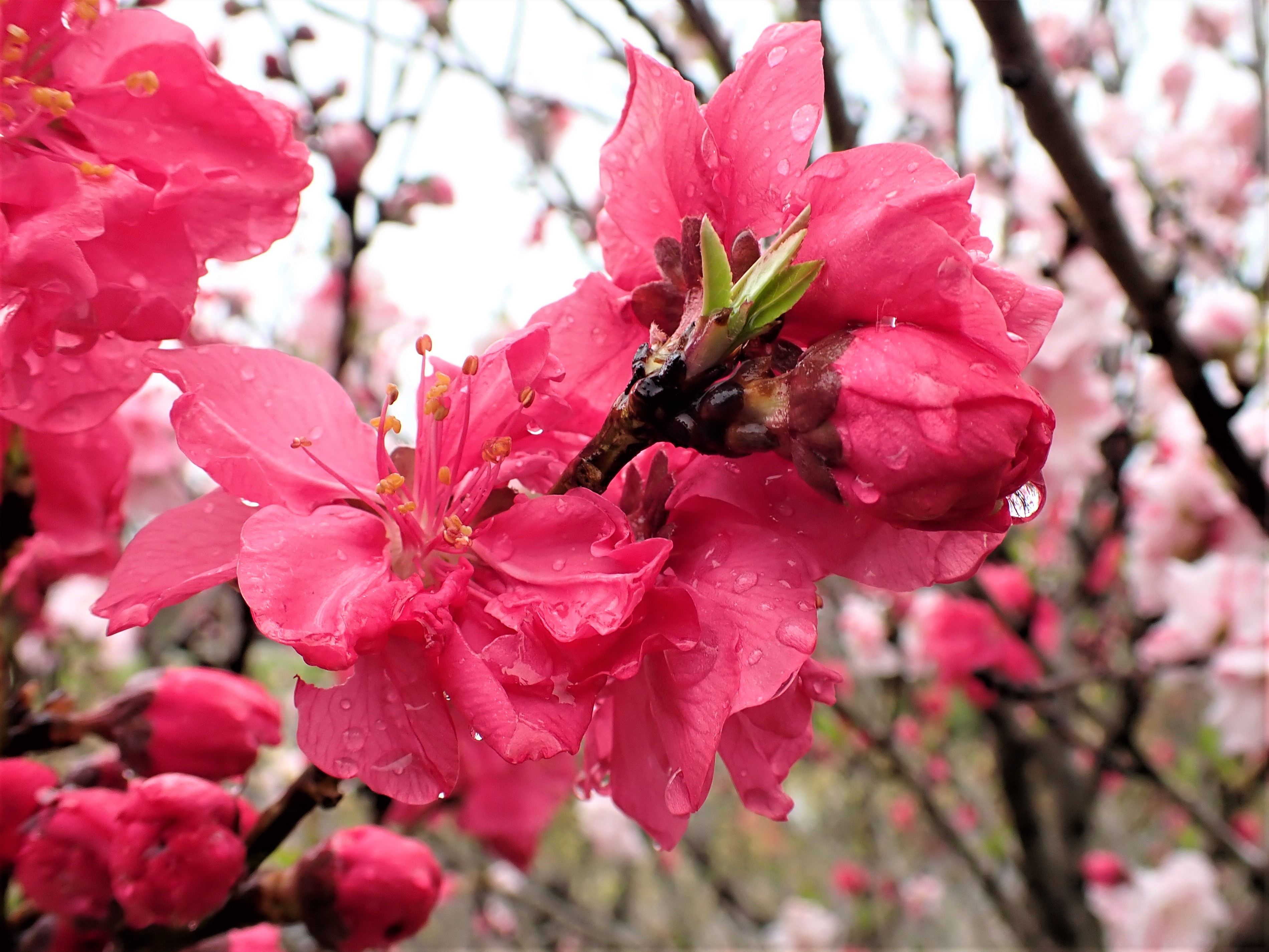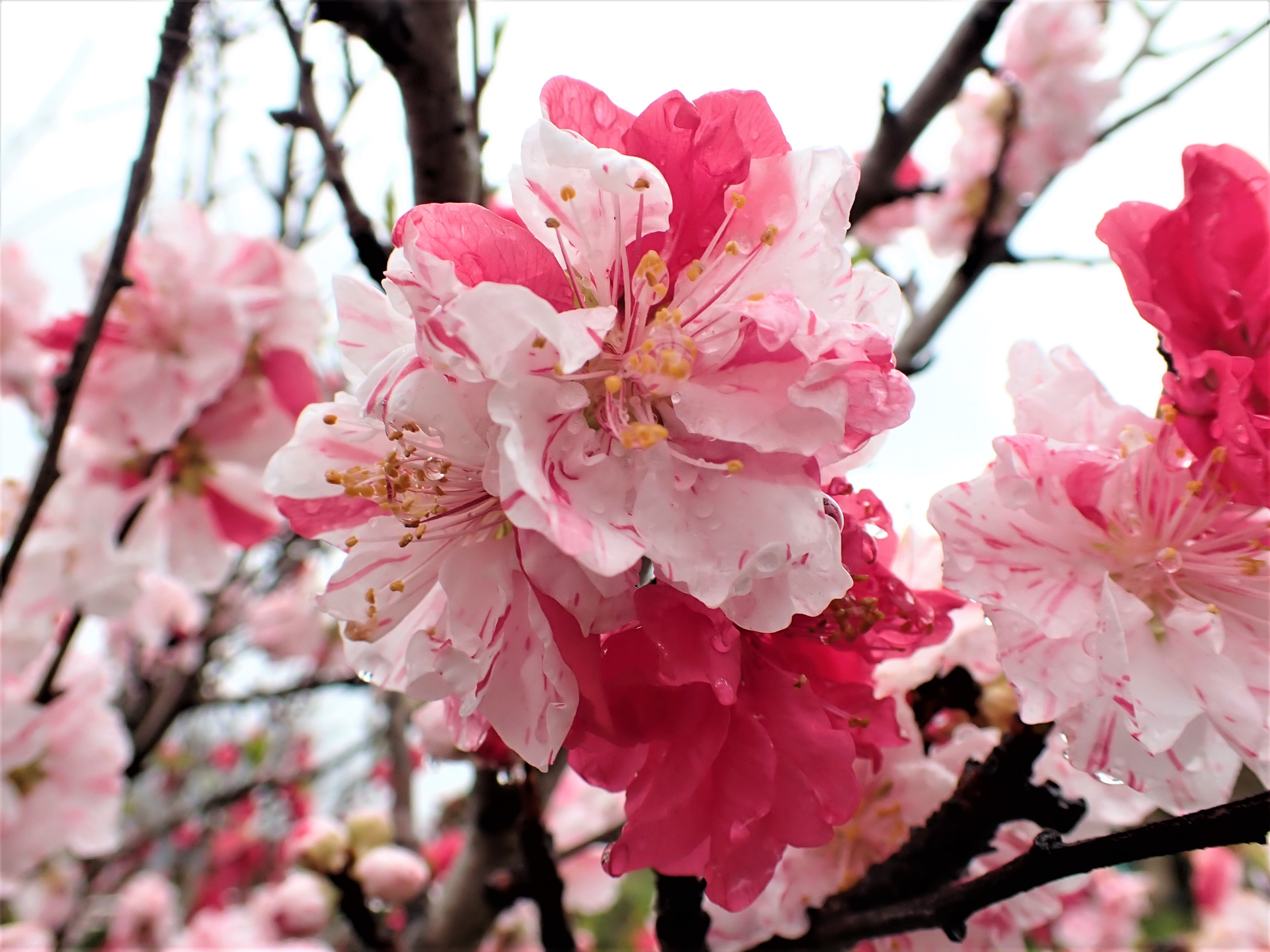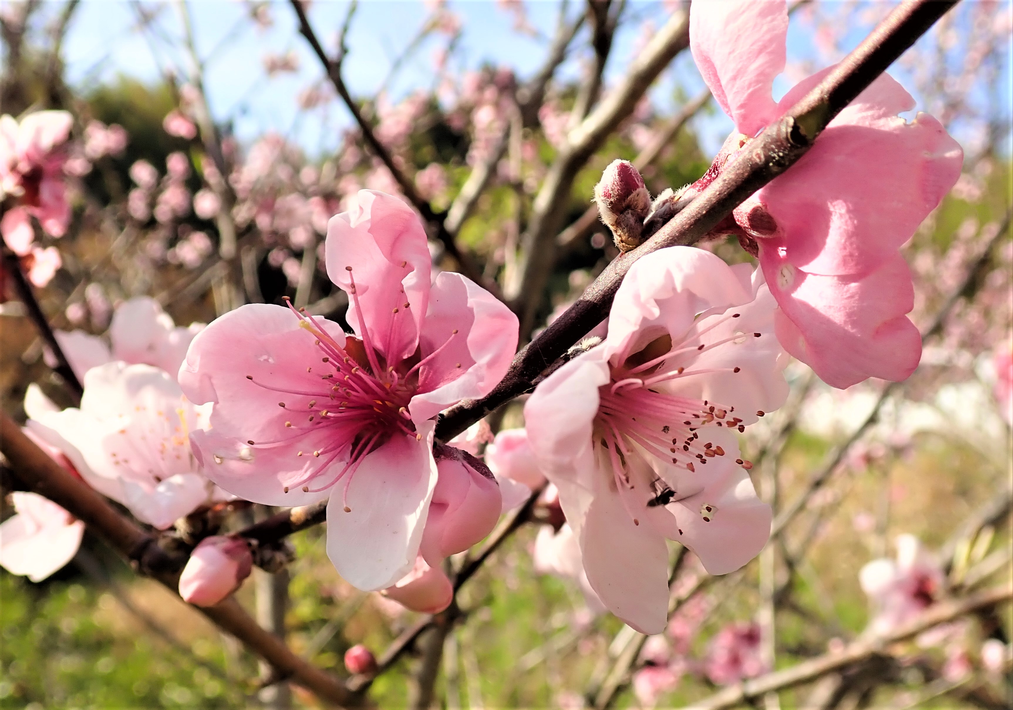 ひな祭りに飾られる桃の花は、ハナモモともいわれます。花を愛でるために改良されたもので、一重咲き、八重咲きがあり、色も白、ピンクなど様々です。たまに結実する果実は堅くて食用にはなりません。