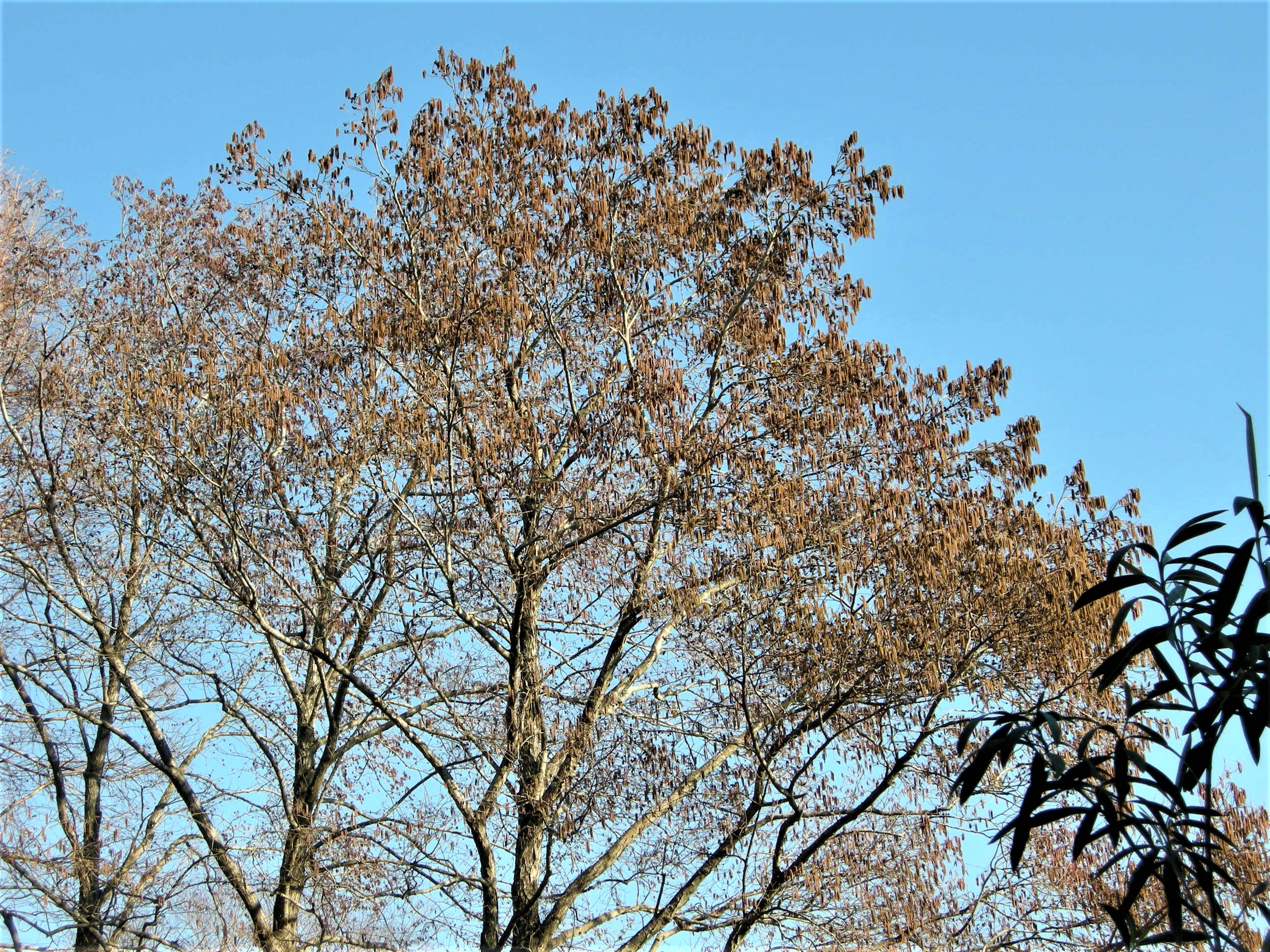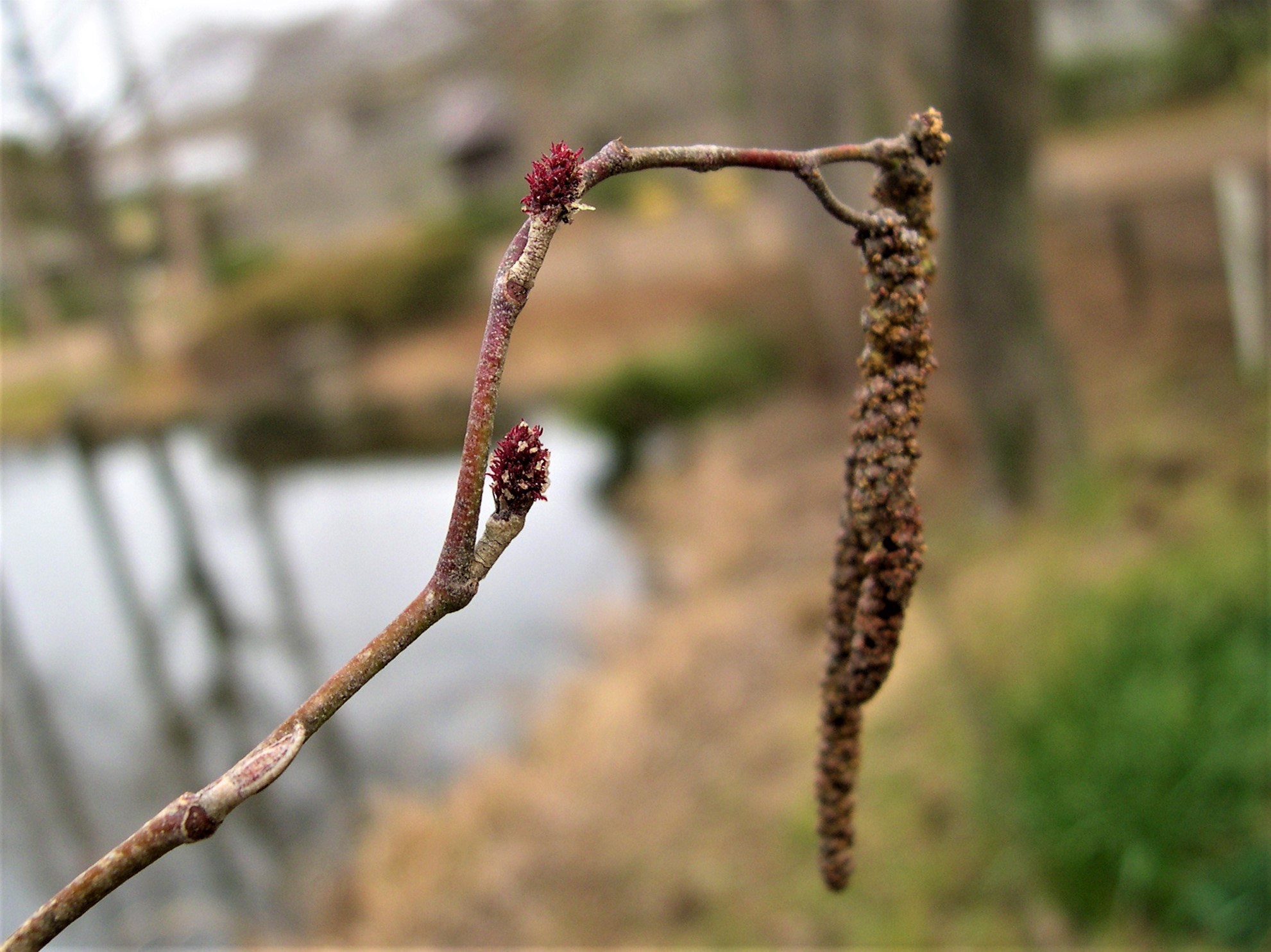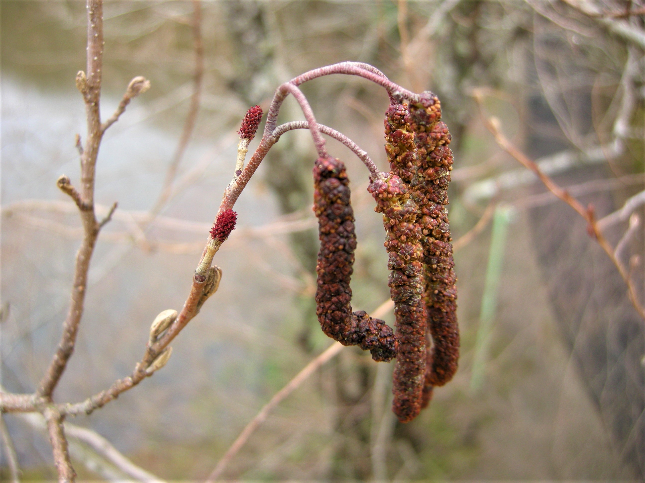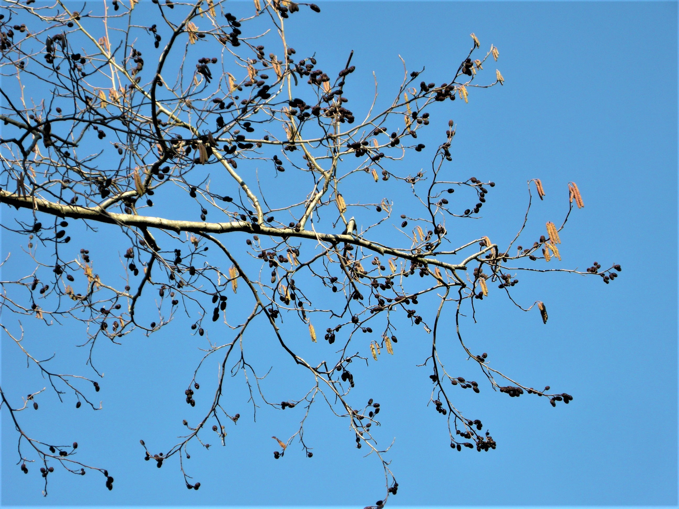 ハンノキの雄花が目につく季節です。ハンノキは湿地を好んで生育する木で、開葉する前に雄花穂から花粉を放出します。少し遅れて雌花も咲きます。
