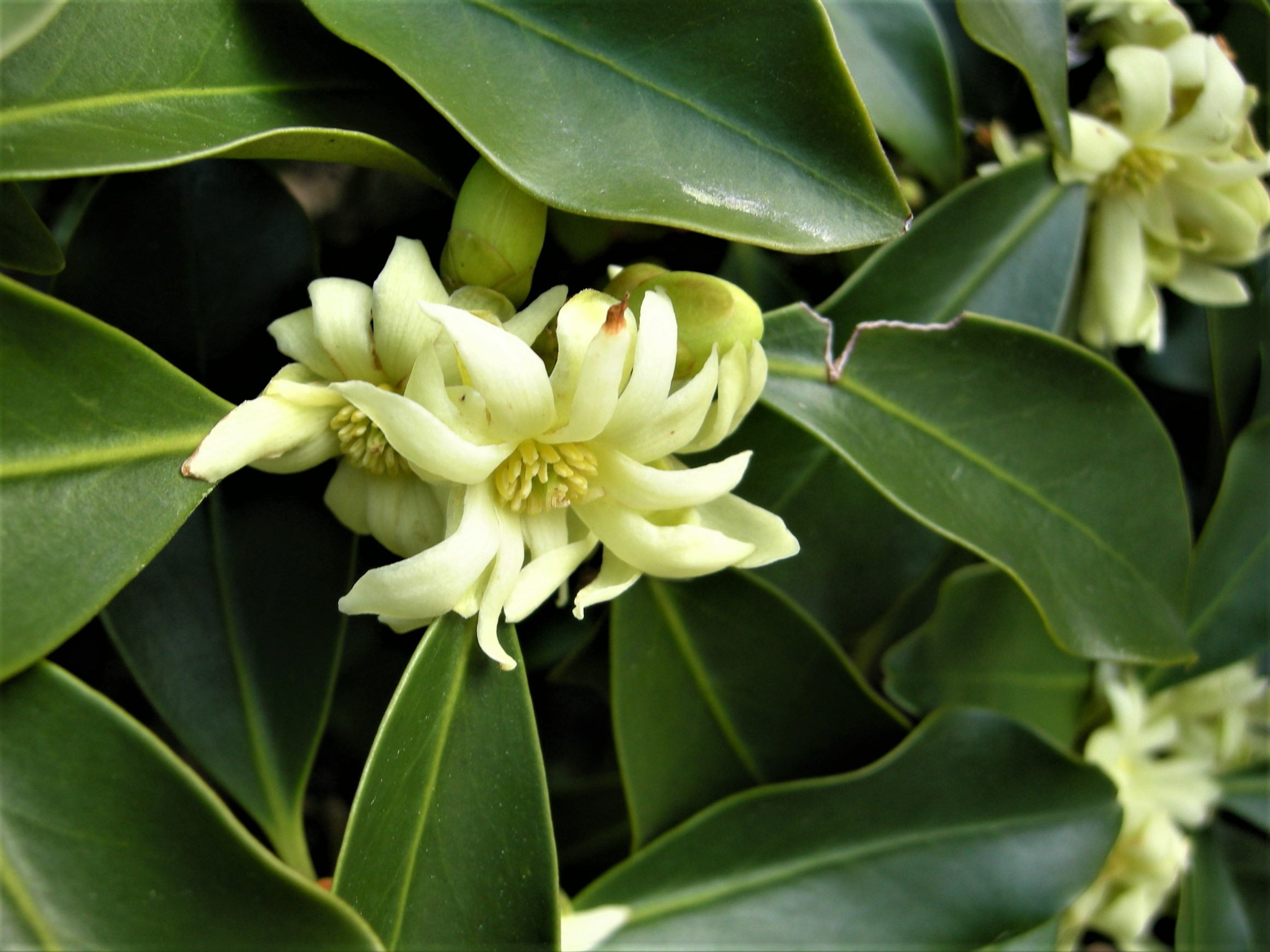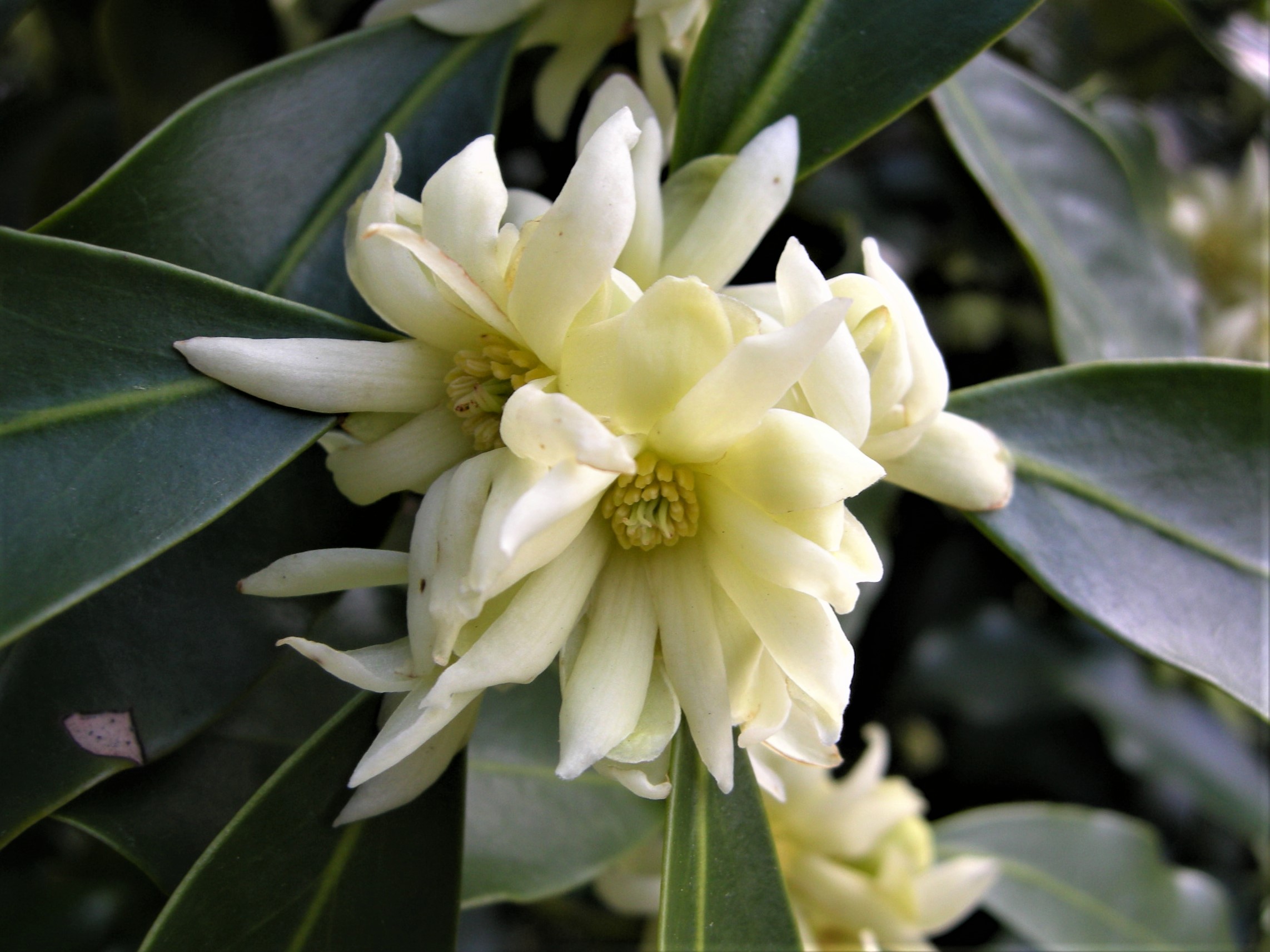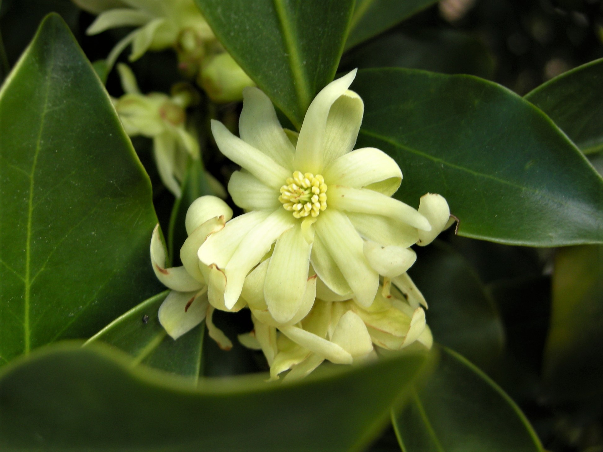ハナノキ(花の木)、ハナシバ(花柴)とも呼ばれ、春に黄白色の花を咲かせます。枝葉には香りがあり、乾燥させて搗(つ)いて抹香として仏前に供えられます。その香りから「臭き実」がシキミになったとか、果実が有毒であることから「悪しき実」からシキミになったとか、語源は諸説あるようです。