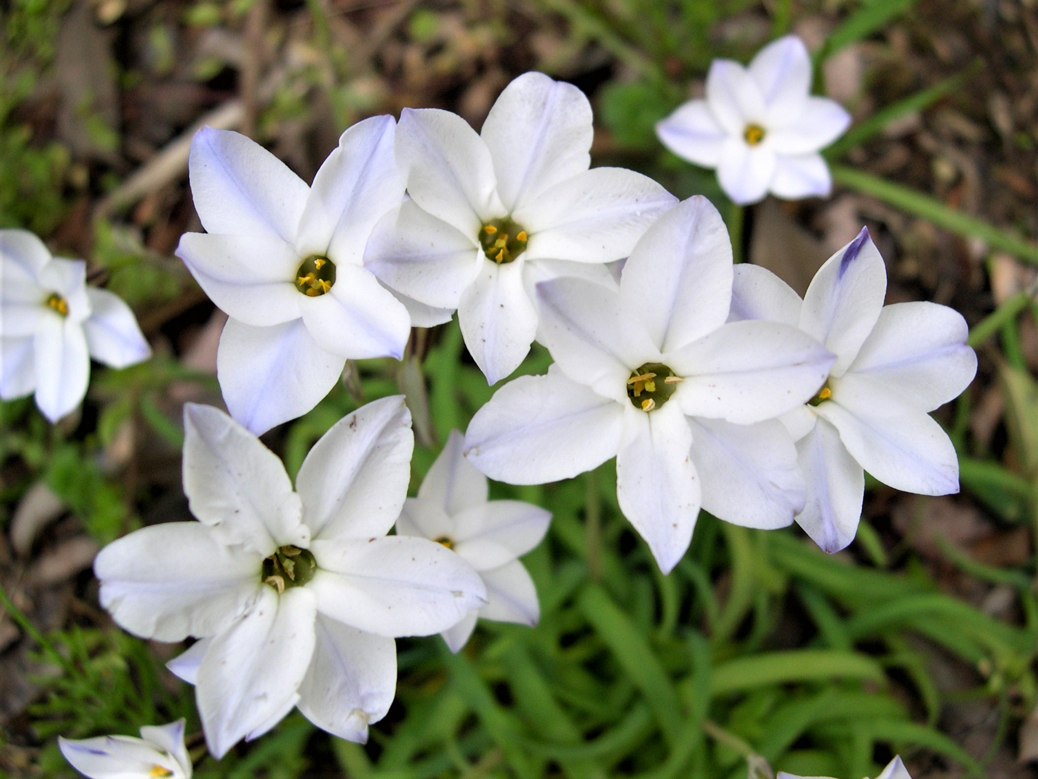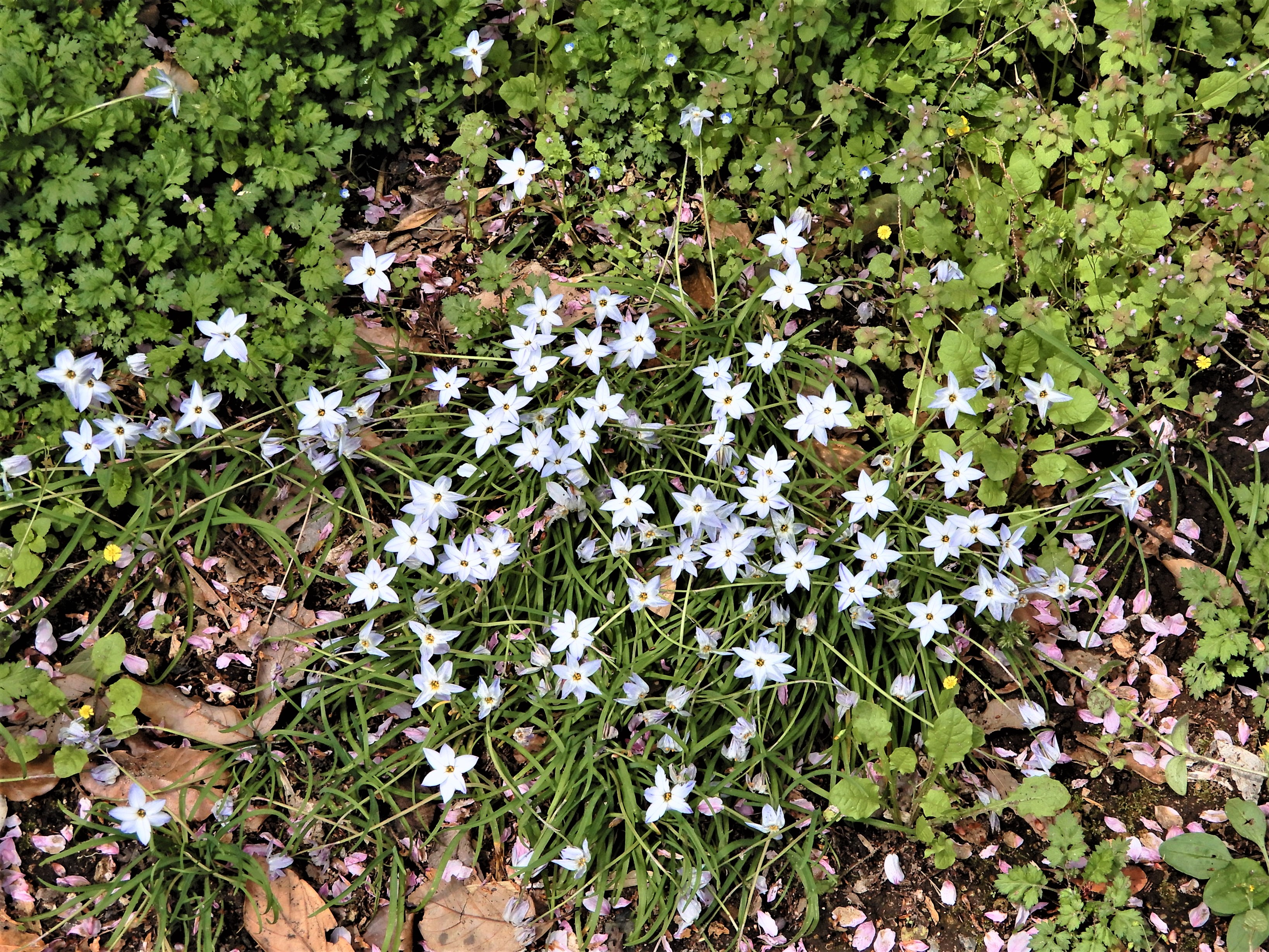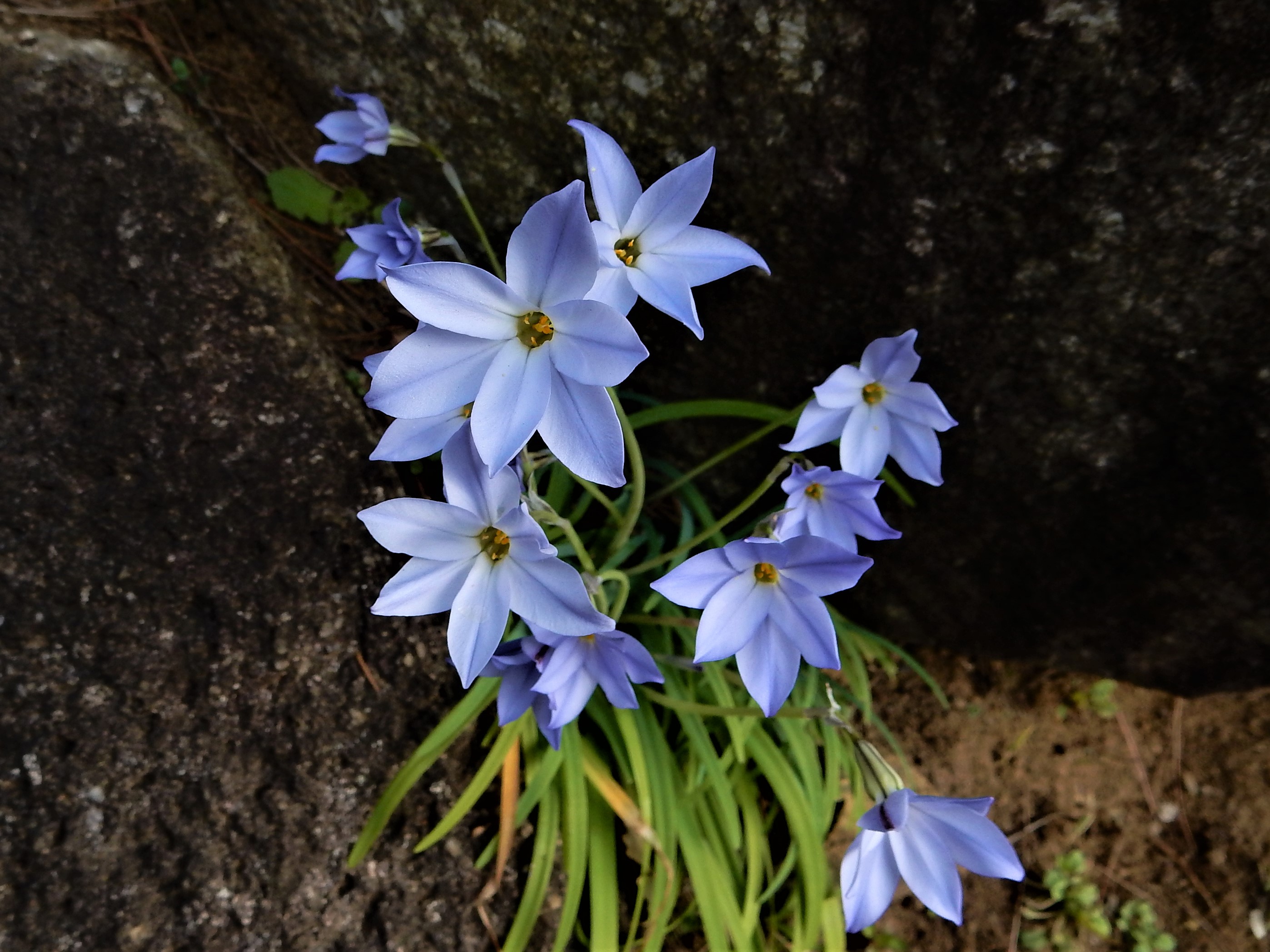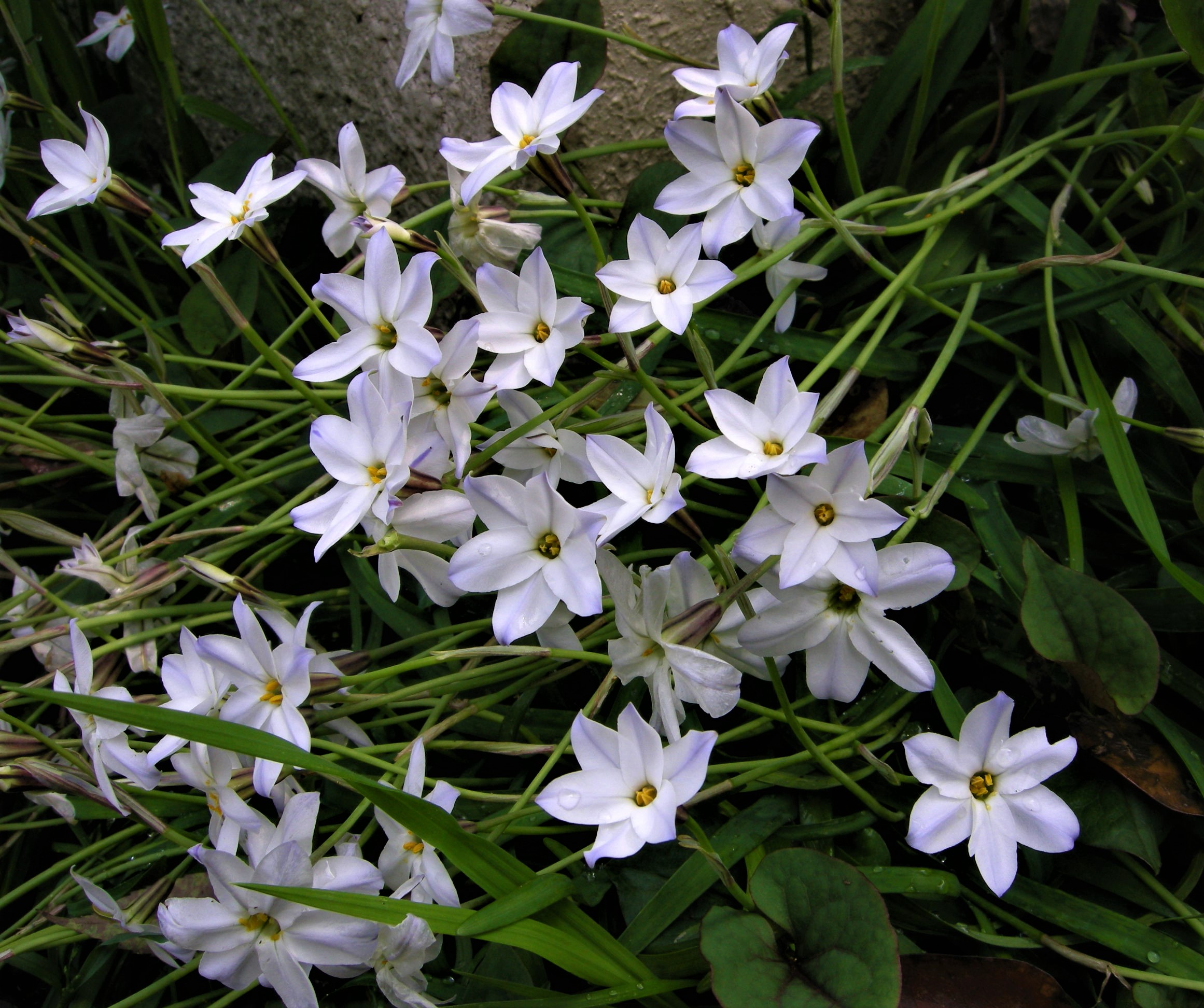 葉の形が野菜のニラに似ており、葉に触れるとニラの匂いがすることから、花がきれいなニラという意味で、ハナニラと呼ばれます。英名ではSpring starスプリングスター、日本でもスプリングスターフラワーと呼ばれたりします。