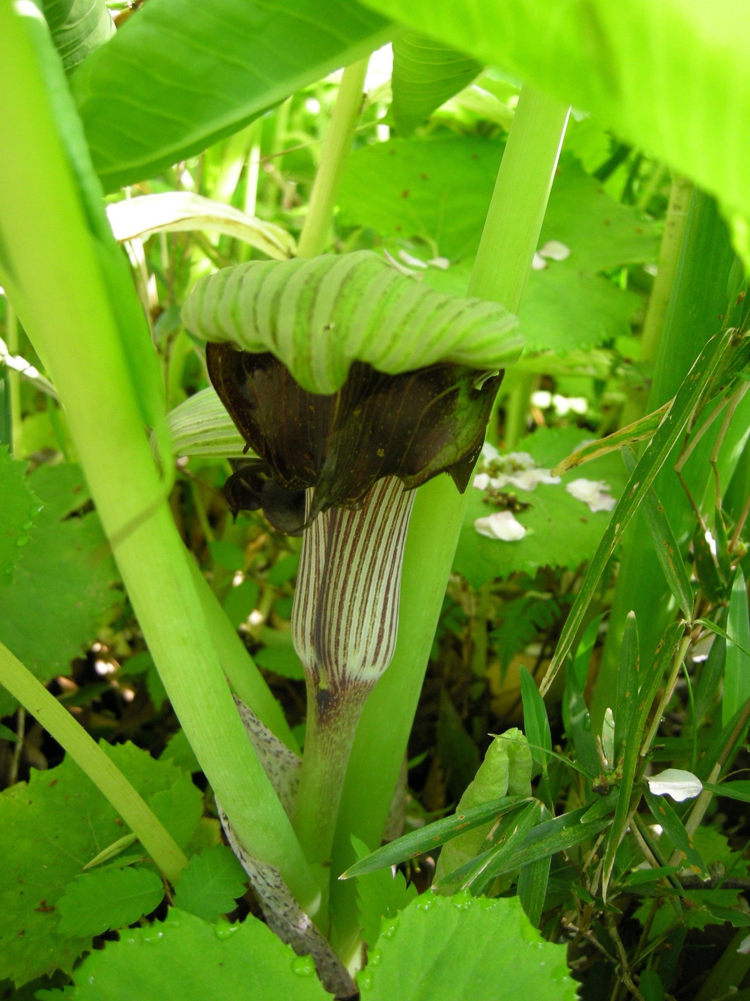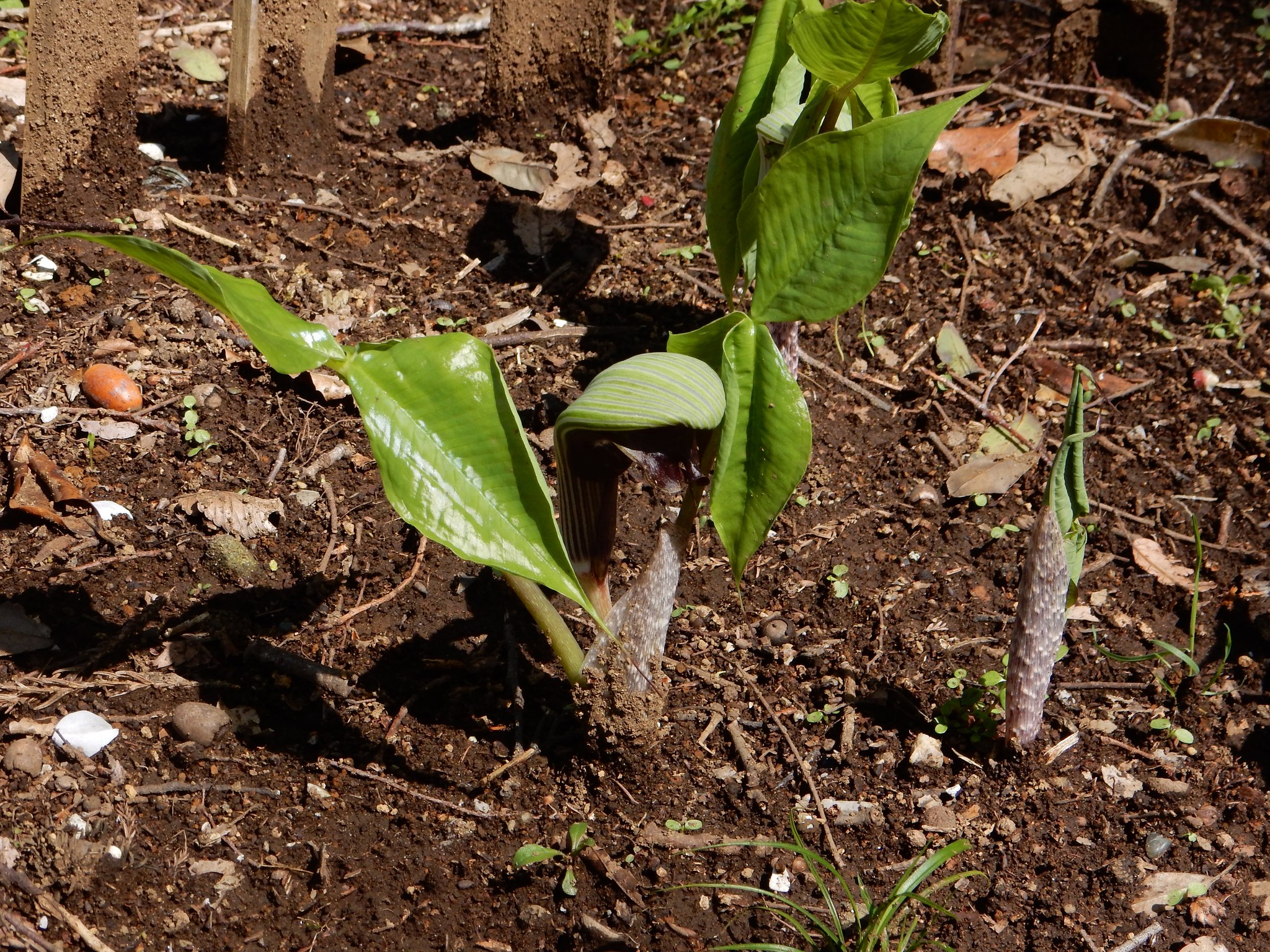 マムシグサやウラシマソウと同様に、仏炎苞の中に肉穂花序(にくすいかじょ)と呼ばれる花穂があり、雌雄異株です。地下にある芋が重ければ雌株、軽ければ雄株と、一つの株が性転換することが知られています。
