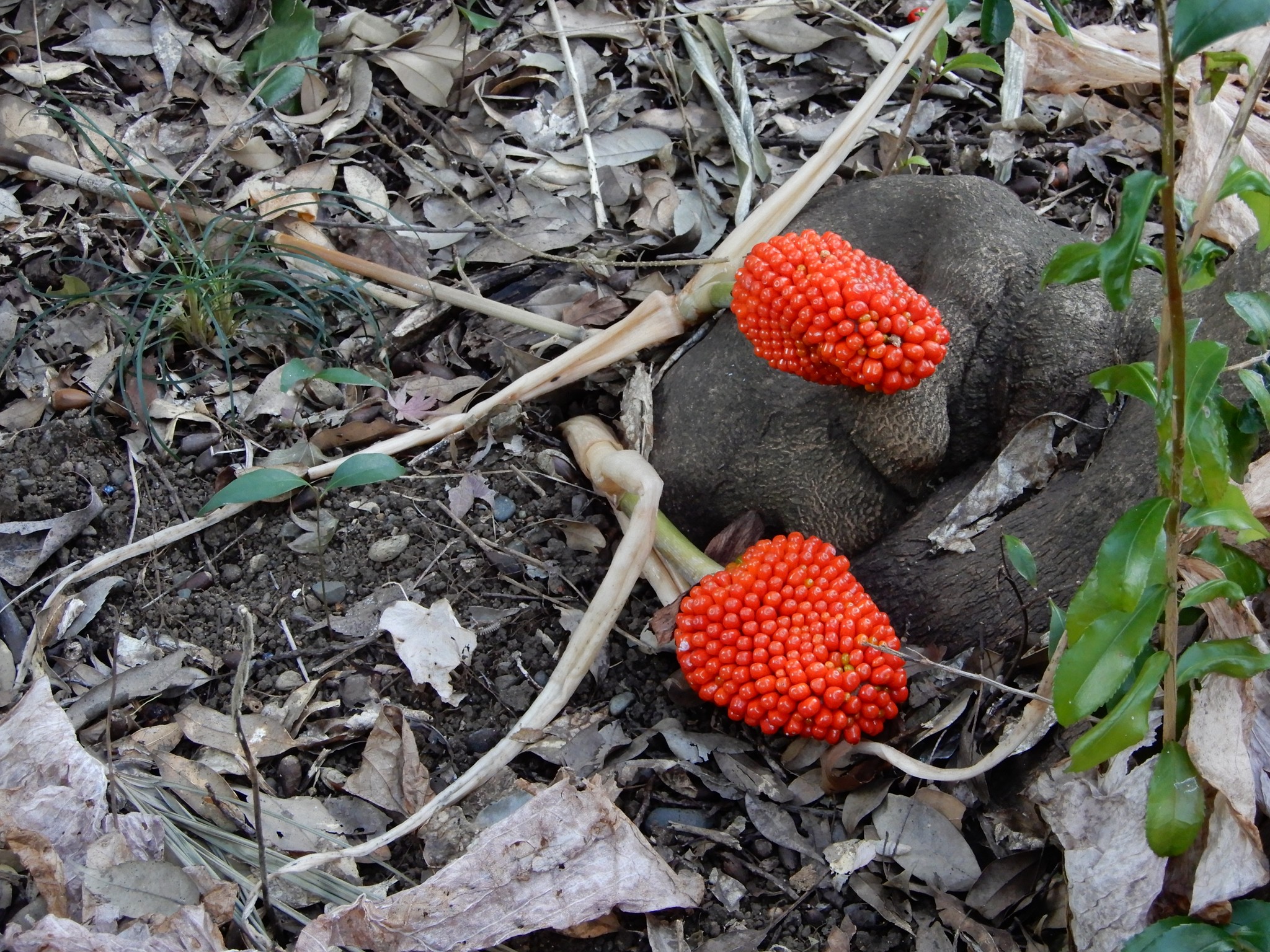 雄株では、仏炎苞の合わせ目のところに隙間があります。中に入った虫が体に花粉を着けて、次の花に行くための抜穴です。雌株はこの穴がありません。花粉をつけた虫が中で動き回ることで、受粉の可能性が上がります。虫の生死は花にとっては関わりがなく、抜け出せなかった虫が雌株の仏炎苞の中で死んでいたりします。厳しい自然界の現実です。