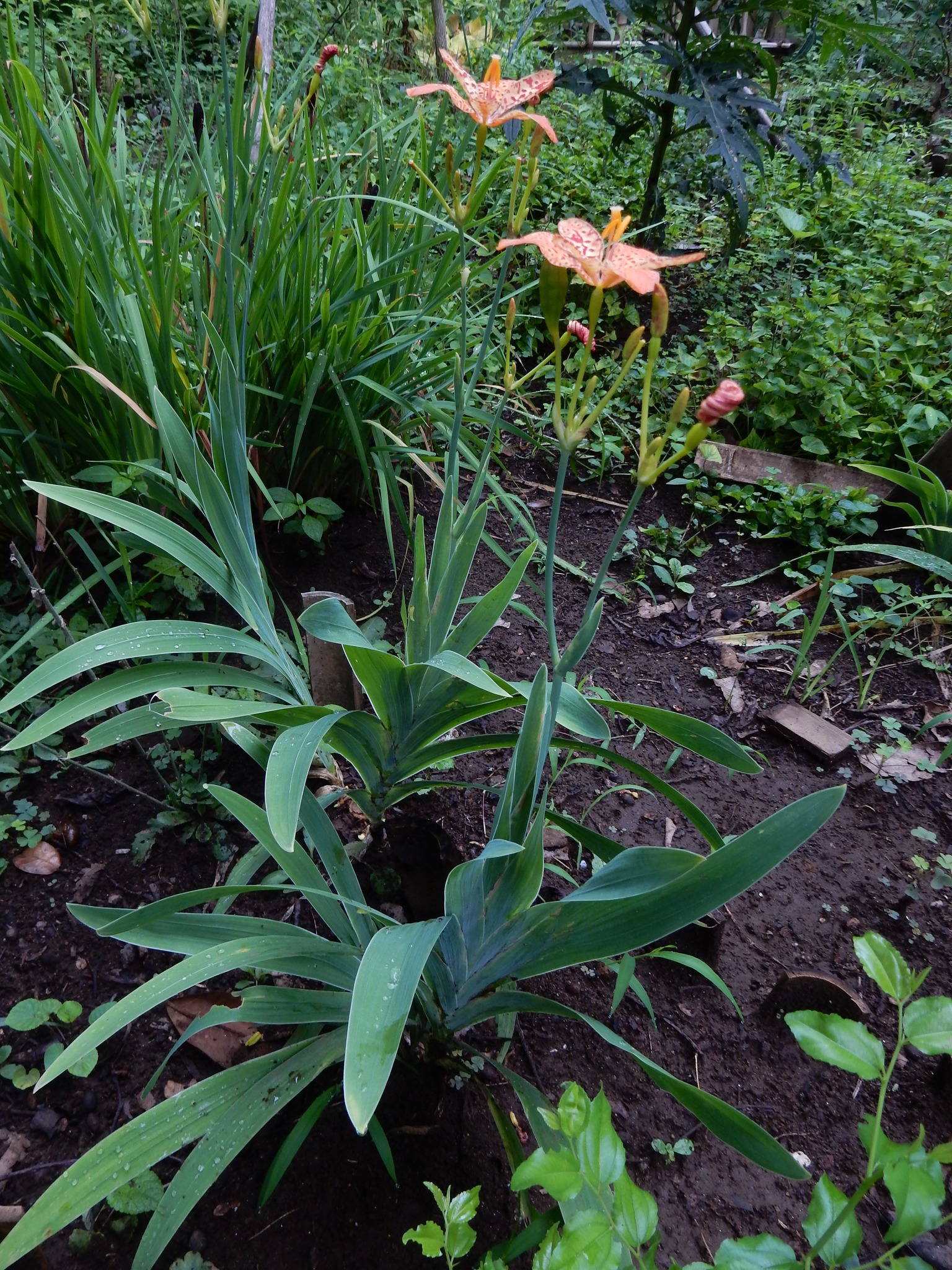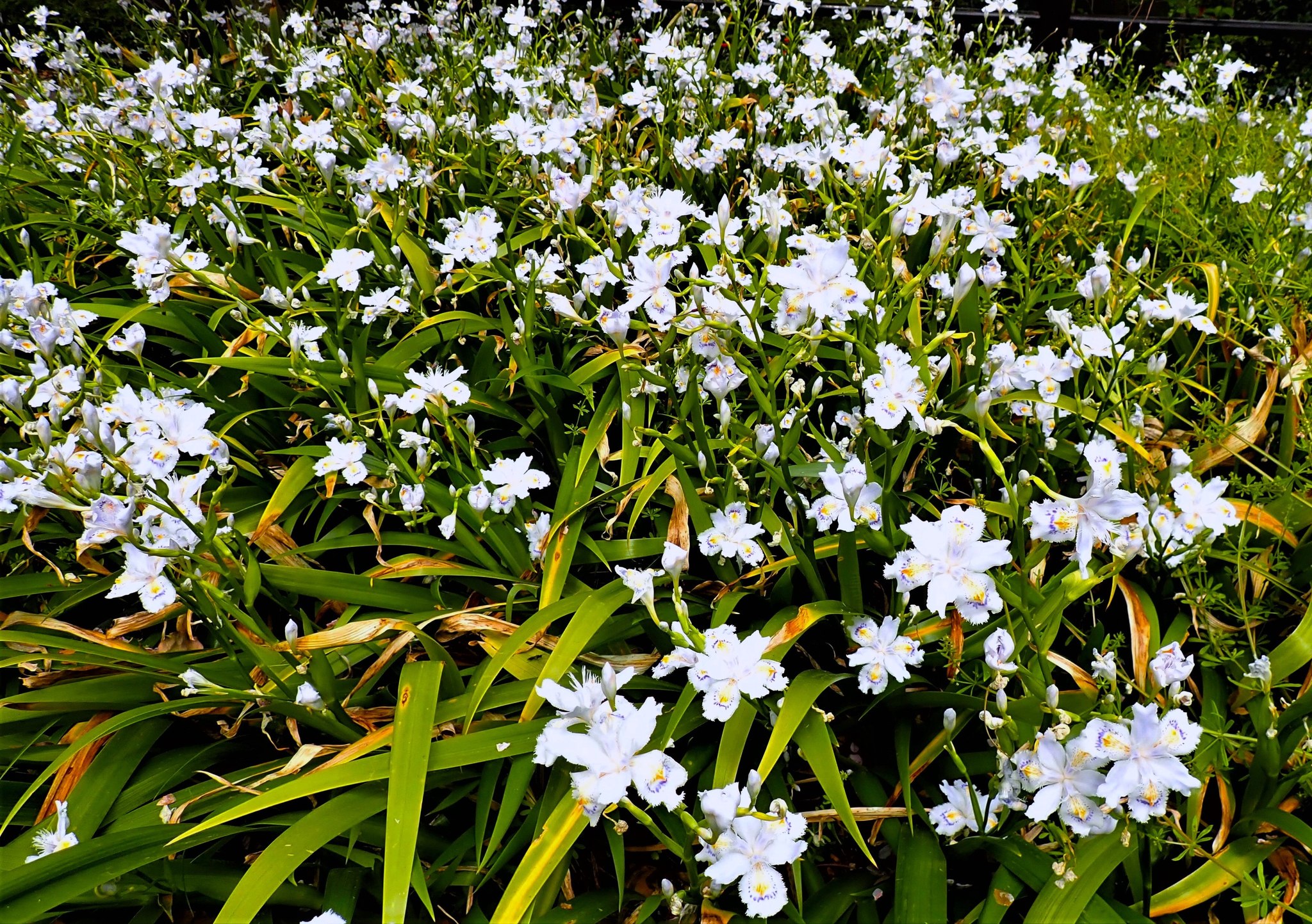 シャガの名前はヒオウギ(檜扇)の漢名「射干」を日本語読みしたものといわれ、葉がヒオウギに似ているところから間違って名付けられたという説があります。