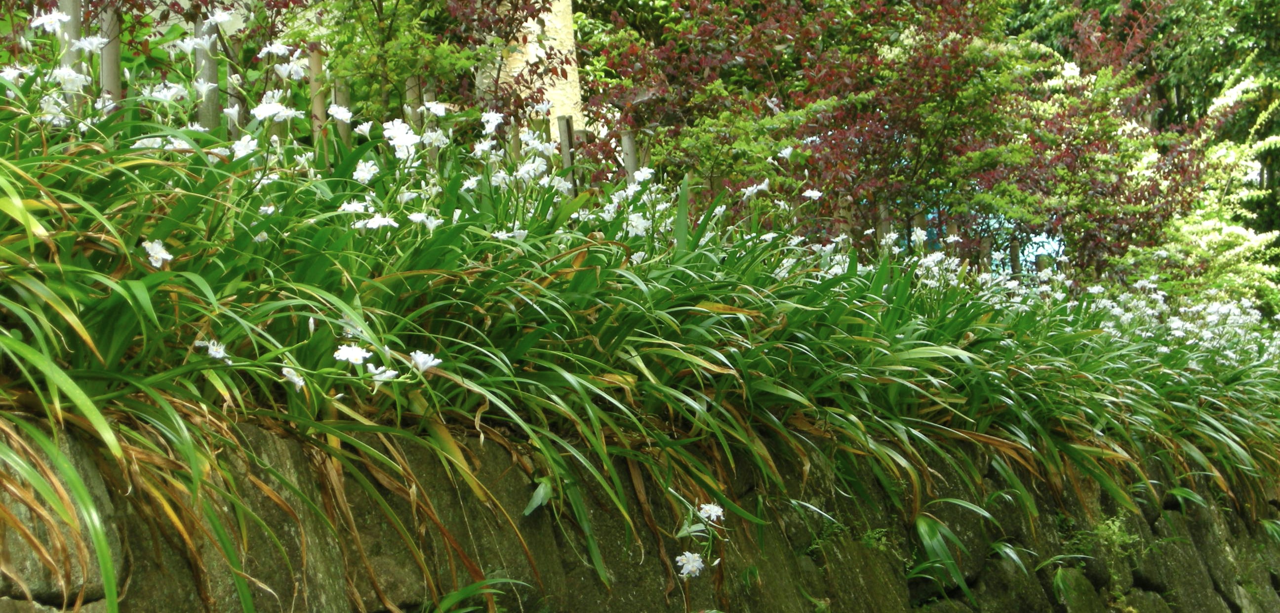 中国では結実するものもあるようですが、日本で生育しているシャガは結実しません。根茎から長い匍匐枝(ほふくし)を伸ばして繁殖します。種子繫殖ではありませんので、繁殖は人為的に移動させたと考えられています。したがって、シャガが繁殖しているところは、かつて人が住んでいたことがあると推察できます。