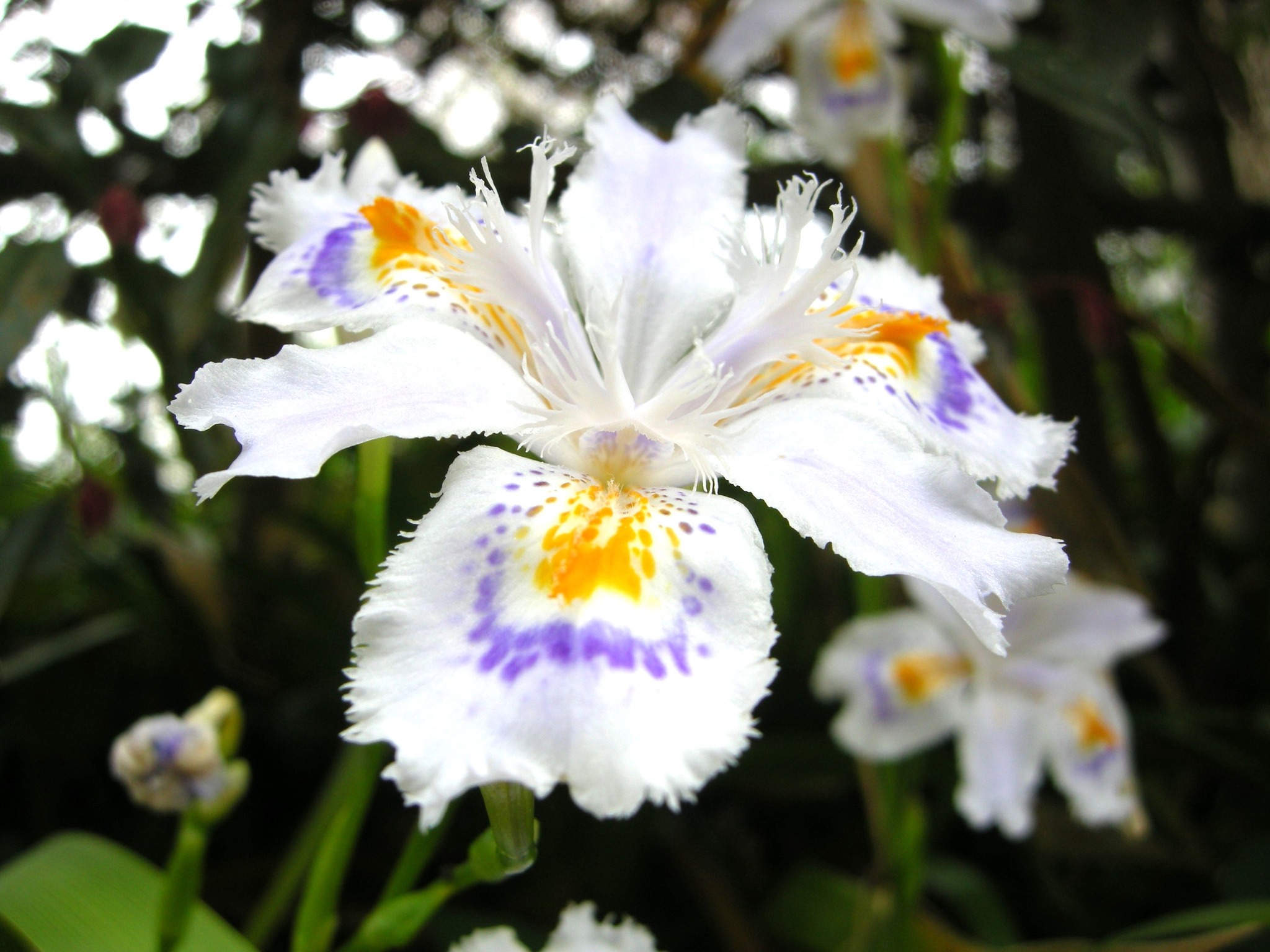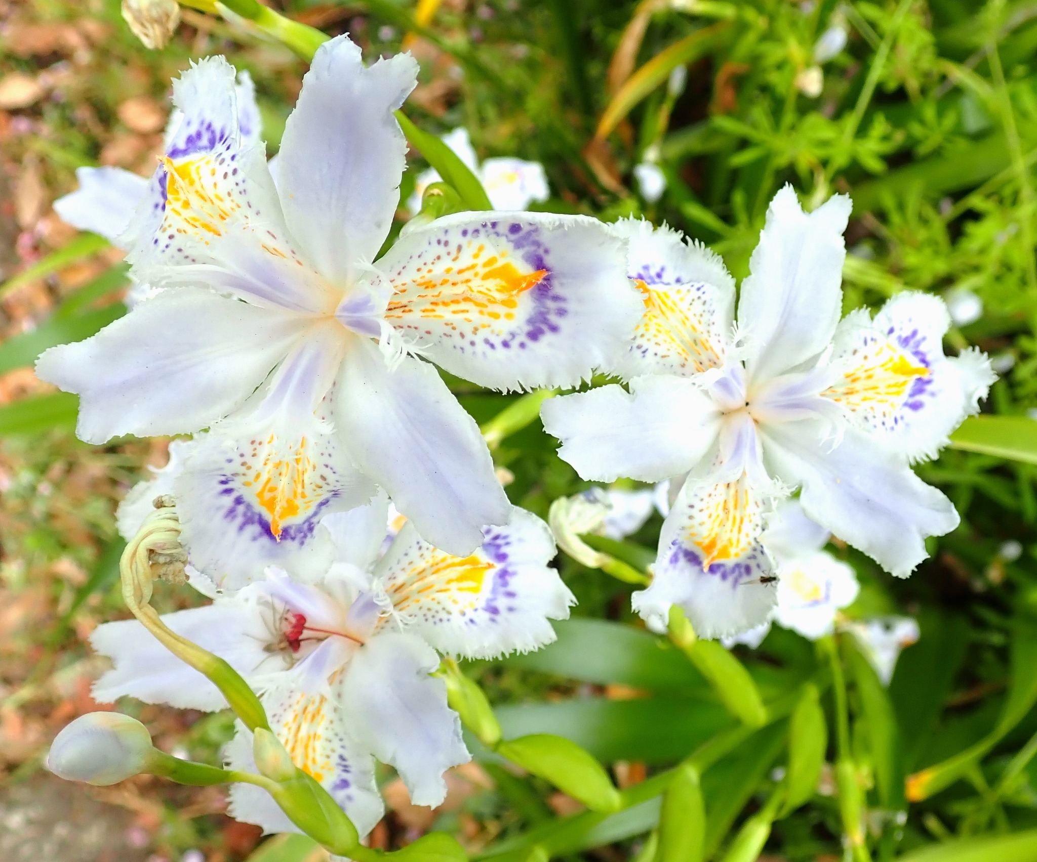 白地に黄橙色の斑点が入る花を多数咲かせます。斑点は虫を誘う目印、蜜標(ネクターガイド)と言われており、虫を誘います。蜜はないのですが、看板に騙される虫が出入りしています。