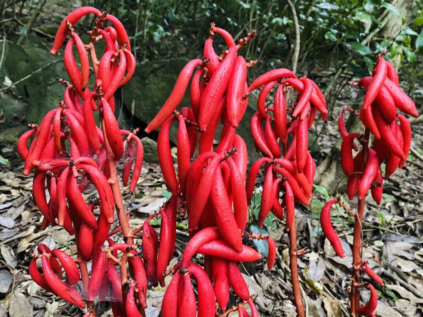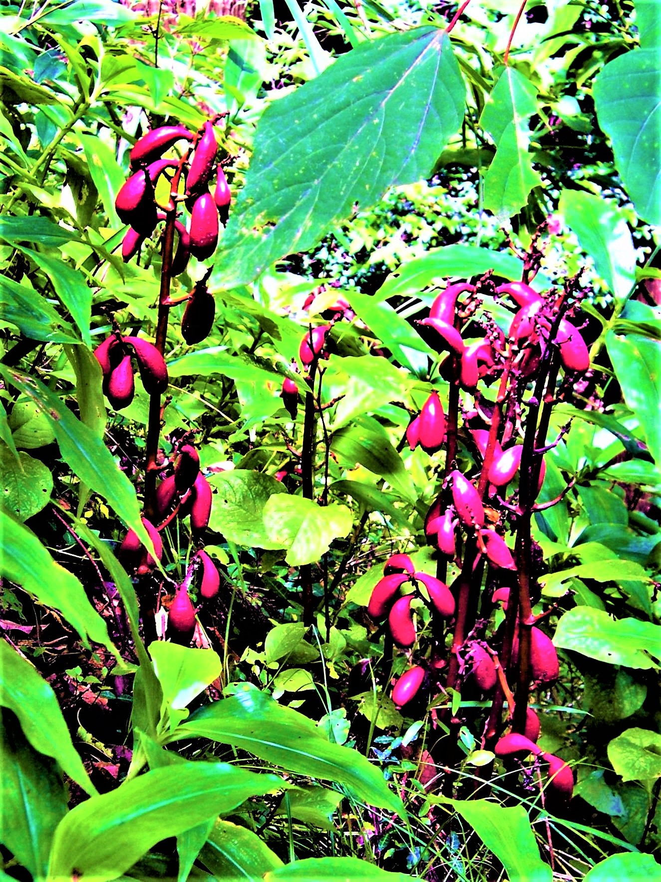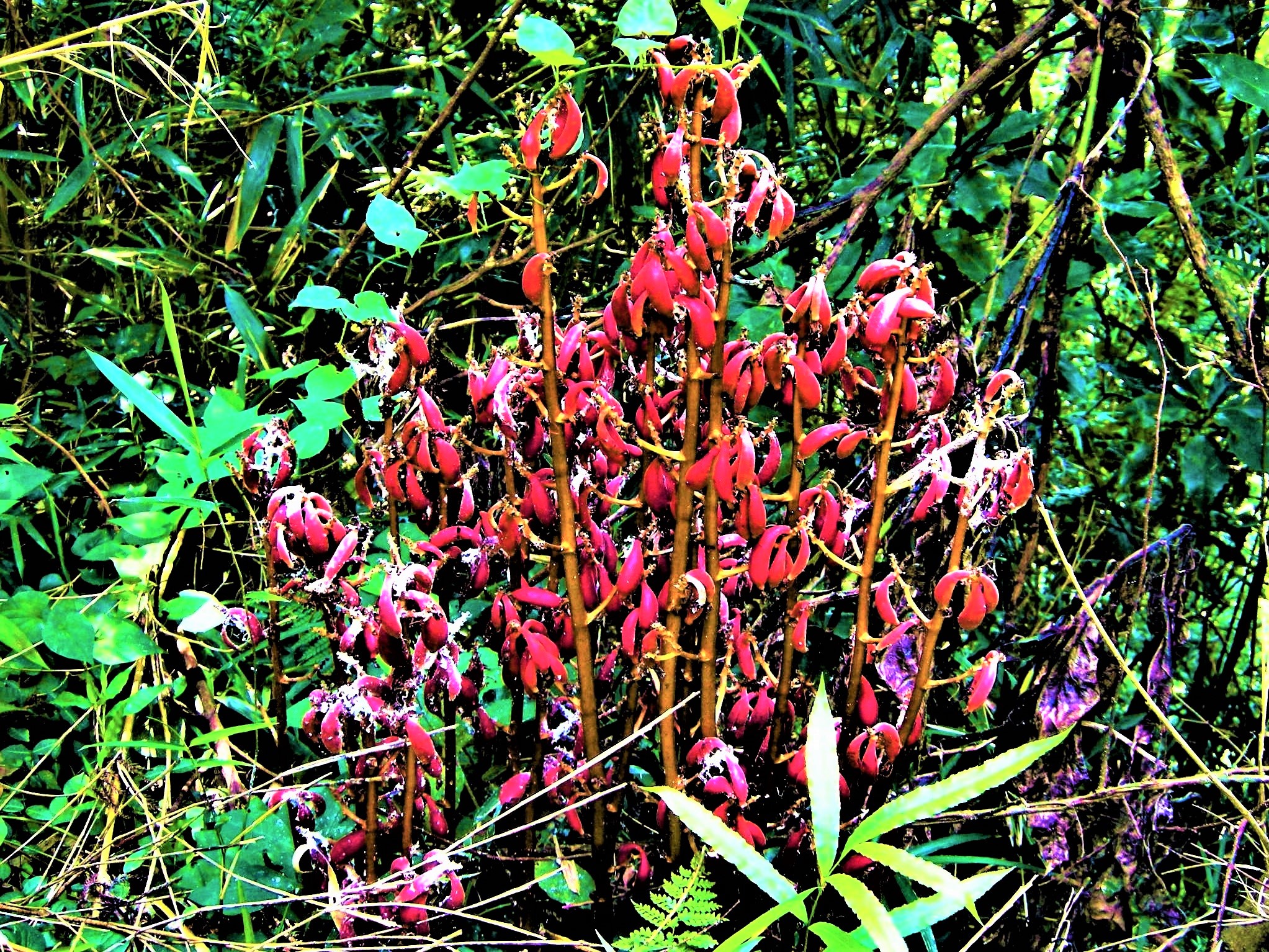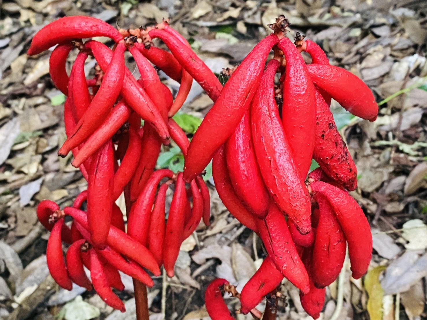 林の中で、真っ赤なウインナーソーセージが地面から生えている光景に巡り合うことがあります。ツチアケビの果実です。地面から生えるアケビの意ですが、ランの仲間で、アケビとの関りはなく、アケビのように果実が裂開することもありません。