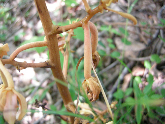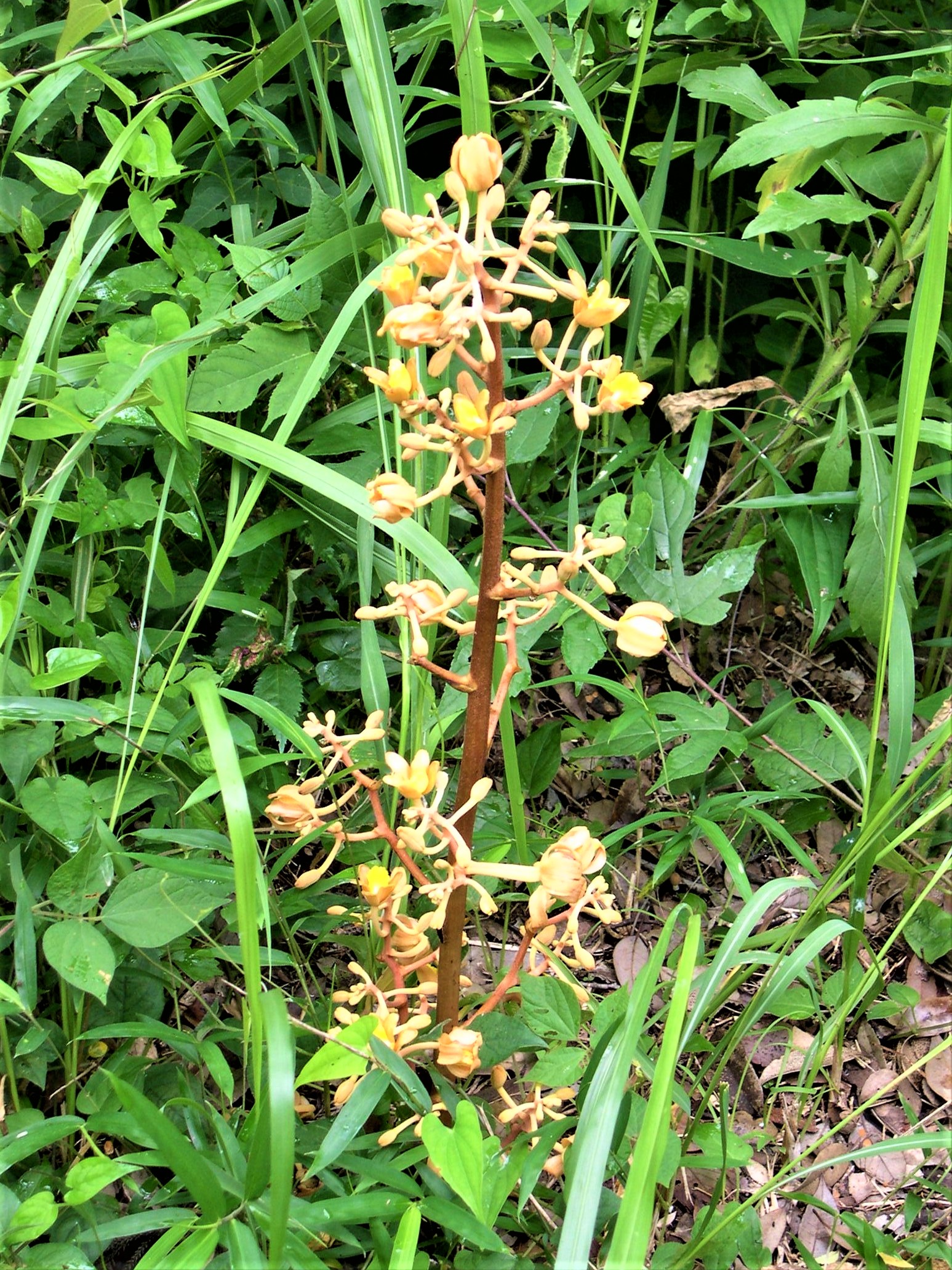 初夏に咲く黄色の花も含めて、自らは葉緑体を持たず、共生するナラタケ(菌類)から全ての栄養をもらって生きている植物です。太い根にナラタケの菌糸を誘い込み、その菌糸をも消化して育ちます。“頼りなさそうに装って、全ての栄養をもらう居候生活”などと表現されることもあります。